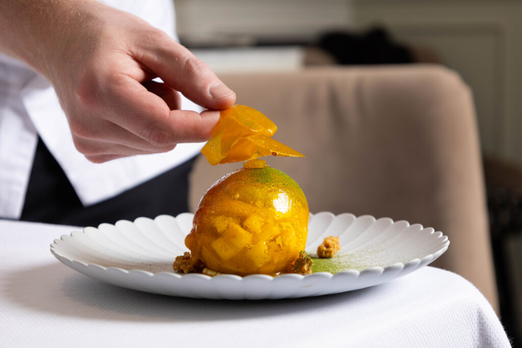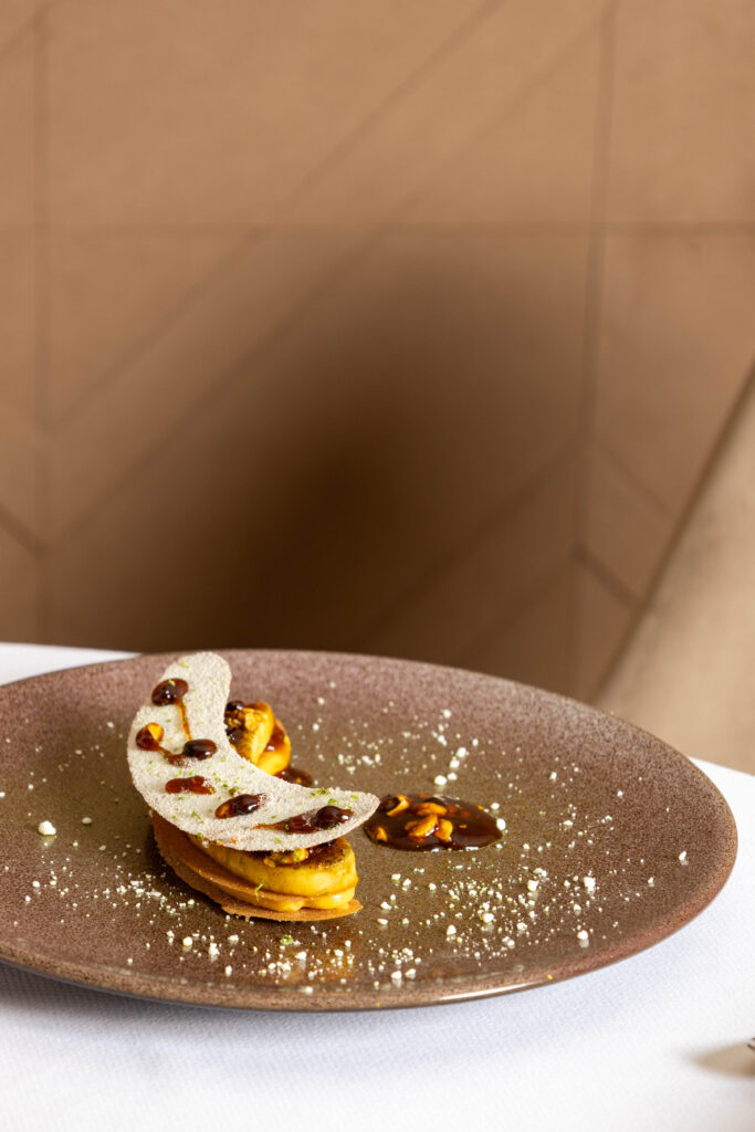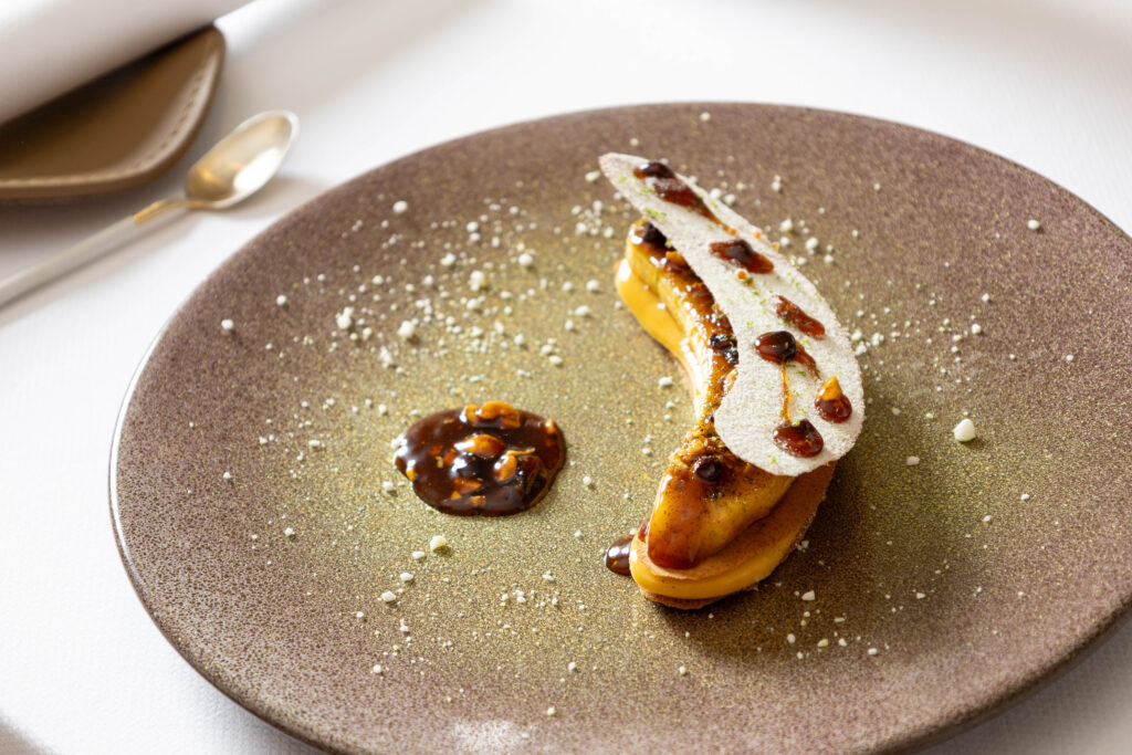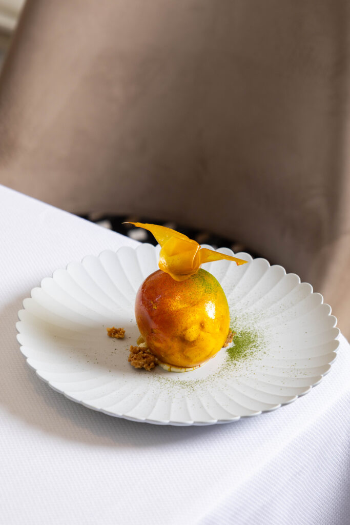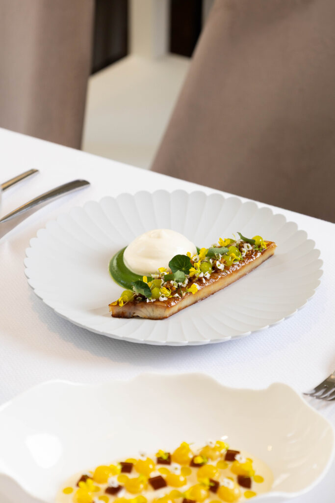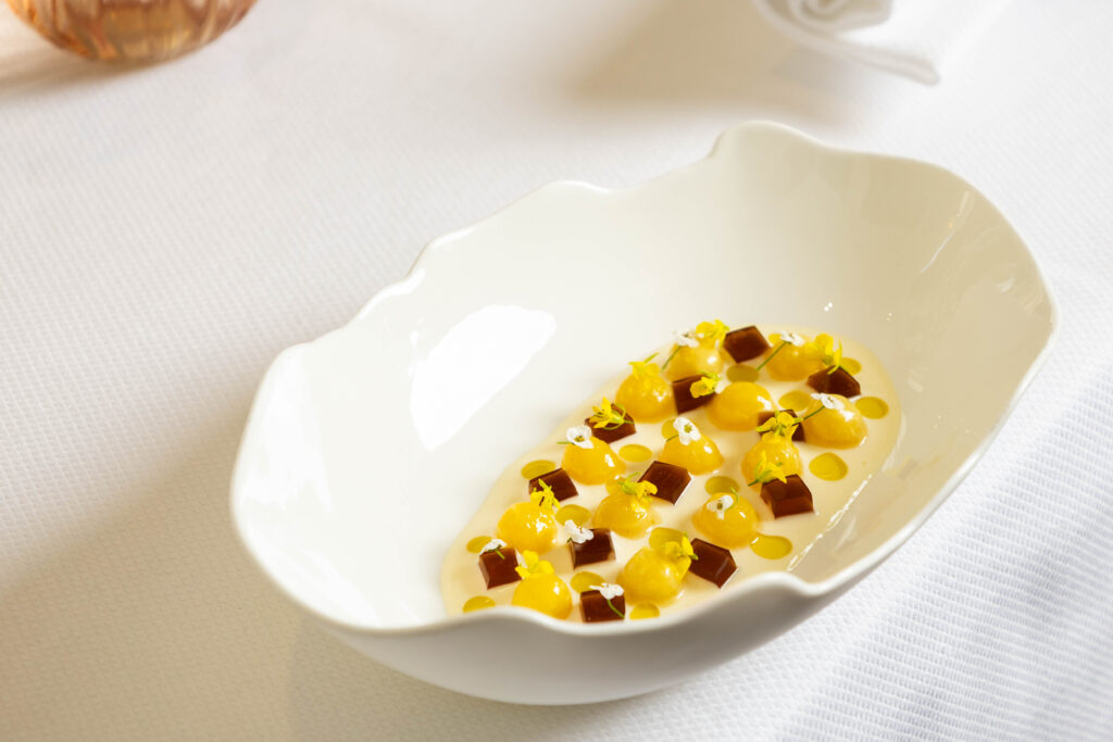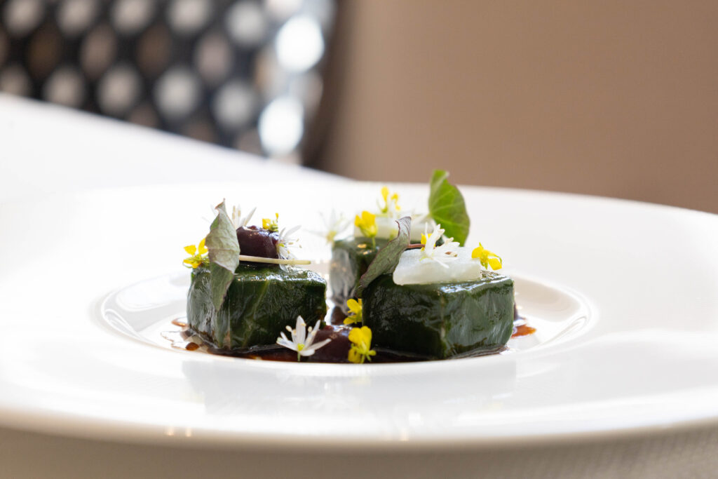 Signature de l’été : le tourteau de Roscoff en feuille de daïkon imprimé, relevé d’un condiment miel-xérès et perlé de tapioca au caviar impérial ; un exercice d’équilibre où la douceur iodée s’accorde à l’acidulé, la texture soyeuse au croquant . Plus terrien, le lapin Rex du Poitou rôti, jus de thym serpolet fumé au bois de baies, s’entoure de romaine croustillante, maïs, raisin blond et jalapeños doux — terroir et inventivité jouent en polyphonie . Chaque plat célèbre un réseau de producteurs d’exception — Compagnie de Bouteville pour le vinaigre, Tahiti Vanille, truffières Louis Pradel — souvent labellisés Bleu-Blanc-Cœur, gage de pratiques durables .