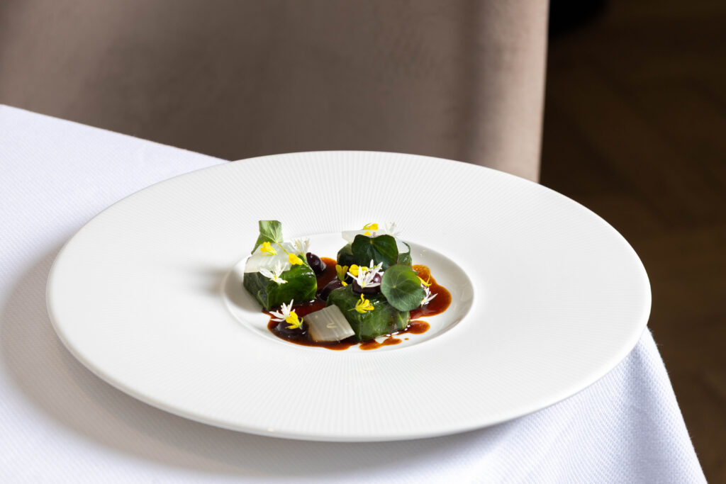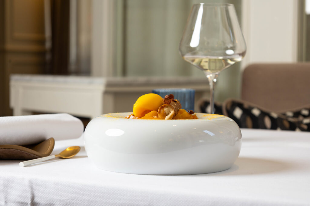 Il y a des tables qui chuchotent plus qu’elles ne crient. Une respiration feutrée s’est glissée au 25, rue Bayen : sous les plafonds ivoire et les boiseries blondes, la cuisine visible de Frédéric Simonin dialogue avec la salle comme un ballet discret. Tout ici prêche la retenue élégante : 36 couverts, lumière naturelle, miroirs biseautés, atmosphère où le confort l’emporte sur la démonstration. Une scénographie pensée pour qu’on écoute la cuisine plutôt que le décor. « Il faut de l’expérience, de la technique, mais surtout de l’honnêteté » confie le chef, fidèle à un credo d’épure et d’émotion .