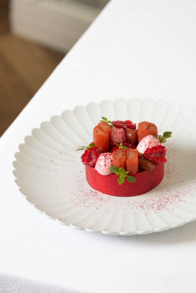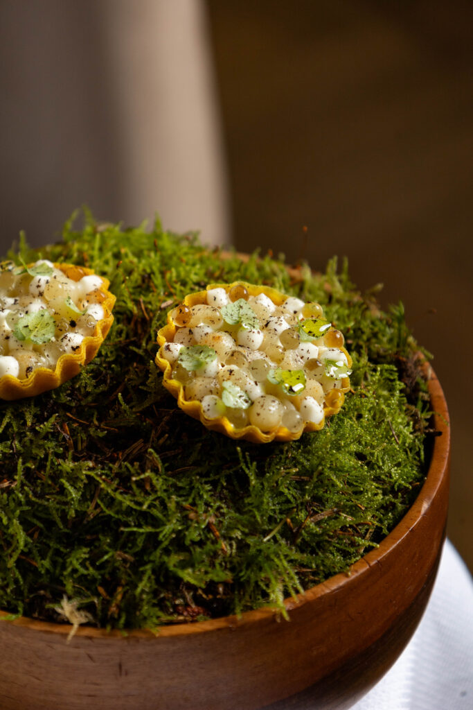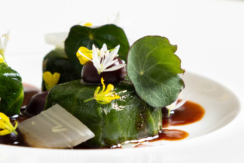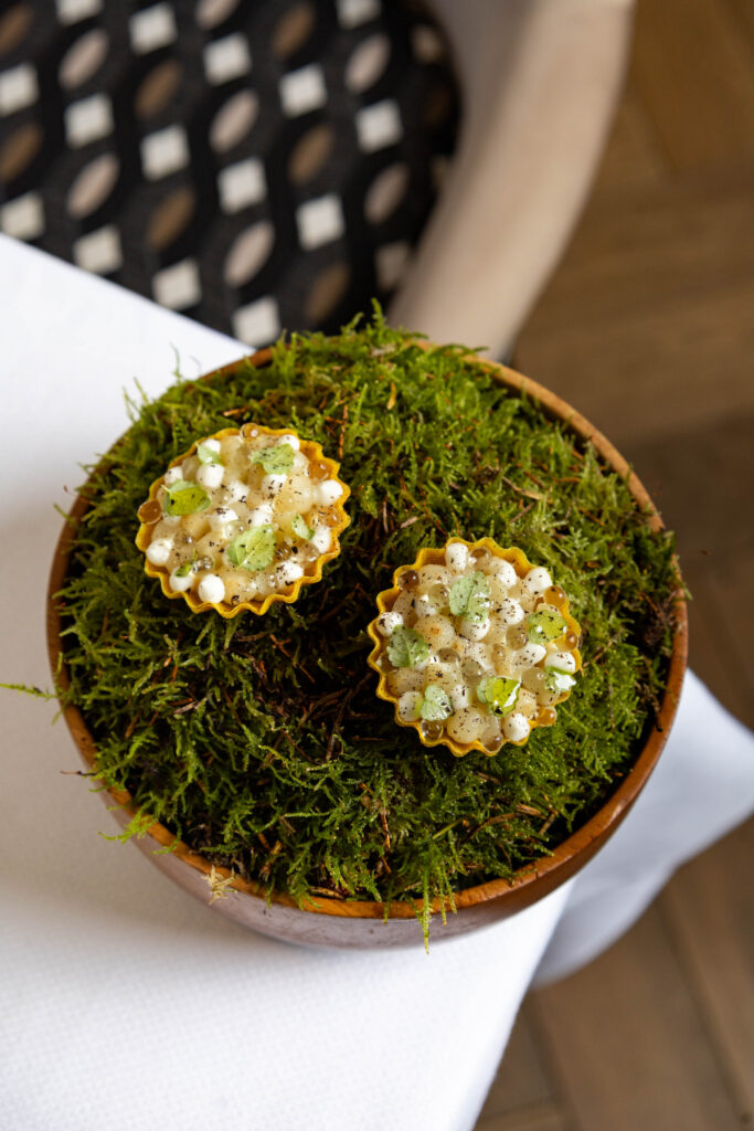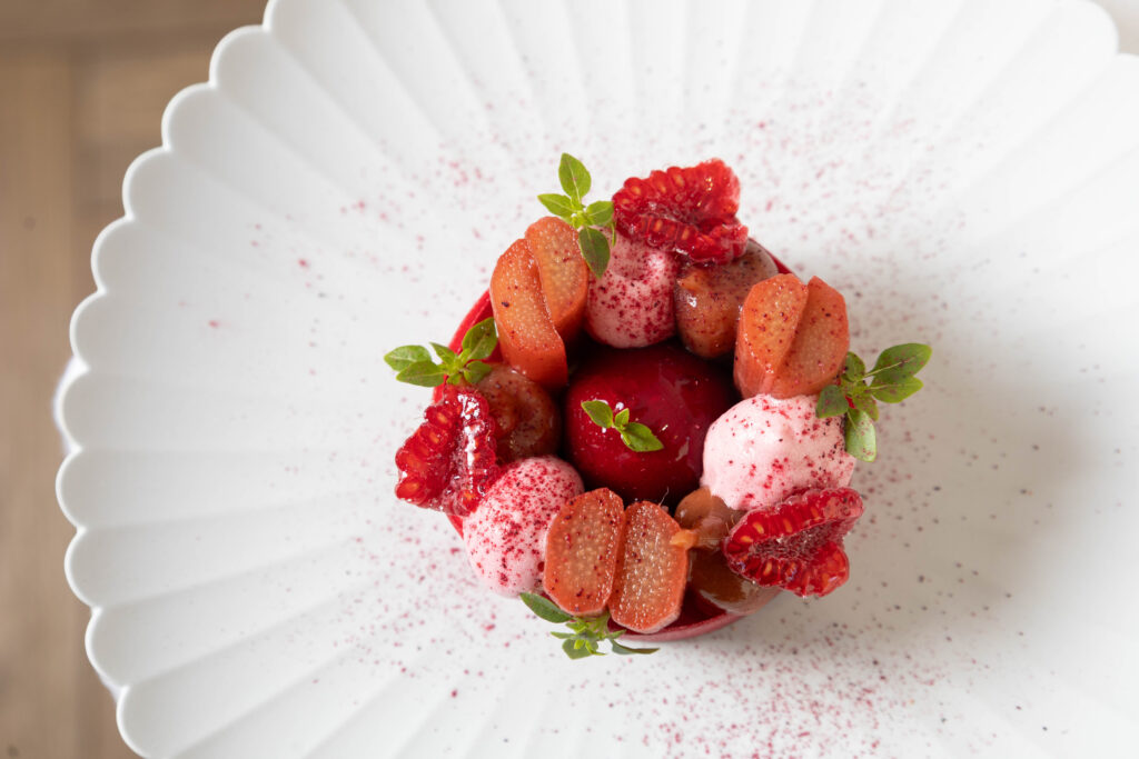 - Tomates cerises marinées : passées au chalumeau, puis plongées 24 h dans un sirop hibiscus-gingembre – résultat : un pickle chic, presque japonisant.