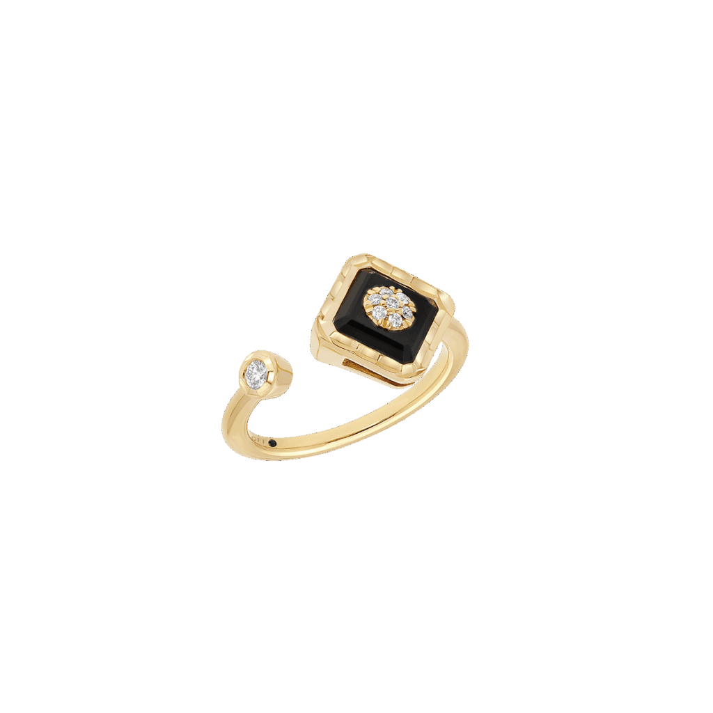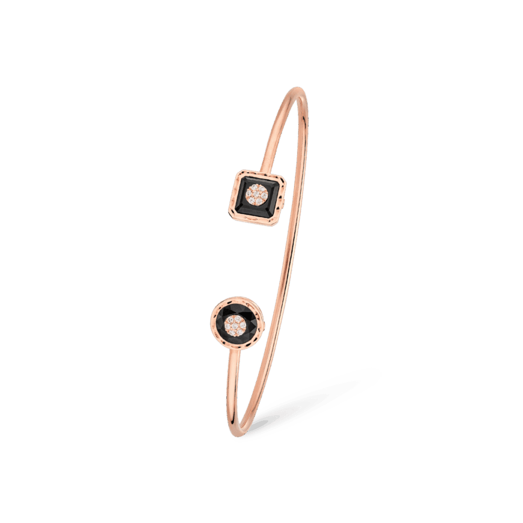 Cercles et carrés dialoguent sans hiérarchie ; les volumes s’assemblent, se désassemblent, se superposent. Les singles earrings — vendues à l’unité — revendiquent l’oreille dépareillée, clin d’œil à celles et ceux qui préfèrent la dissonance chic à l’harmonie convenue. Joncs et bagues Toi & Moi s’accumulent en arabesques chromatiques, dans un jeu de textures polies ou satinées qui réinvente la notion de stack.