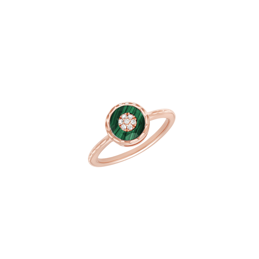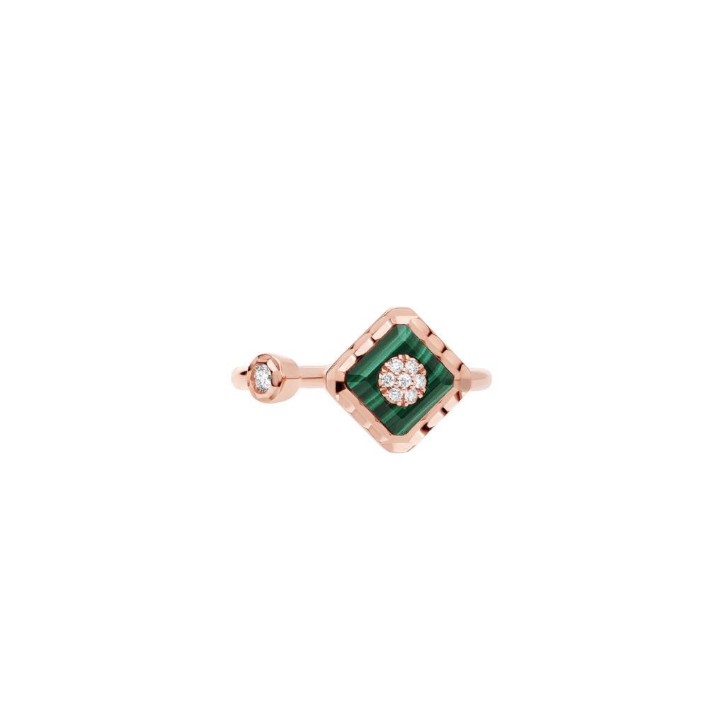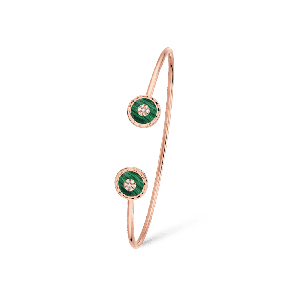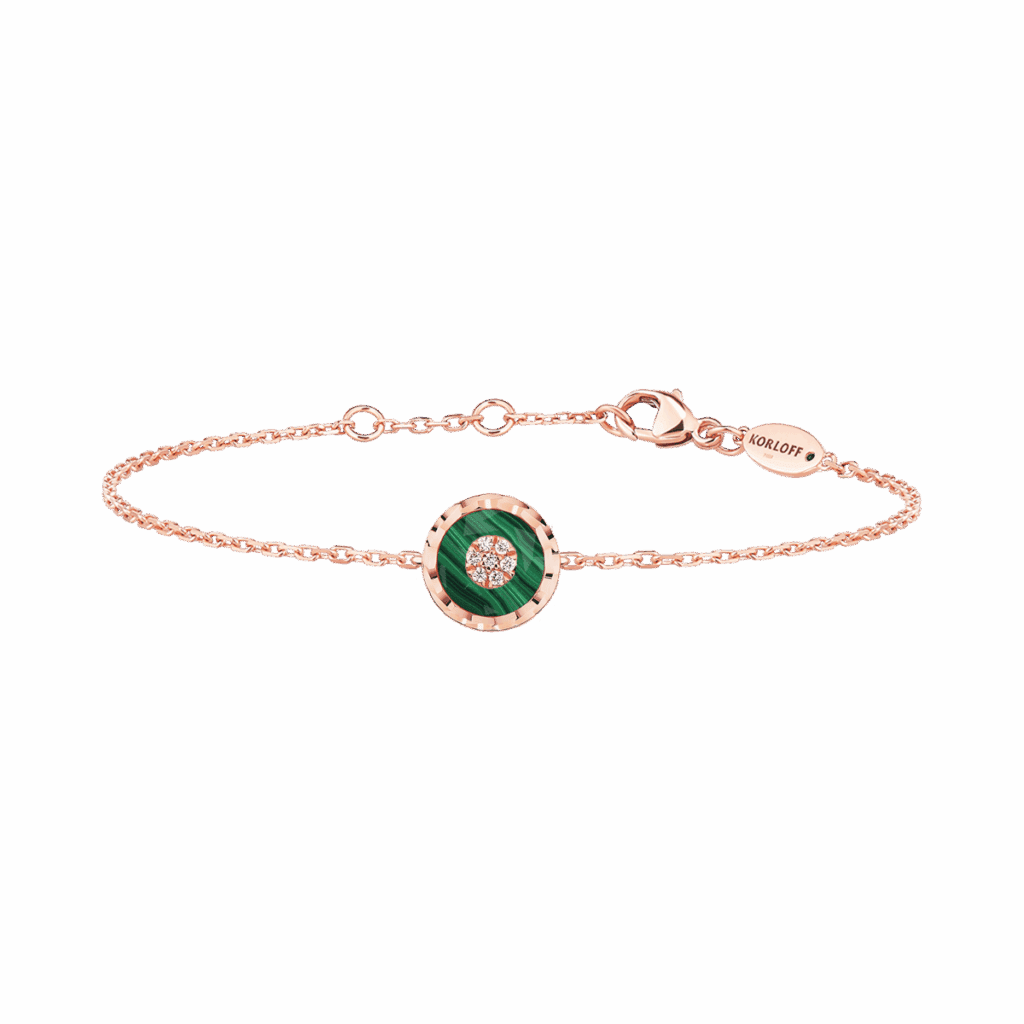 Enracinée dans la joaillerie Art déco, la malachite déploie ses veines hypnotiques ; la turquoise, pierre solaire par excellence, apporte une clarté pop. Korloff les associe à l’or poli comme à l’or brossé, créant des pièces où la pierre n’orne pas l’objet : elle le commande, impose son rythme, déclenche la narration chromatique.