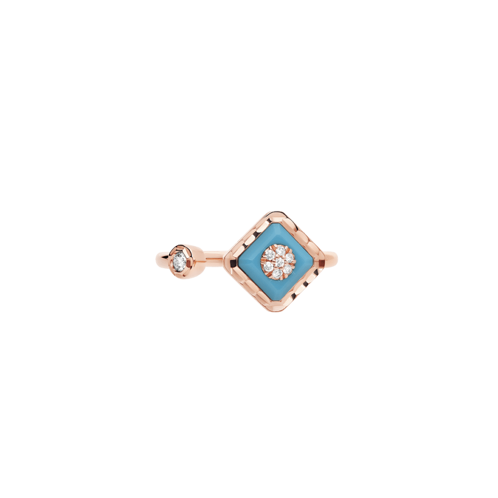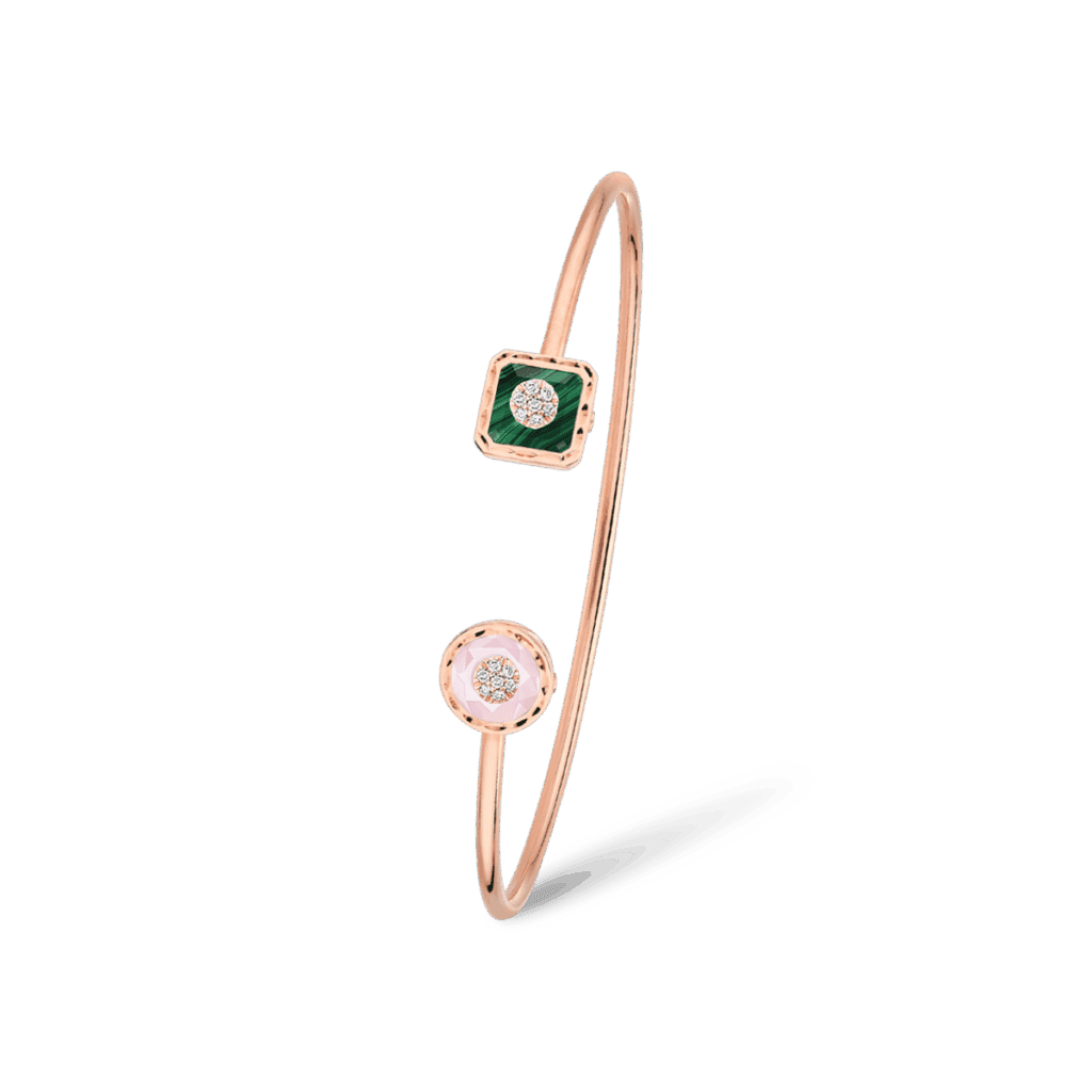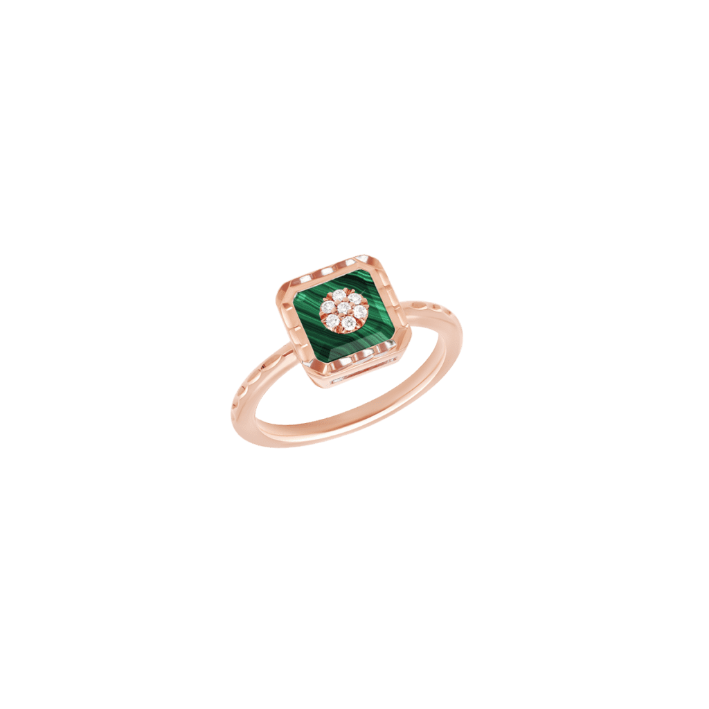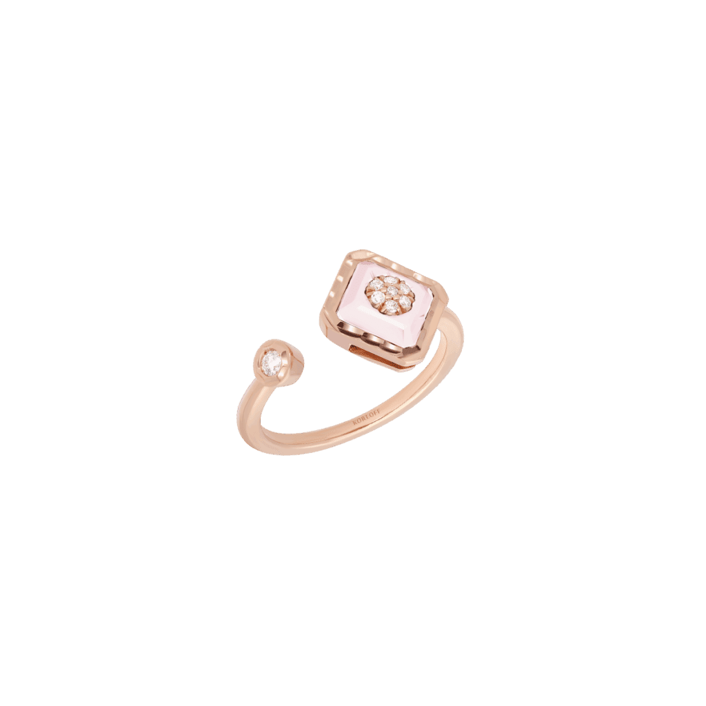 Enracinée dans la joaillerie Art déco, la malachite déploie ses veines hypnotiques ; la turquoise, pierre solaire par excellence, apporte une clarté pop. Korloff les associe à l’or poli comme à l’or brossé, créant des pièces où la pierre n’orne pas l’objet : elle le commande, impose son rythme, déclenche la narration chromatique.