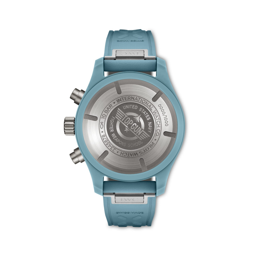 À l’intérieur bat le calibre 69380, mouvement chronographe à roue à colonnes, conçu pour allier robustesse, fiabilité et lisibilité extrême — les minutes chronométrées étant positionnées à midi pour une lecture intuitive. Le fond en titane gravé du logo TOP GUN, protégé par une boîte interne en fer doux, garantit également une résistance antimagnétique.