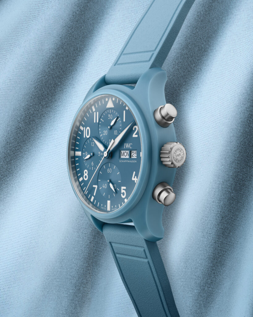 Inspirée des t-shirts portés sous les combinaisons de vol des pilotes TOP GUN, cette nuance bleu clair se décline en une boîte en céramique, un cadran assorti et un bracelet en caoutchouc bleu ciel, fusionnant dans une harmonie visuelle à la fois technique et poétique. La complexité de fabrication de cette céramique colorée réside dans la précision des oxydes métalliques utilisés, maîtrisés ici avec un raffinement rare par les ingénieurs IWC.