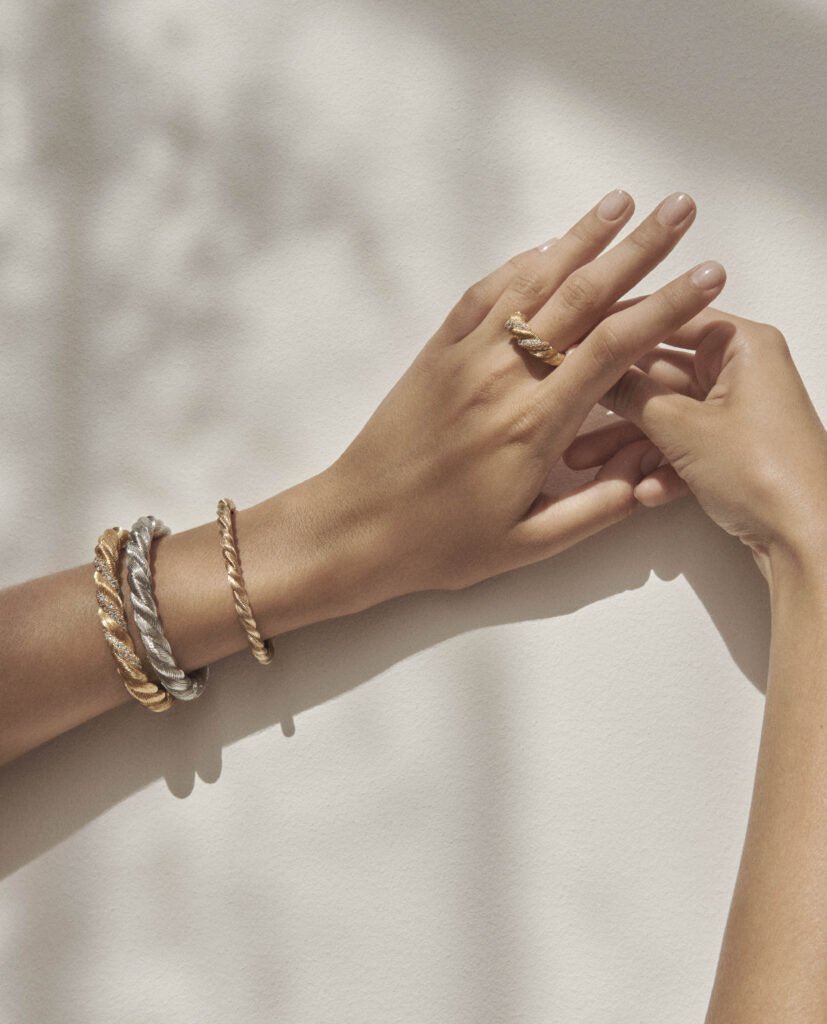 Depuis 1975, Poiray revendique une féminité libre et joyeuse, traduite en codes Art déco assouplis : bracelets Ma Première à cadrans interchangeables, bagues Cœur Entrelacé ou Tresse, autant de pièces complices qui s’ajustent au rythme de vie contemporain. L’adresse new-yorkaise prolonge cette vision : élégance souple, jeux de couleur et de lumière, modularité.