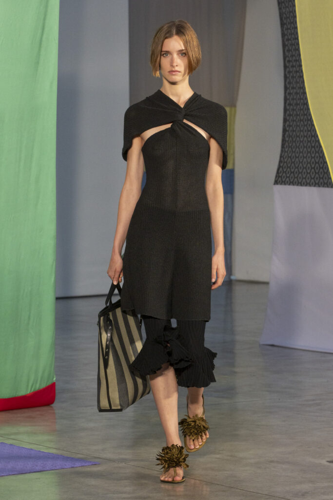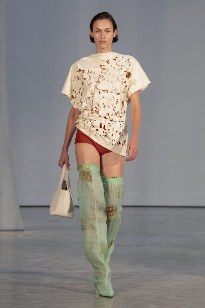 Les robes en noir et vert « seaglass » se drapent spontanément, imprimées de motifs de chrysanthème comme aperçus à travers un verre, instables, diffractés par la lumière. Les étoffes se froissent et s’effilochent, portant en elles la mémoire du passé. À travers ce paysage mouvant, l’intime se devine : un sandale en fourrure, une botte cuissarde en organza translucide, un short tricoté qui dévoile la peau.