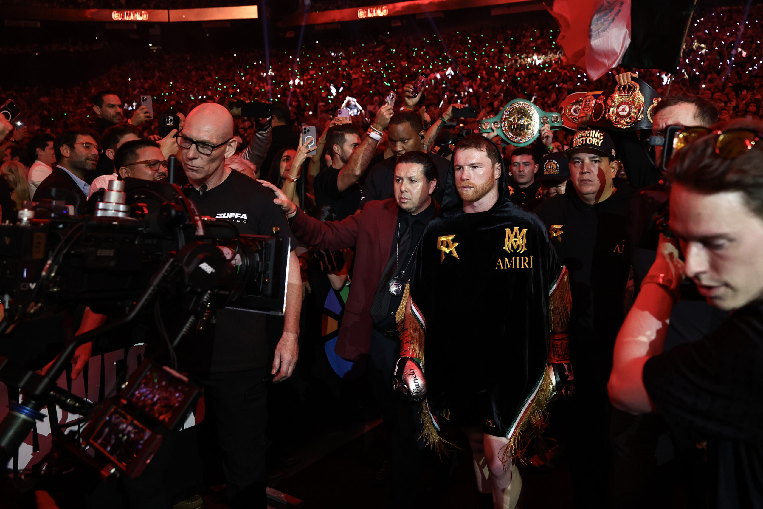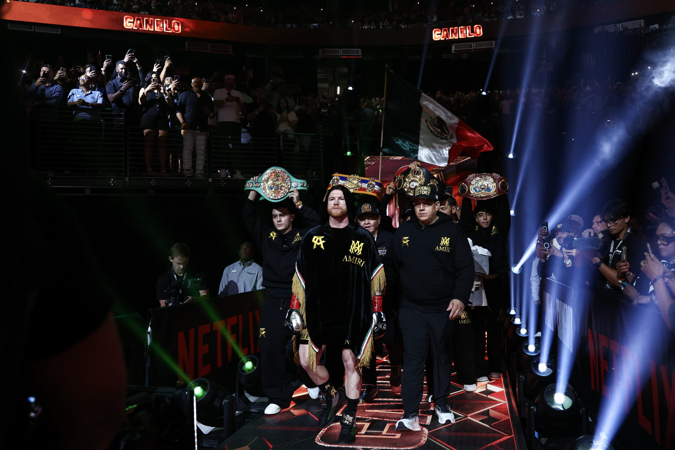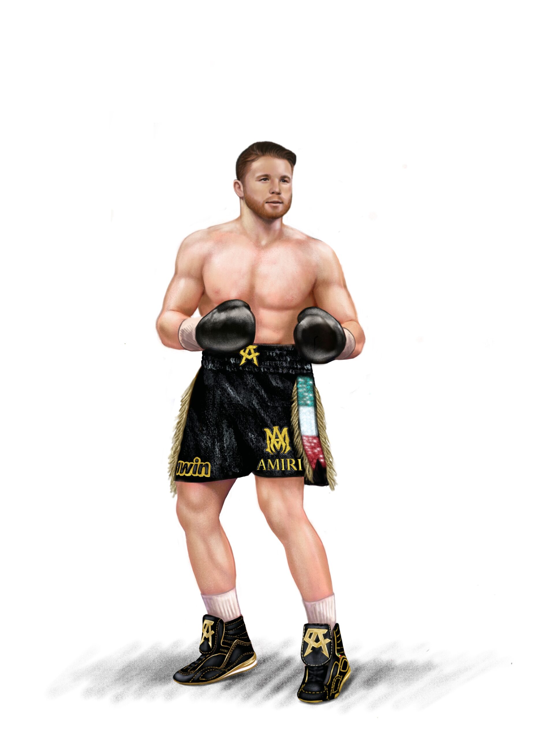 - Pour la pesée, Canelo portait un sweat à capuche et un pantalon de survêtement customisés, ornés de son nom, de son insigne personnel et du monogramme MA d’AMIRI.