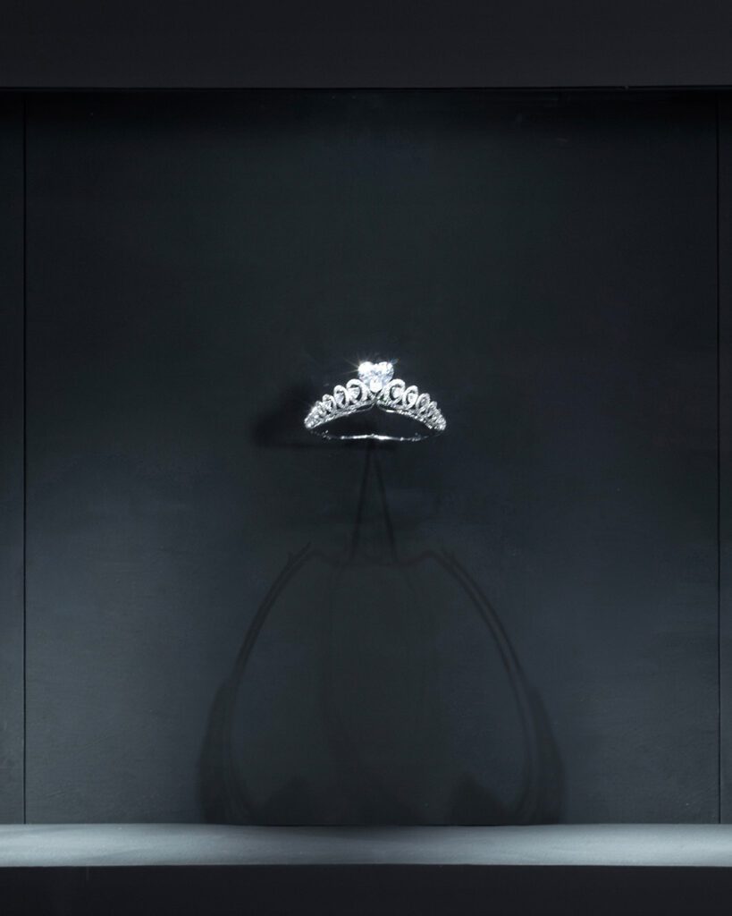 Pièce maîtresse de l’exposition, le diadème Infinity resplendit autour du diamant Infinity, un cœur de 157,80 carats, couleur D, clarté VVS1. Ce diamant hors norme, taillé à partir d’un brut de 373 carats extrait de la mine de Karowe au Botswana, figure parmi les plus grands diamants en forme de cœur jamais recensés. Ses contours révèlent une filiation saisissante avec le mythique Lesedi La Rona (1 109 ct), autre gemme historique acquise et taillée par Graff.