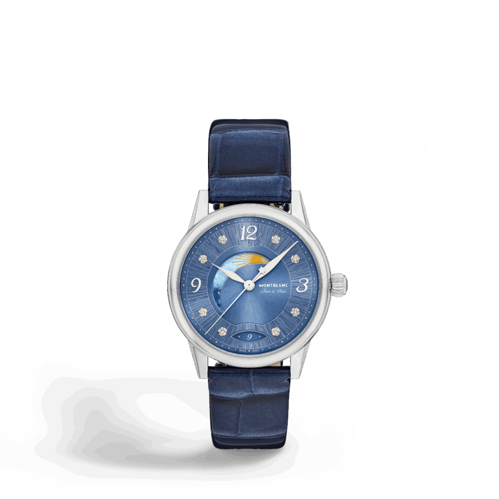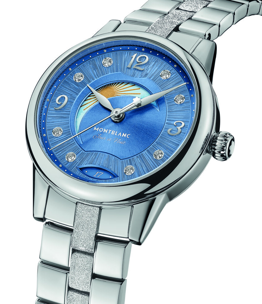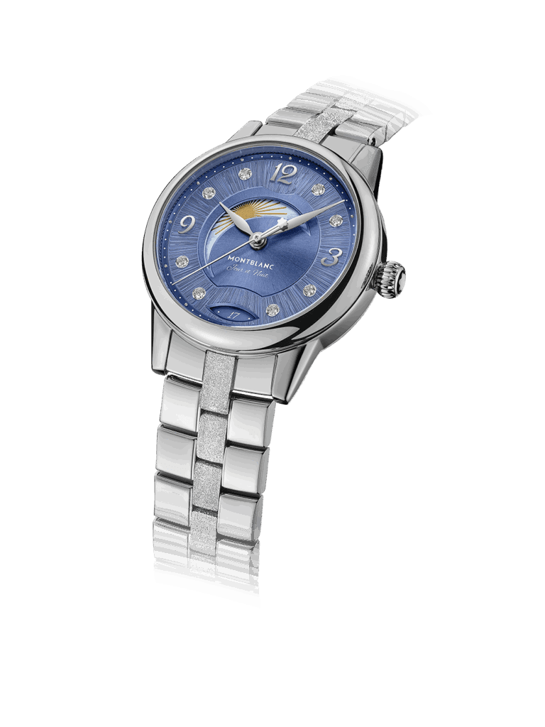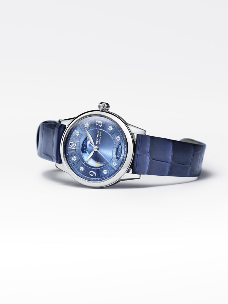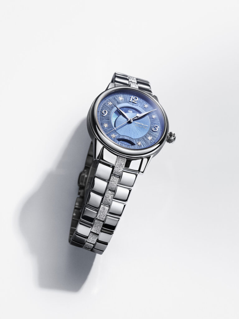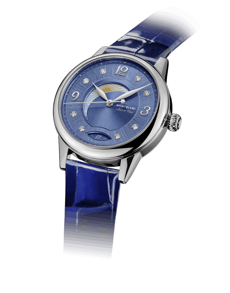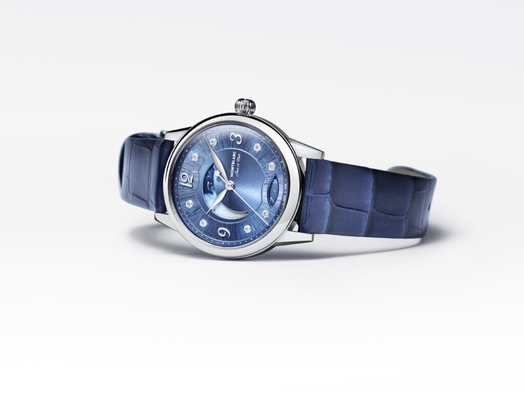 Mais c’est l’esthétique céleste qui émerveille. Le fond central en micro-diamants, recouvert d’un PVD effet métallisé, évoque un ciel nocturne scintillant. Autour, un cercle estampé en « filé d’étoiles » reproduit les traînées lumineuses d’un ciel capturé en pose longue. À 6h, la lune peinte en sérigraphie façon aquarelle s’anime au rythme des nuits, ajoutant une dimension onirique à la rigueur mécanique. La lunette, pavée de 60 diamants taille brillant, fait également office de minuterie, rappelant que chez Montblanc, le décor n’est jamais dénué de fonction.