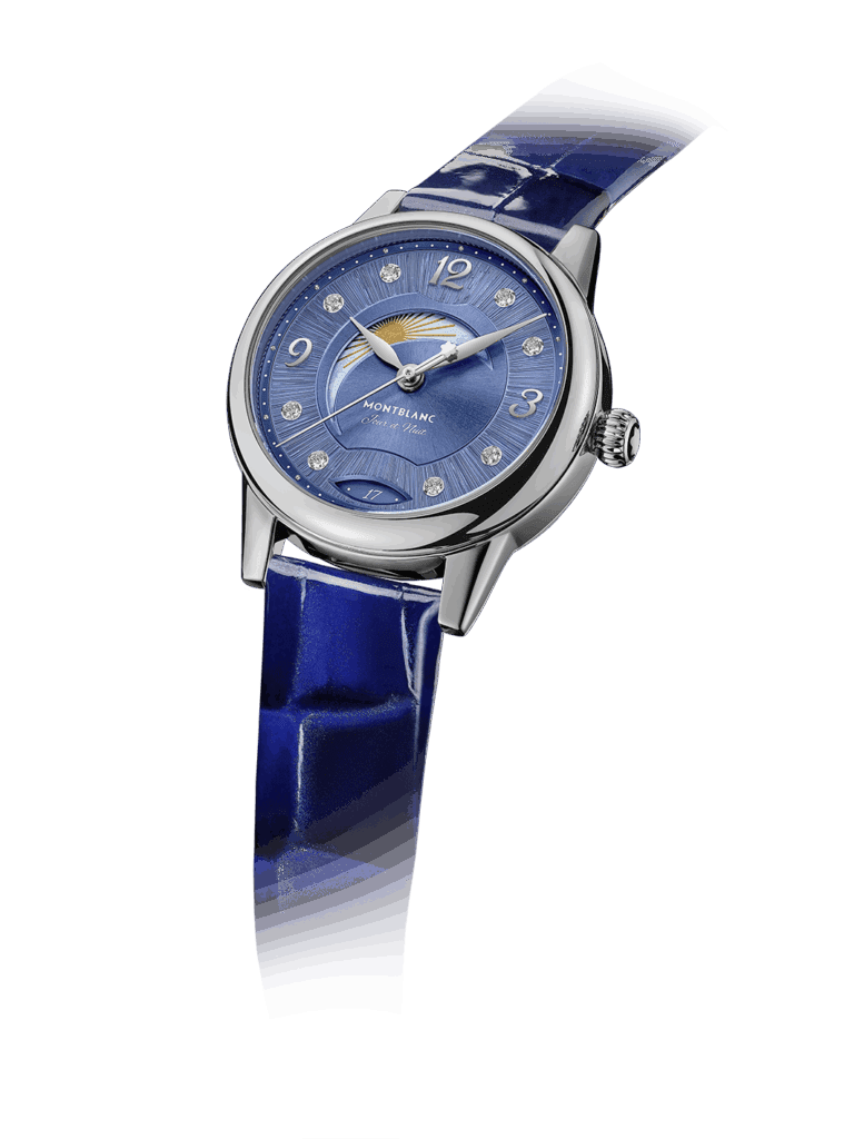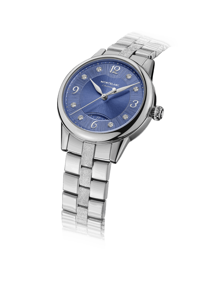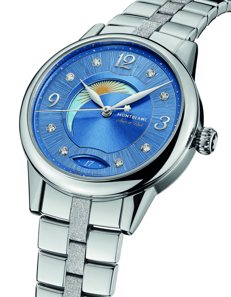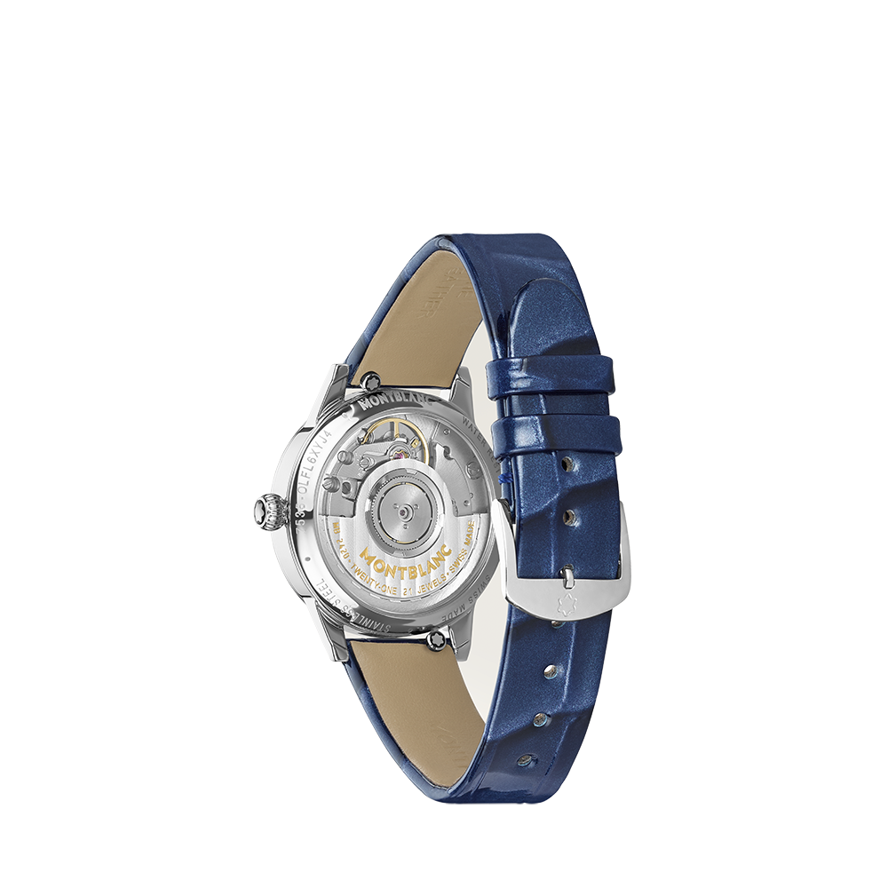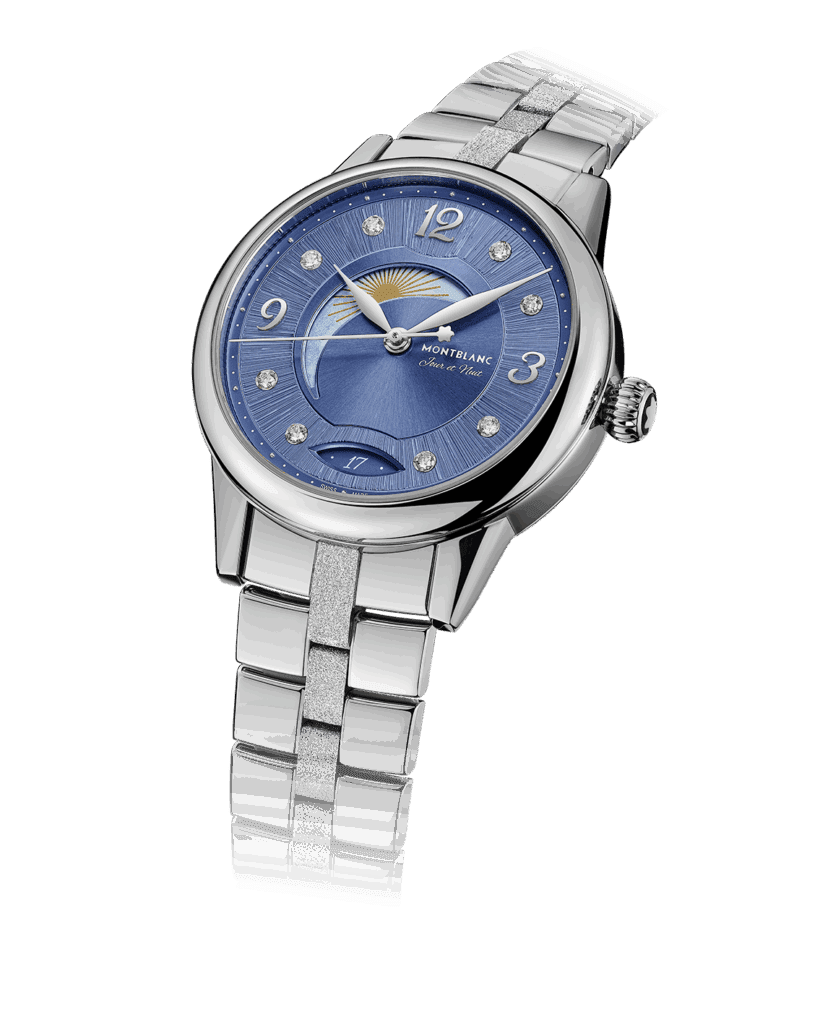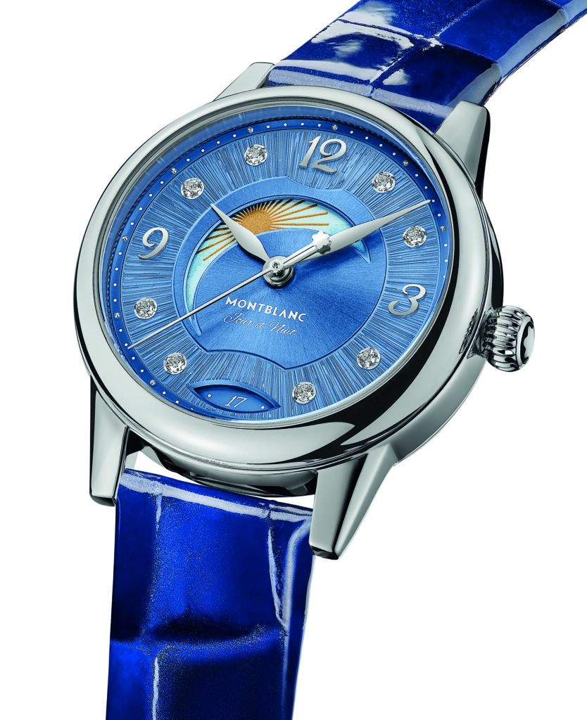 Mais c’est l’esthétique céleste qui émerveille. Le fond central en micro-diamants, recouvert d’un PVD effet métallisé, évoque un ciel nocturne scintillant. Autour, un cercle estampé en « filé d’étoiles » reproduit les traînées lumineuses d’un ciel capturé en pose longue. À 6h, la lune peinte en sérigraphie façon aquarelle s’anime au rythme des nuits, ajoutant une dimension onirique à la rigueur mécanique. La lunette, pavée de 60 diamants taille brillant, fait également office de minuterie, rappelant que chez Montblanc, le décor n’est jamais dénué de fonction.