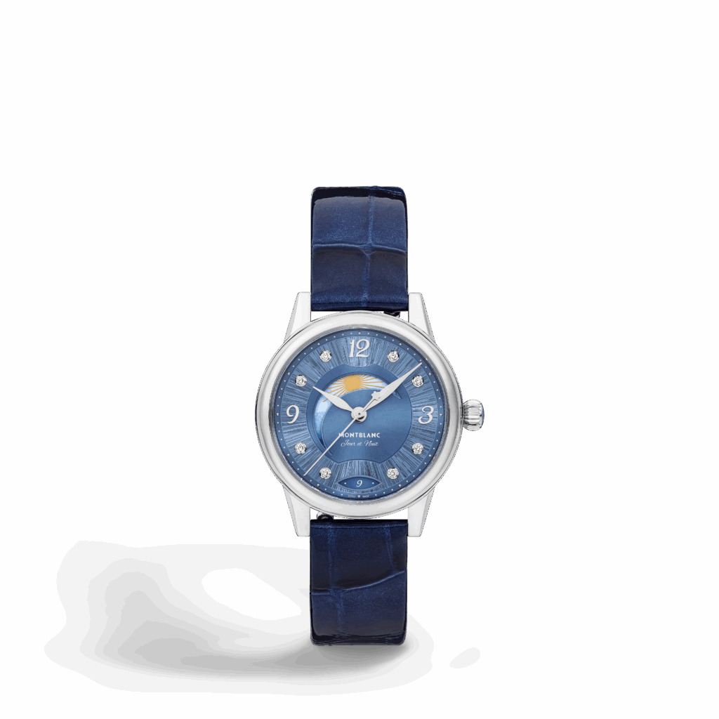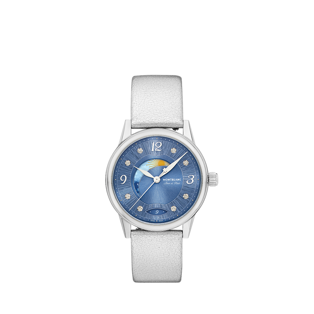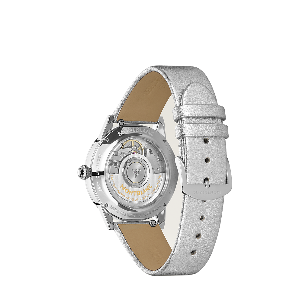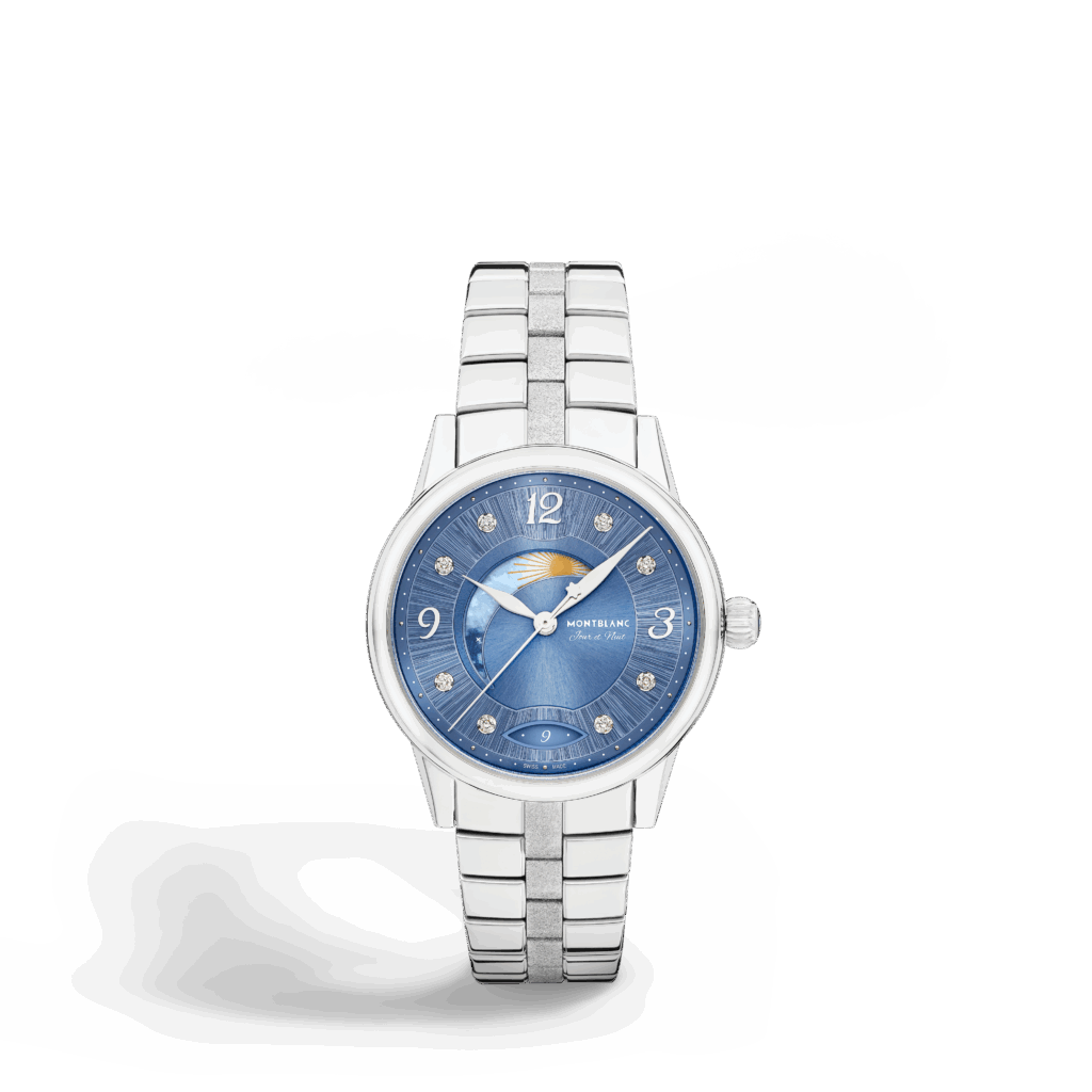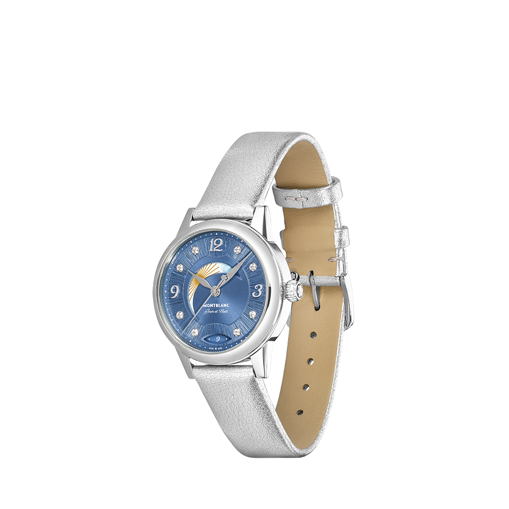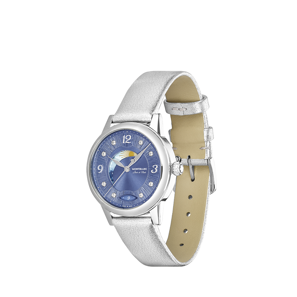 Mais c’est l’esthétique céleste qui émerveille. Le fond central en micro-diamants, recouvert d’un PVD effet métallisé, évoque un ciel nocturne scintillant. Autour, un cercle estampé en « filé d’étoiles » reproduit les traînées lumineuses d’un ciel capturé en pose longue. À 6h, la lune peinte en sérigraphie façon aquarelle s’anime au rythme des nuits, ajoutant une dimension onirique à la rigueur mécanique. La lunette, pavée de 60 diamants taille brillant, fait également office de minuterie, rappelant que chez Montblanc, le décor n’est jamais dénué de fonction.