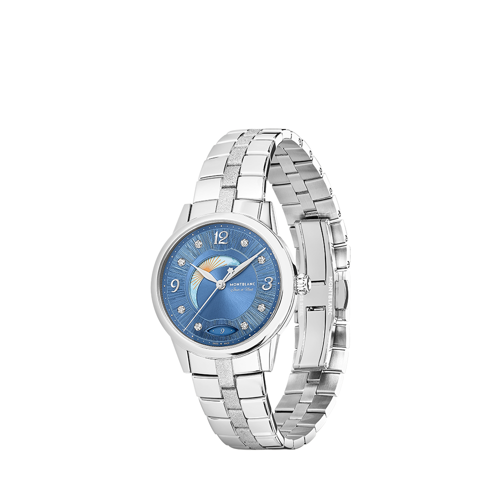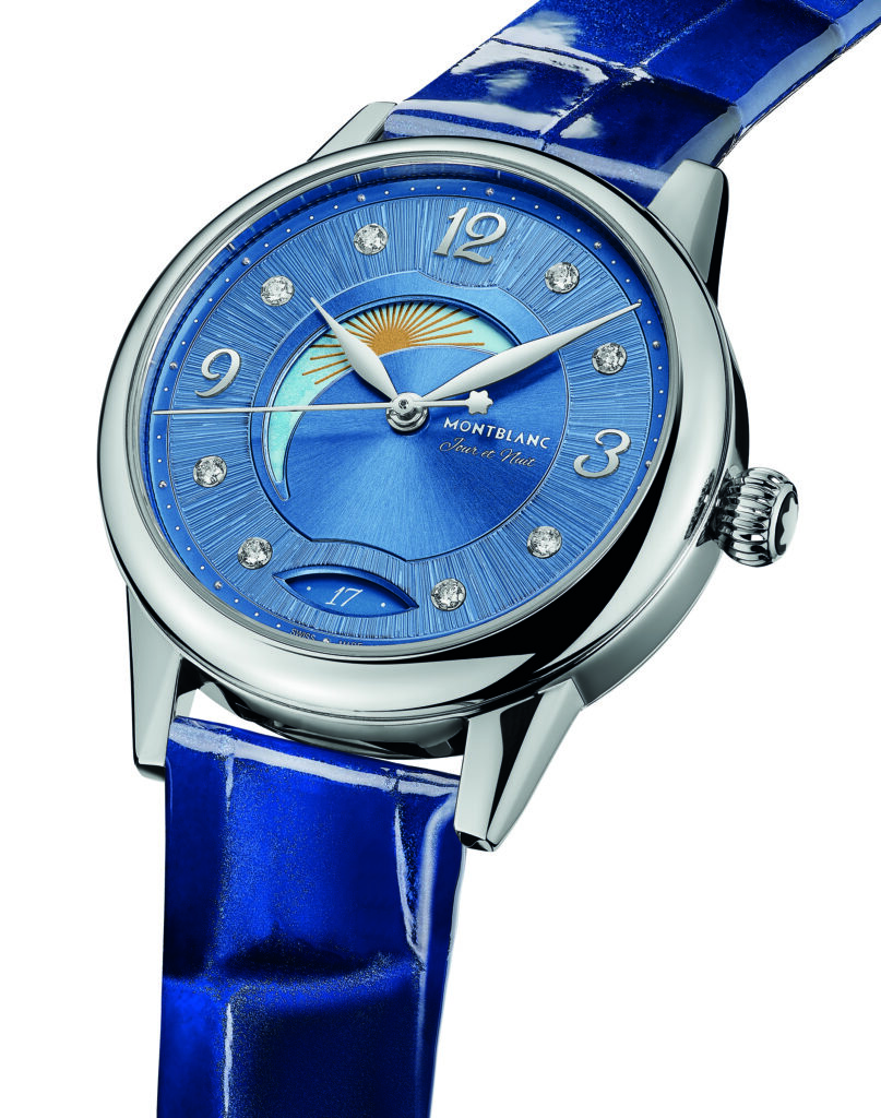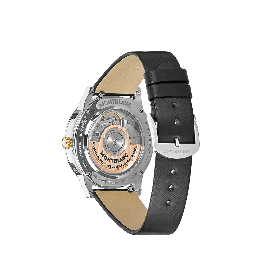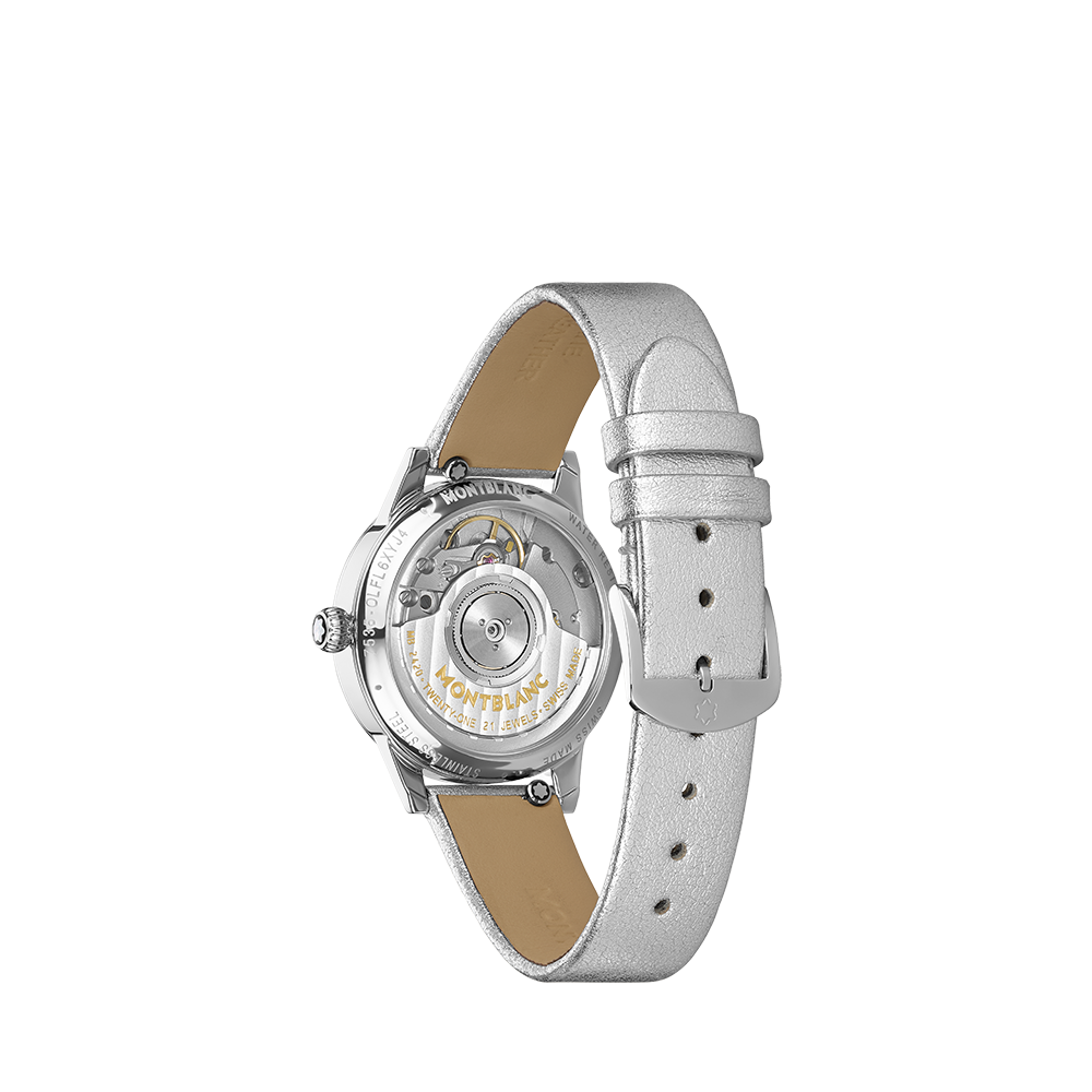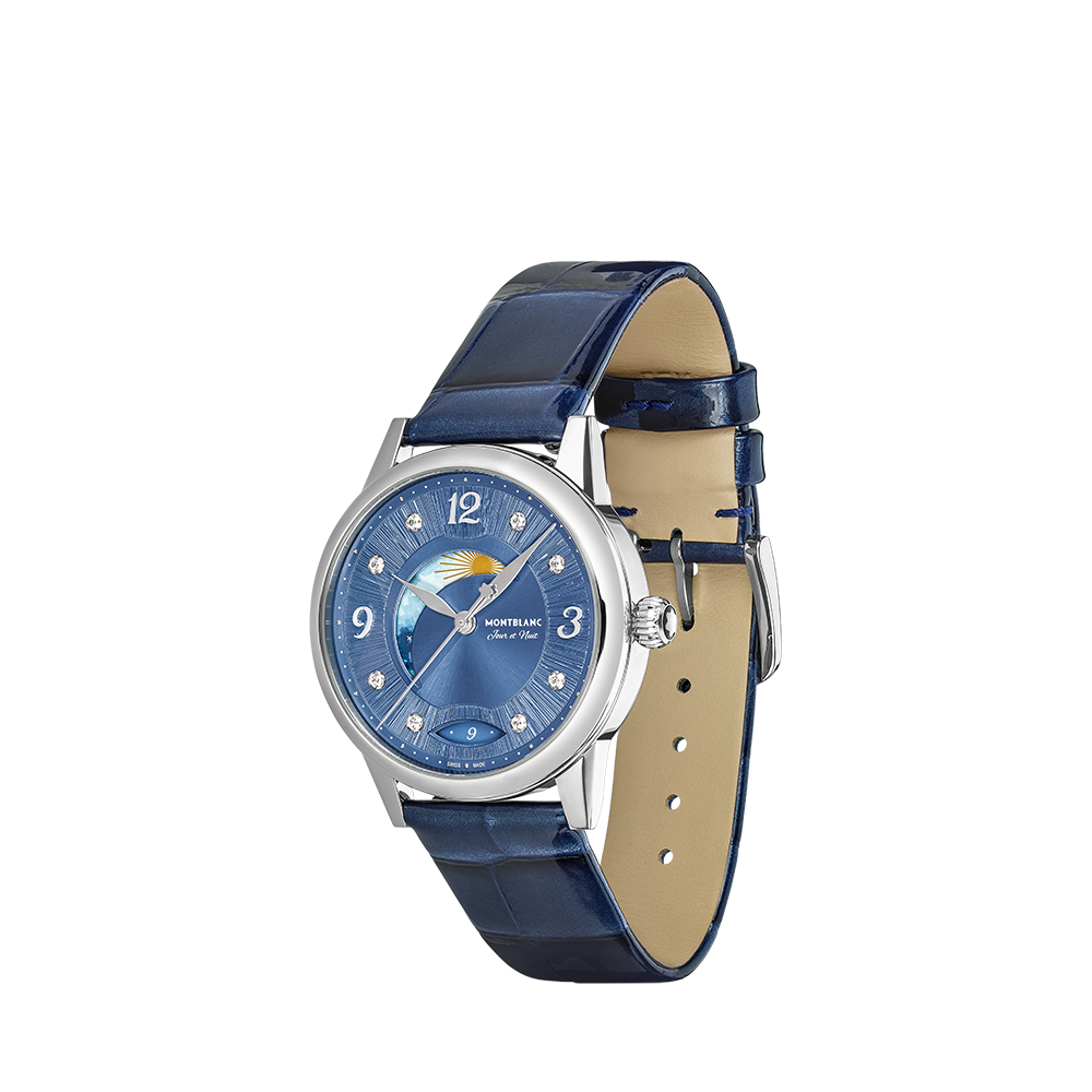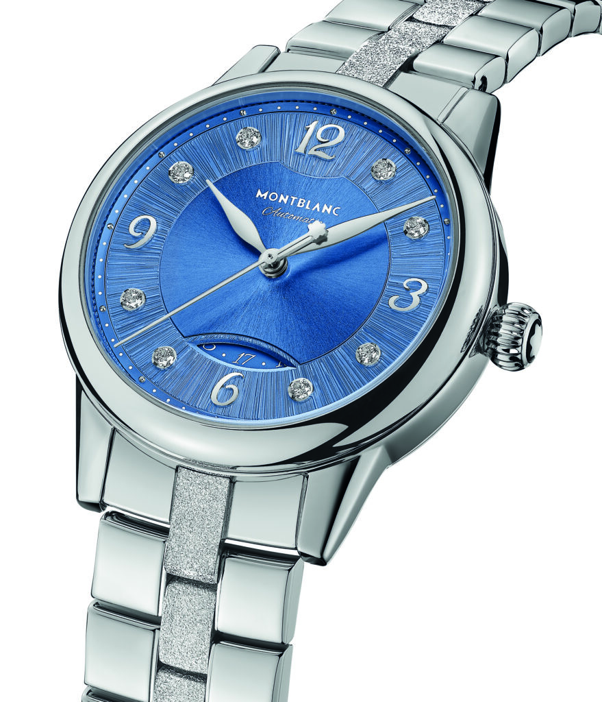 Mais c’est l’esthétique céleste qui émerveille. Le fond central en micro-diamants, recouvert d’un PVD effet métallisé, évoque un ciel nocturne scintillant. Autour, un cercle estampé en « filé d’étoiles » reproduit les traînées lumineuses d’un ciel capturé en pose longue. À 6h, la lune peinte en sérigraphie façon aquarelle s’anime au rythme des nuits, ajoutant une dimension onirique à la rigueur mécanique. La lunette, pavée de 60 diamants taille brillant, fait également office de minuterie, rappelant que chez Montblanc, le décor n’est jamais dénué de fonction.