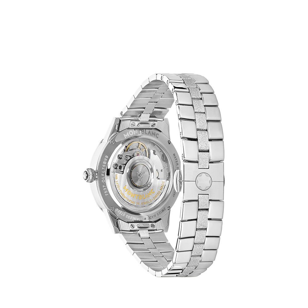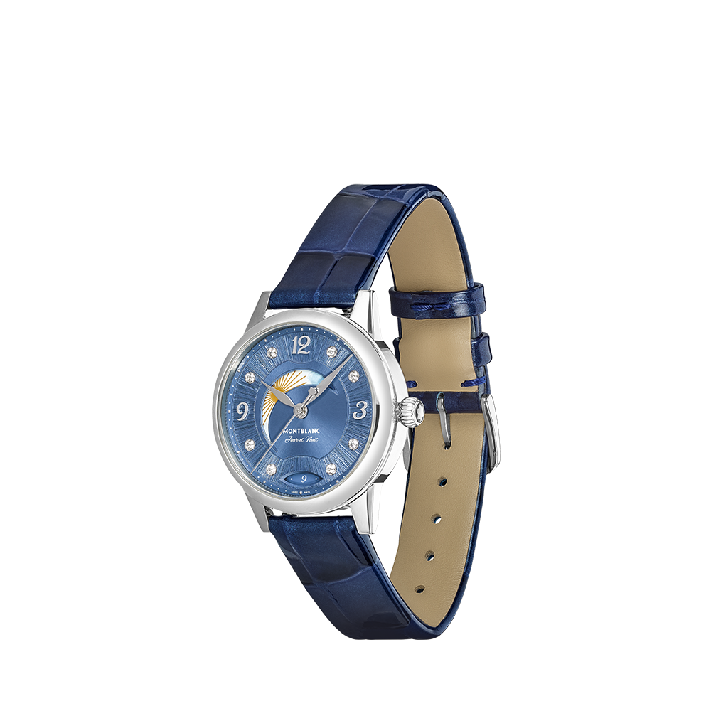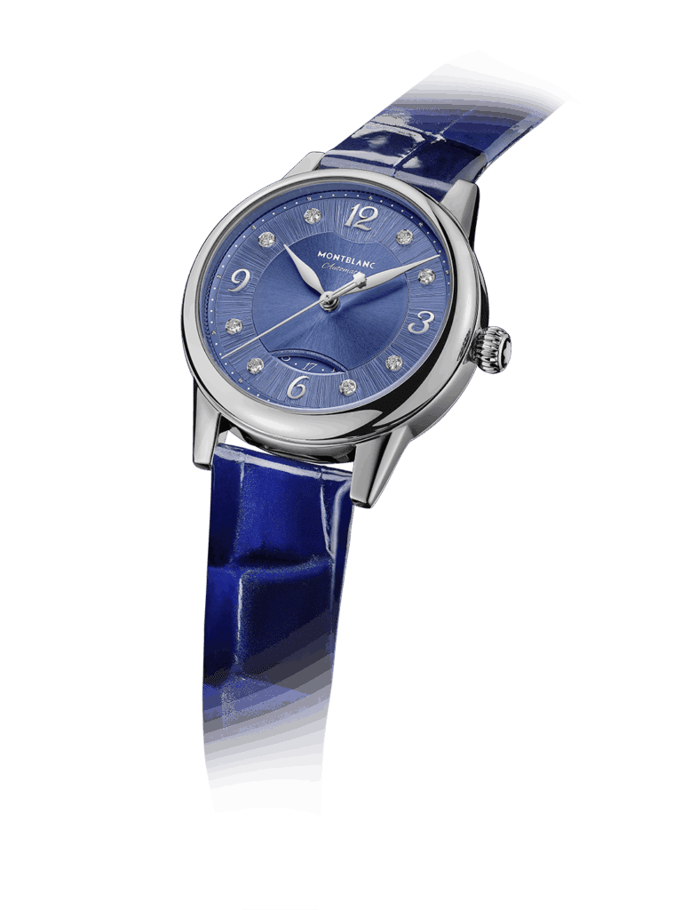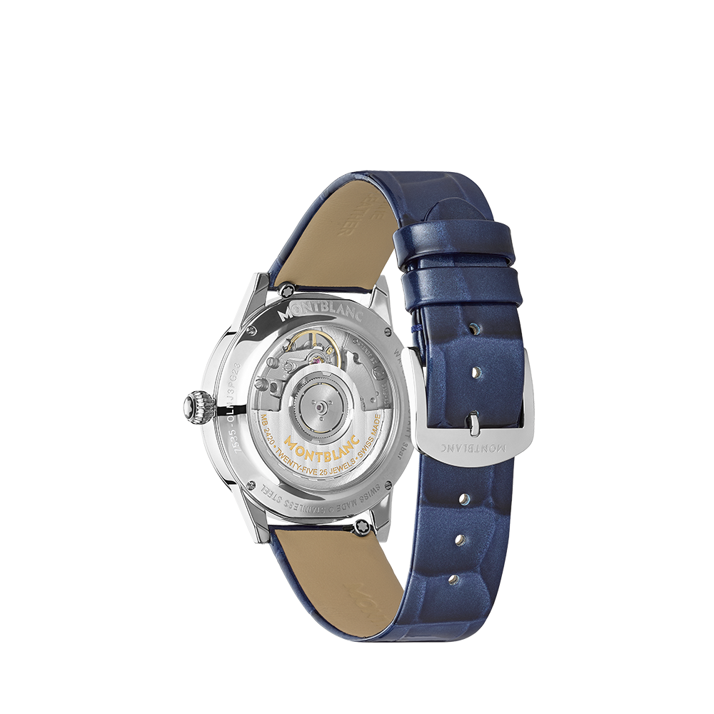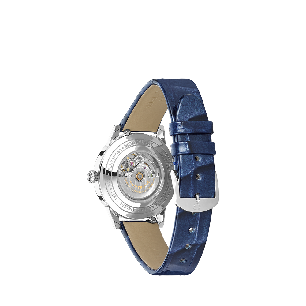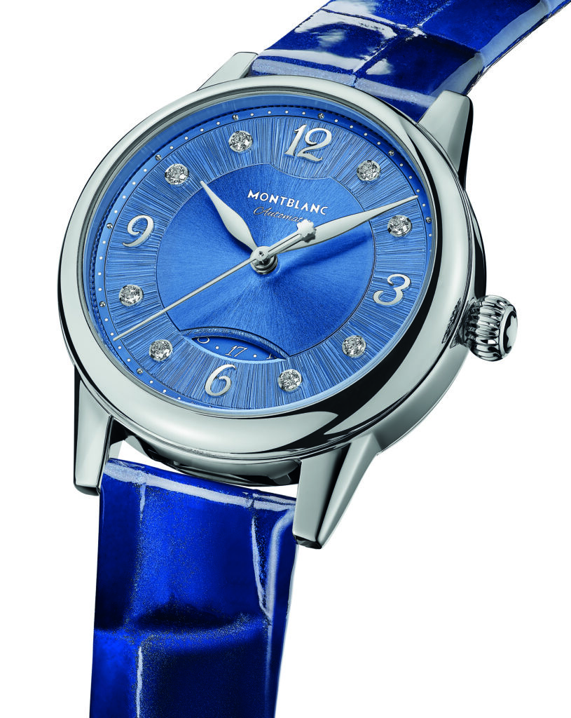 Mais c’est l’esthétique céleste qui émerveille. Le fond central en micro-diamants, recouvert d’un PVD effet métallisé, évoque un ciel nocturne scintillant. Autour, un cercle estampé en « filé d’étoiles » reproduit les traînées lumineuses d’un ciel capturé en pose longue. À 6h, la lune peinte en sérigraphie façon aquarelle s’anime au rythme des nuits, ajoutant une dimension onirique à la rigueur mécanique. La lunette, pavée de 60 diamants taille brillant, fait également office de minuterie, rappelant que chez Montblanc, le décor n’est jamais dénué de fonction.