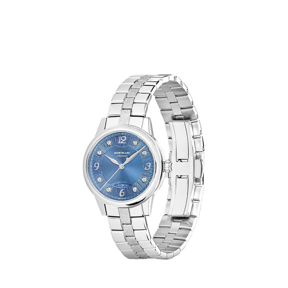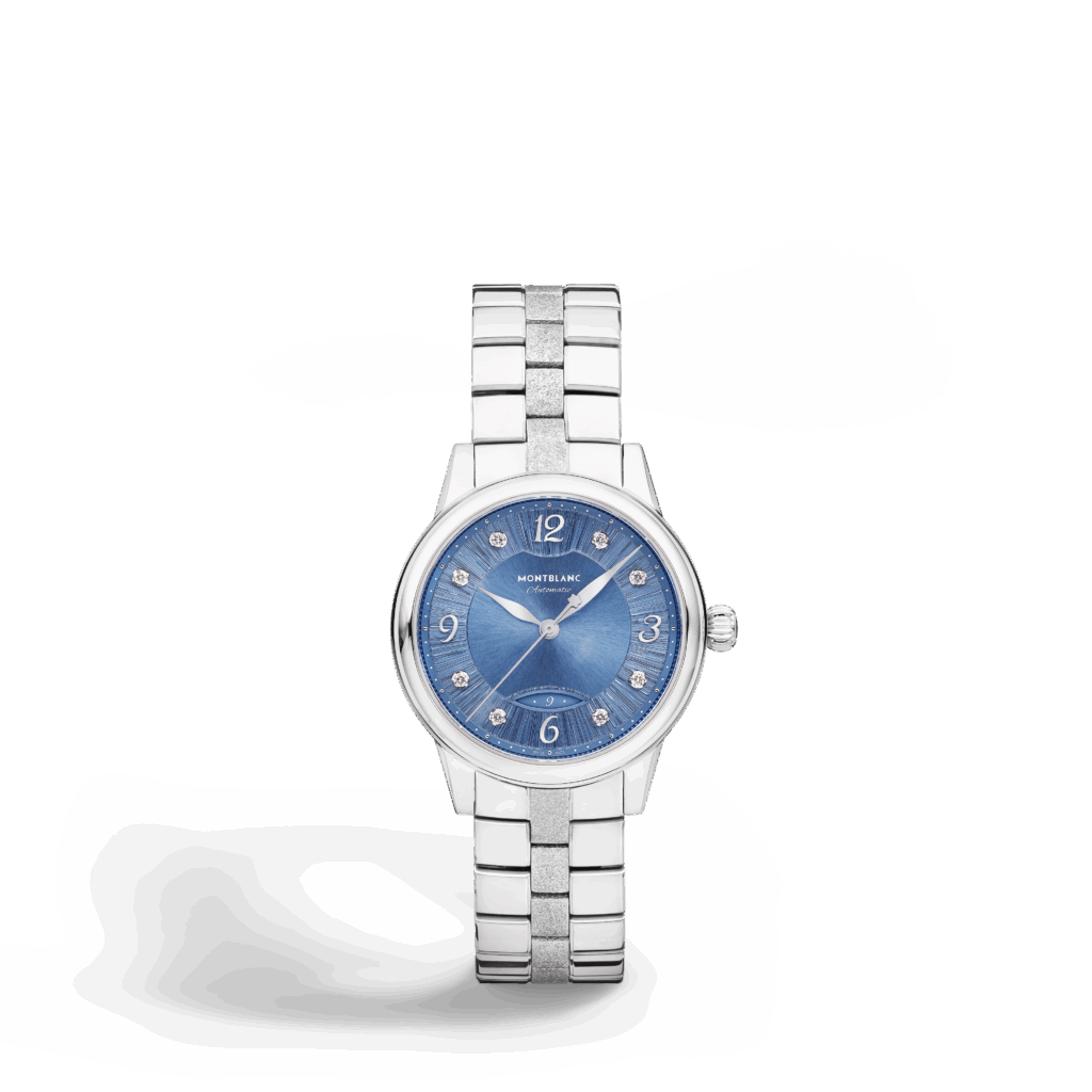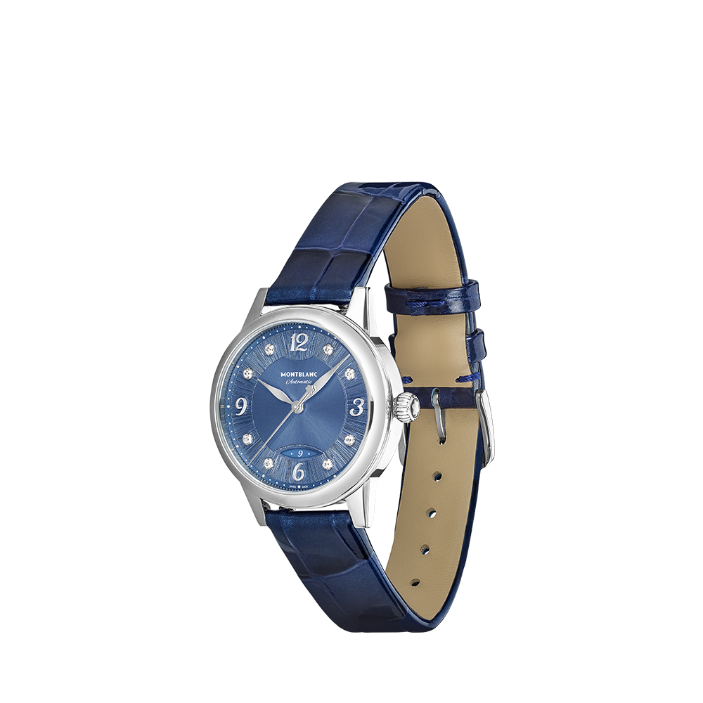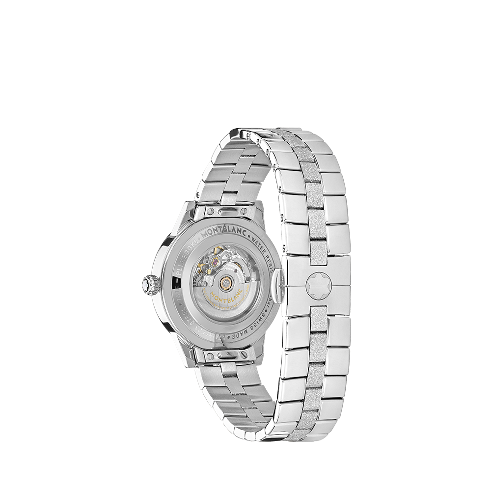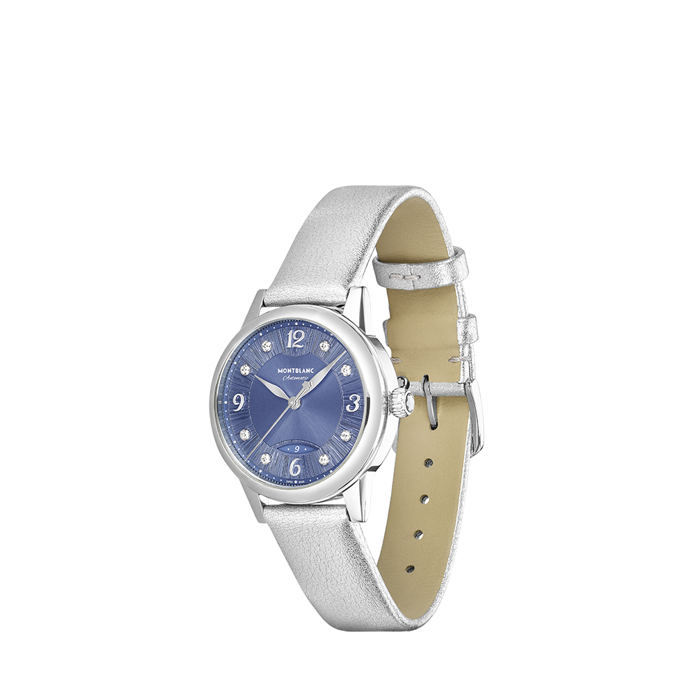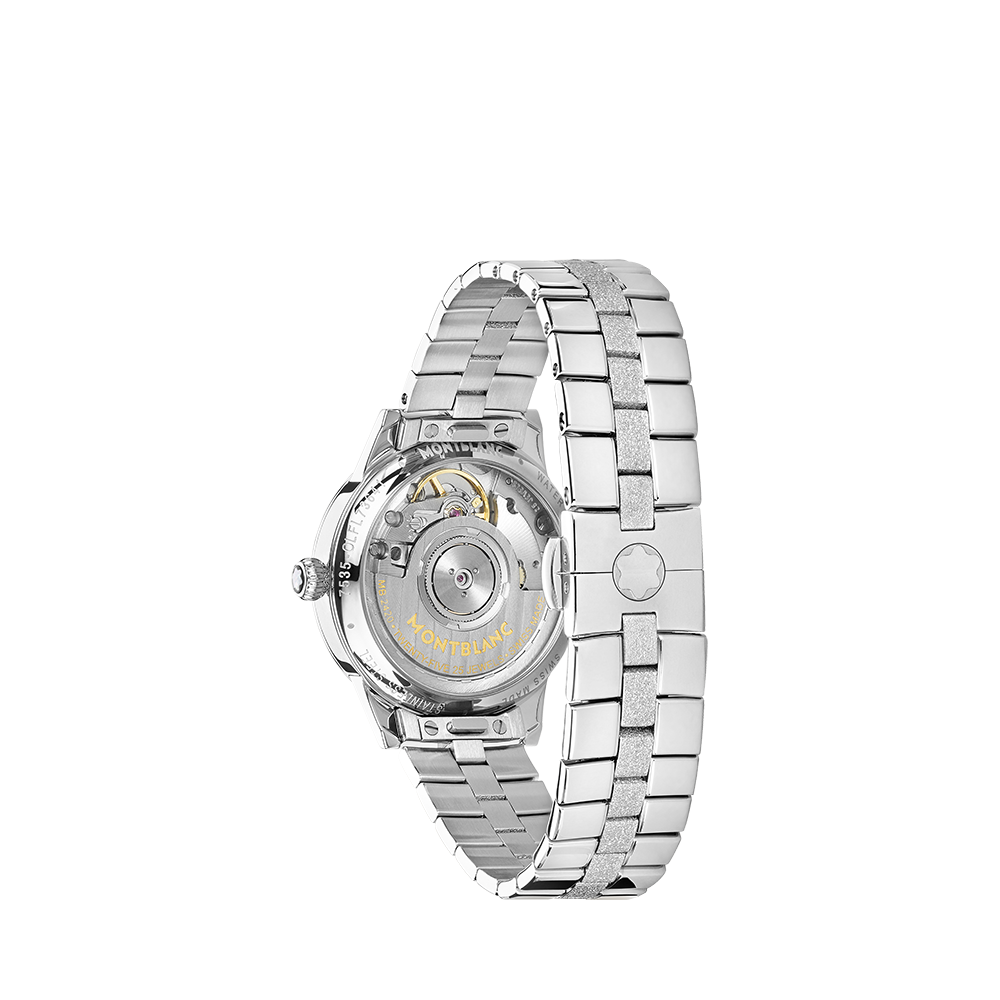 Mais c’est l’esthétique céleste qui émerveille. Le fond central en micro-diamants, recouvert d’un PVD effet métallisé, évoque un ciel nocturne scintillant. Autour, un cercle estampé en « filé d’étoiles » reproduit les traînées lumineuses d’un ciel capturé en pose longue. À 6h, la lune peinte en sérigraphie façon aquarelle s’anime au rythme des nuits, ajoutant une dimension onirique à la rigueur mécanique. La lunette, pavée de 60 diamants taille brillant, fait également office de minuterie, rappelant que chez Montblanc, le décor n’est jamais dénué de fonction.