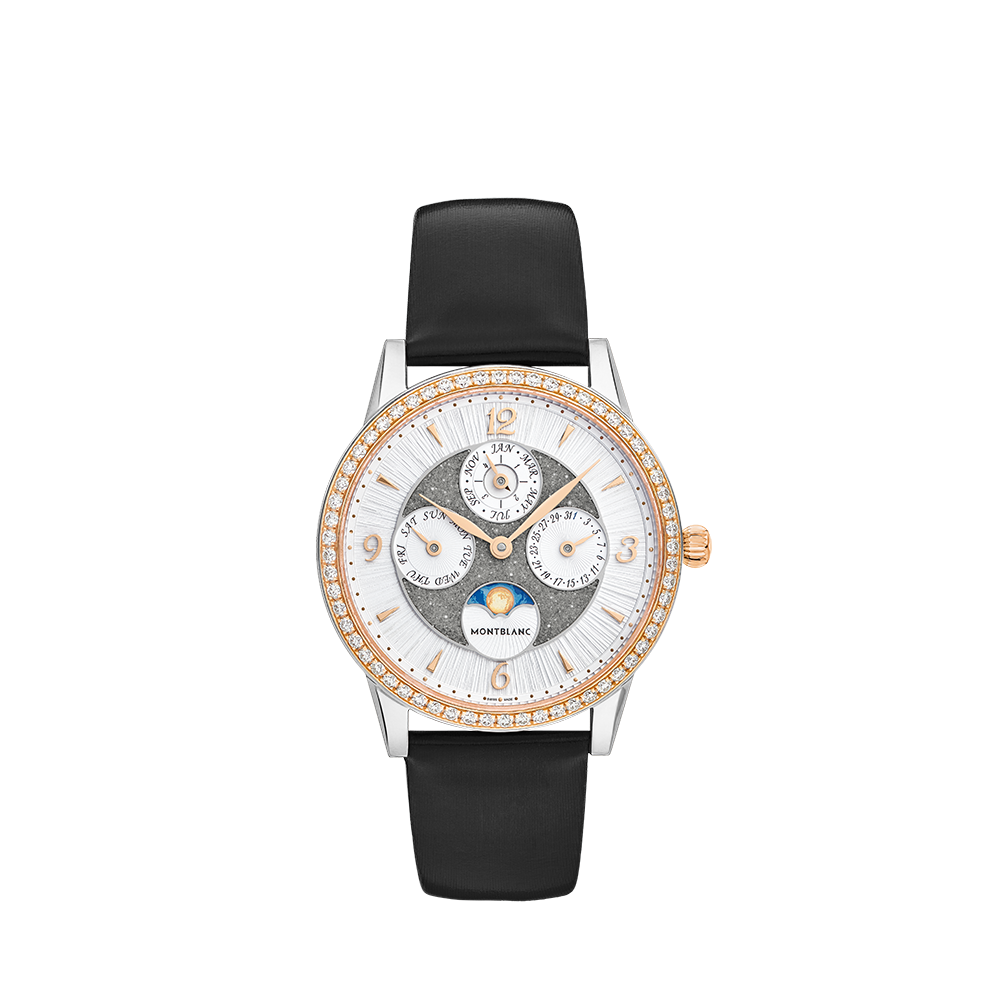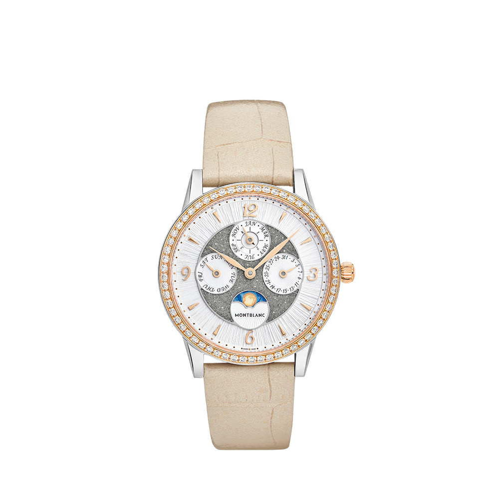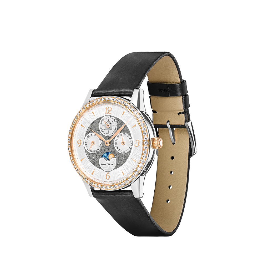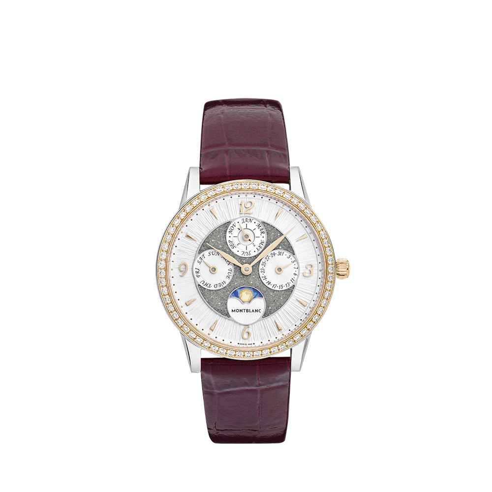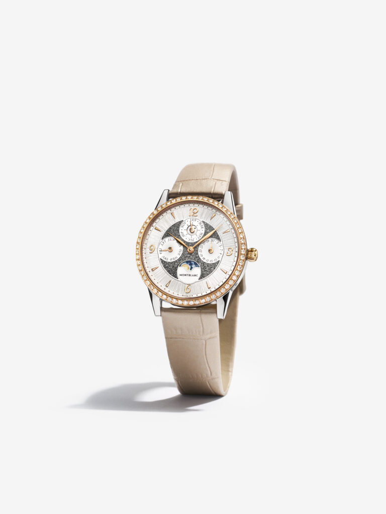 Disponible en version bimétallique (acier & or rose) ou en or rose intégral 18 carats, la Bohème Perpetual Calendar adopte un boîtier de 36 mm idéalement proportionné pour le poignet féminin. Sur le cadran, quatre sous-cadrans disposés avec une harmonie millimétrée révèlent jours, date, mois, années bissextiles et phases de la lune — le tout animé par le calibre automatique MB 29.15, précis jusqu’en 2100.