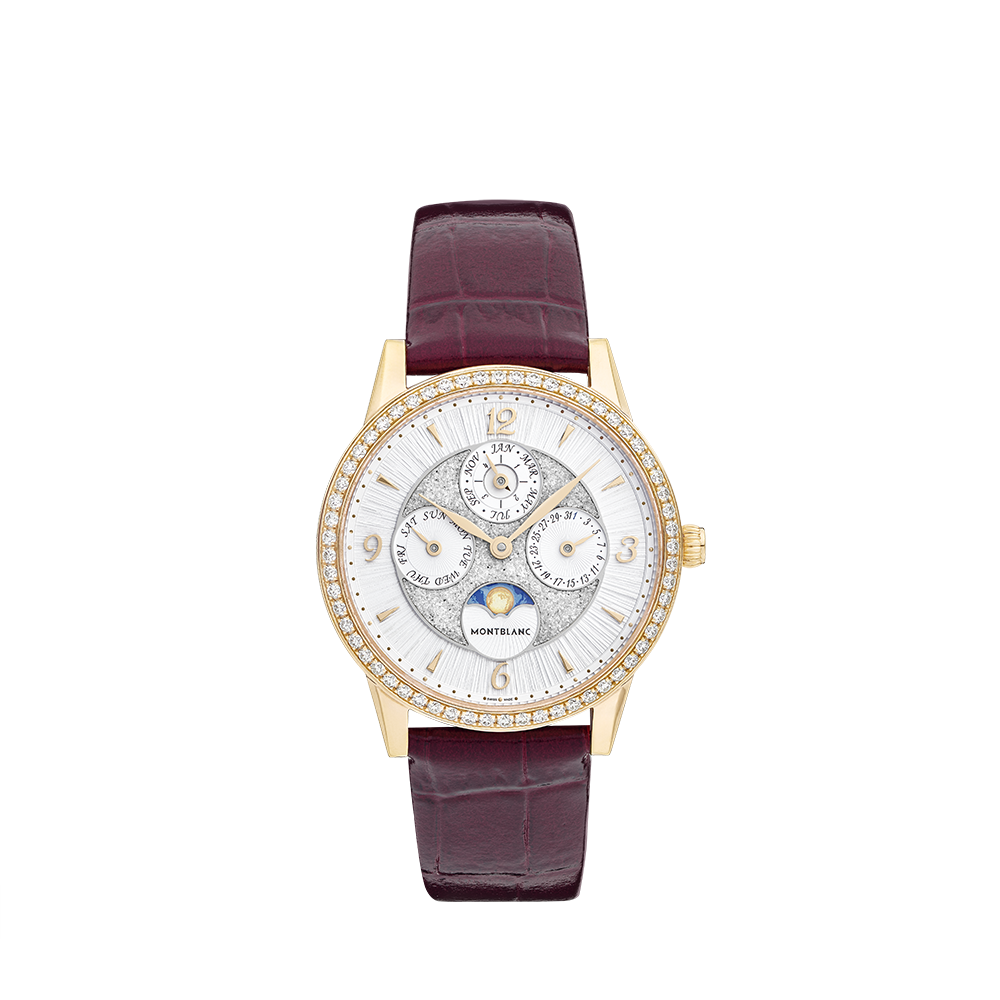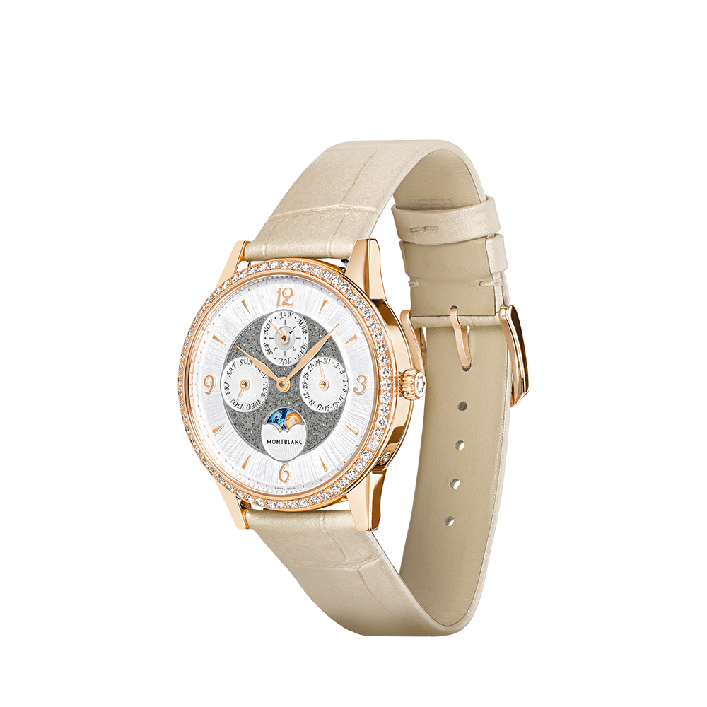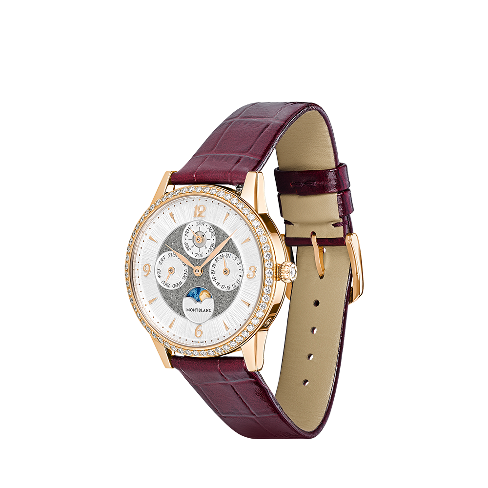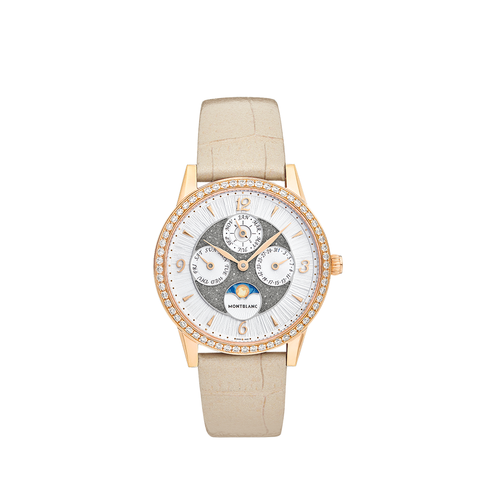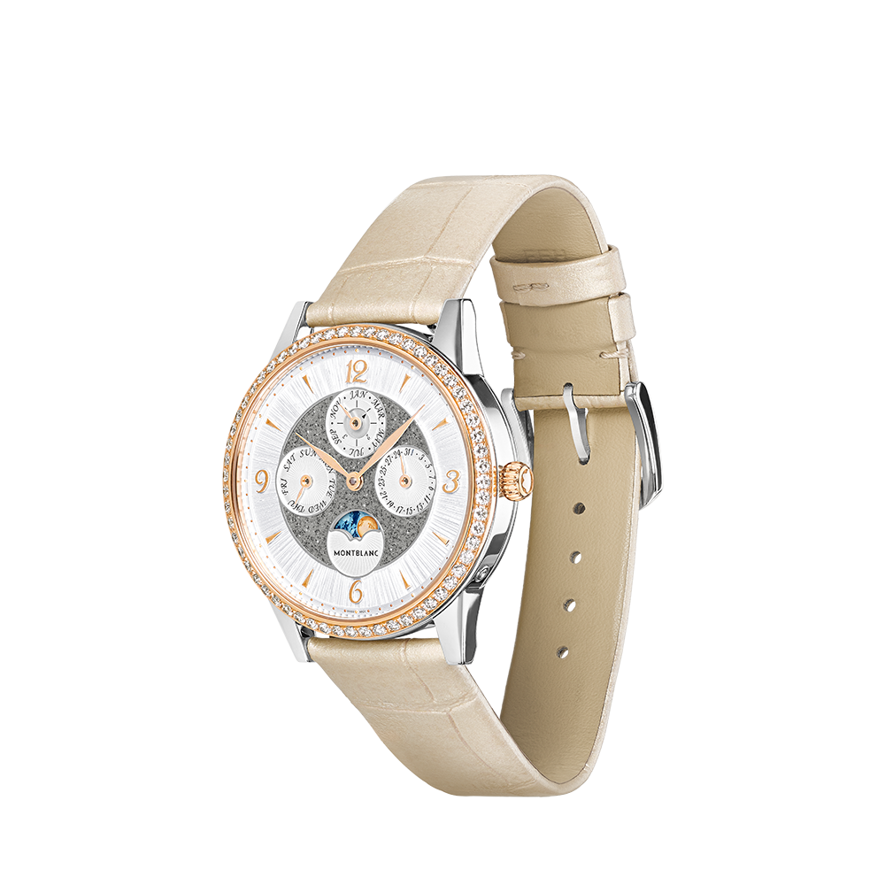 Disponible en version bimétallique (acier & or rose) ou en or rose intégral 18 carats, la Bohème Perpetual Calendar adopte un boîtier de 36 mm idéalement proportionné pour le poignet féminin. Sur le cadran, quatre sous-cadrans disposés avec une harmonie millimétrée révèlent jours, date, mois, années bissextiles et phases de la lune — le tout animé par le calibre automatique MB 29.15, précis jusqu’en 2100.