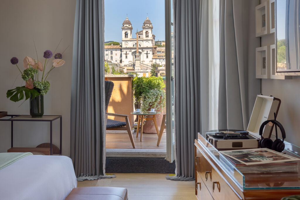 Quatorze studios seulement, habillés de soie champagne, de boiseries blondes et de malles haute-couture, composent une bulle de silence au cœur de la ferveur romaine. Ici, les miroirs biseautés reflètent l’église Trinità dei Monti ; là, une penderie capitonnée se cache derrière un panneau laqué ivoire. Tout culmine sur le rooftop, terrasse-caméra qui offre un travelling grandeur nature sur les coupoles de la ville : lever de soleil en tête-à-tête avec le Vittoriano, apéritif Negroni devant le ruban rose du crépuscule.