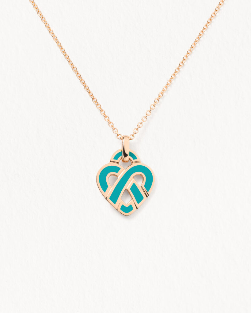 - Le pendentif petit modèle en or rose, habillé d’un émail bleu céladon (880 €), évoque la douceur d’un ciel clair.