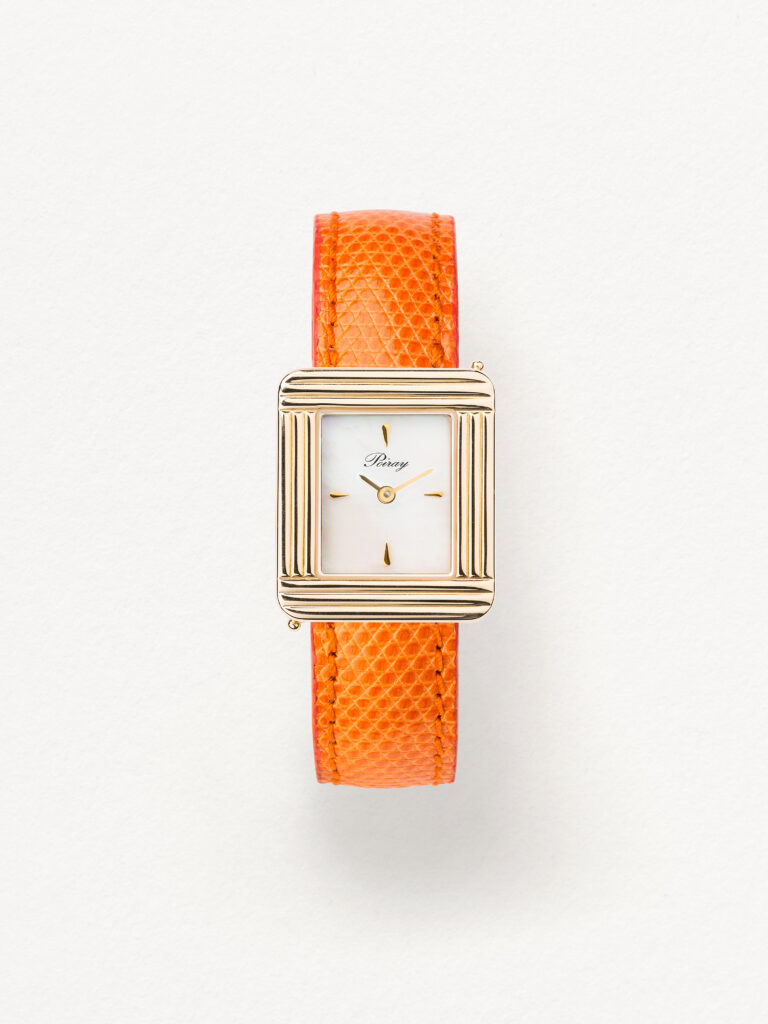 Montre signature de la Maison, Ma Première s’habille d’un bracelet en cuir de lézard orange au grain raffiné. Son boîtier en or jaune et son cadran en nacre blanche en font une pièce à la fois intemporelle et audacieuse (10 900 €).
