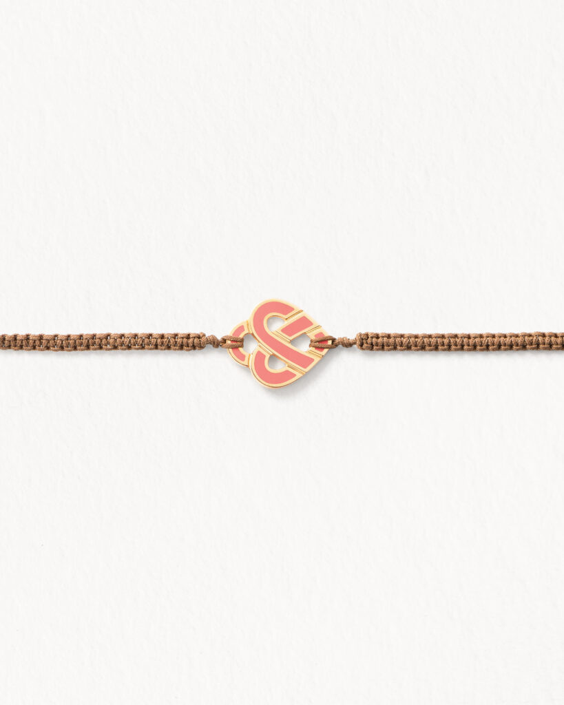 - Le bracelet en or jaune, rehaussé d’un émail corail sur cordon macramé brun moka (750 €), incarne une élégance vibrante, entre chaleur et modernité.