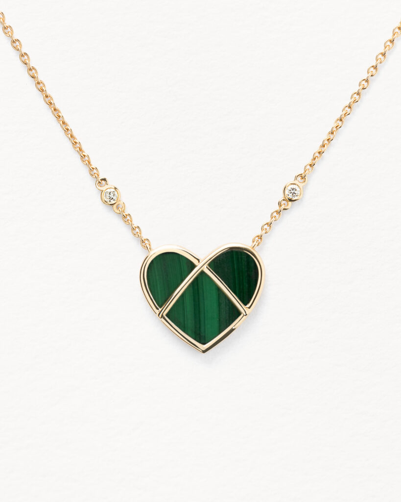 Paré de malachite et d’or jaune 18 carats, le collier grand modèle L’Attrape-Cœur (2 400 €) se fait talisman. Chaque veinure de pierre dessine un motif unique, offrant un cœur vibrant qui résonne avec les énergies de renouveau propres à la saison.