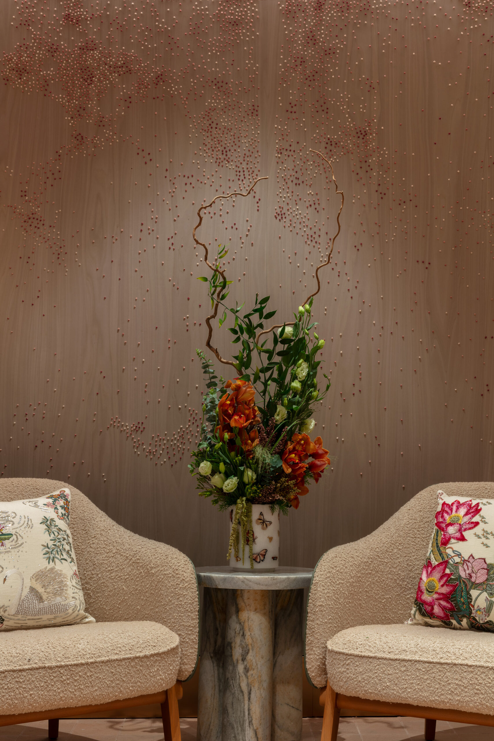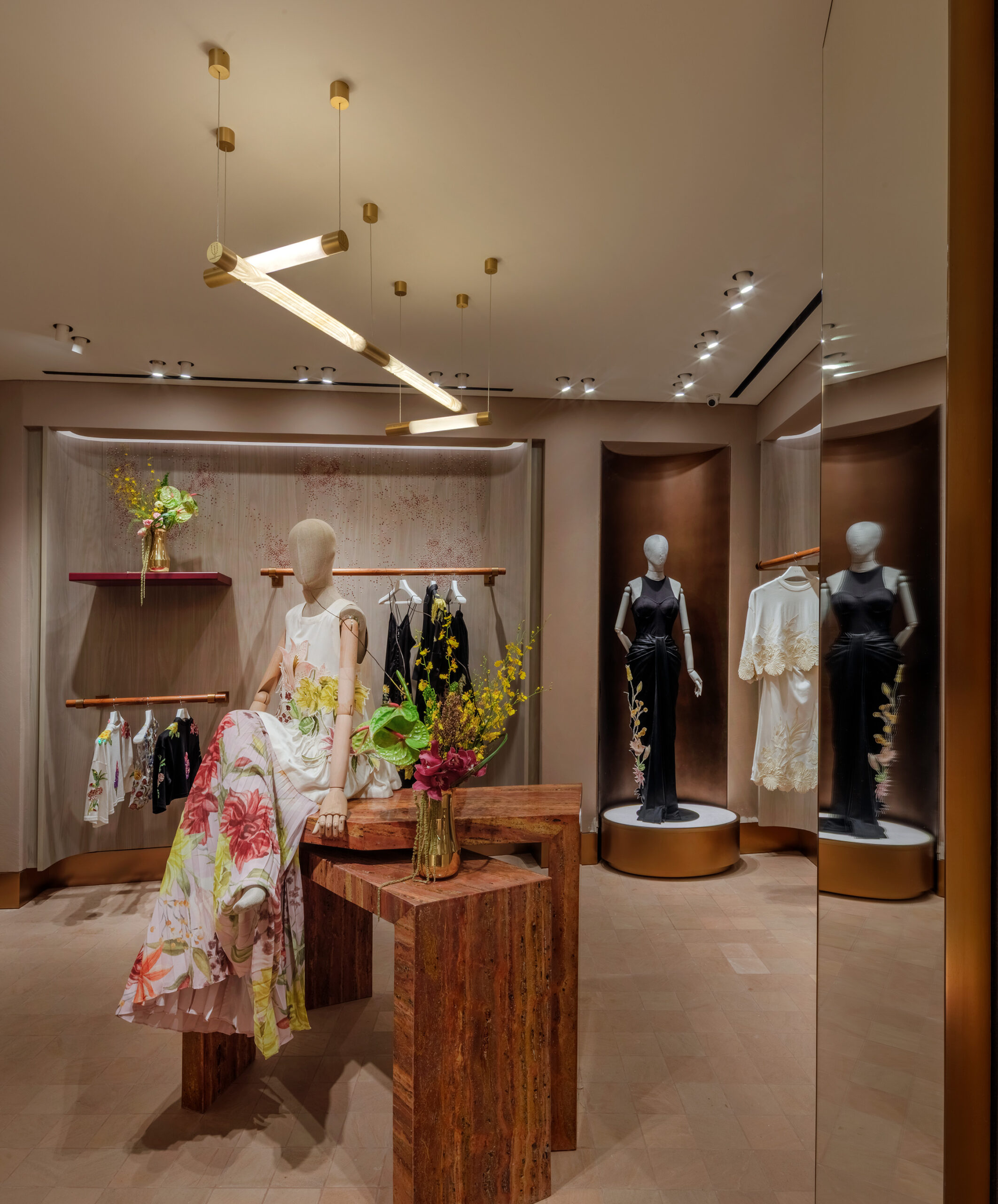 En collaborant avec Rooshad Shroff, figure reconnue de l’architecture contemporaine indienne, Rahul Mishra ancre sa vision dans une continuité esthétique où matériaux nobles, lignes sculpturales et atmosphère contemplative dialoguent avec ses collections. Le résultat : un lieu où chaque détail — du mobilier aux textures murales — reflète la fusion entre tradition et modernité, entre héritage et innovation.