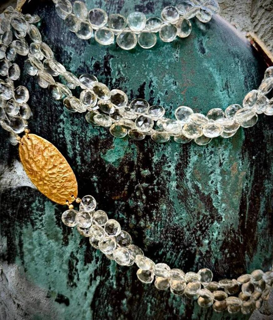Au centre de cette collection se trouvent les perles briolettes, dont les facettes rappellent des gouttes cristallisées. Elles dialoguent avec des pierres précieuses aux teintes aquatiques : tourmalines, tanzanites, aigues-marines et kunzites, choisies pour leurs nuances oscillant entre bleu lagon, vert émeraude et reflets rosés. Montées sur des structures en argent doré à l’or fin, elles traduisent la rencontre de l’élégance minérale et du geste artisanal raffiné.
