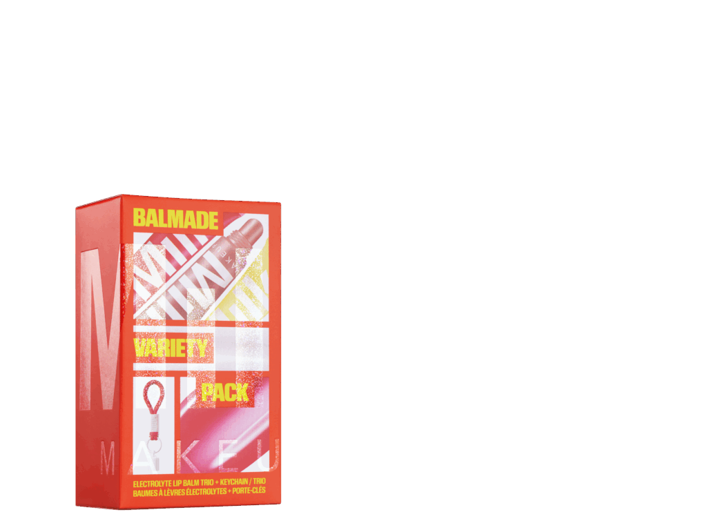 Trois baumes hydratants Balmade Electrolyte Lip Balm (Electron, Pump, Core) + un porte-clés exclusif.