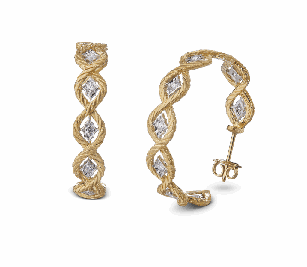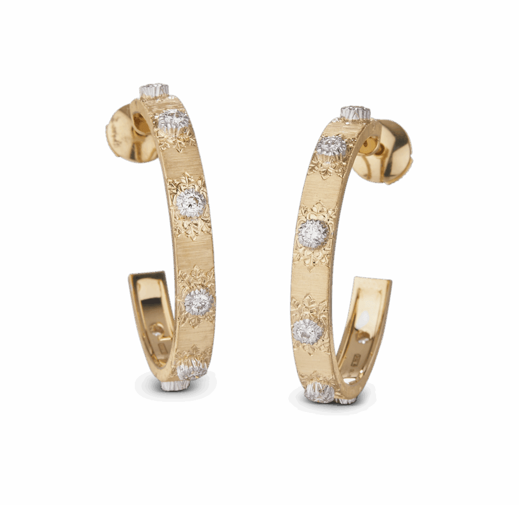 Les créoles figurent parmi les parures les plus anciennes de l’histoire de la joaillerie – portées dès l’époque sumérienne et égyptienne – et n’ont jamais perdu de leur pouvoir d’attraction. Buccellati, maître incontesté de l’orfèvrerie italienne, propose aujourd’hui une relecture précieuse de cette forme essentielle, en la dotant de ses codes stylistiques uniques : gravures rigato, ornato, modellato et dentelles d’or.
