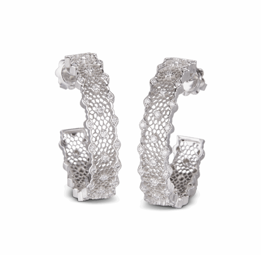 • Tulle : l’une des expressions les plus virtuoses de la maison, avec sa structure en nid d’abeille délicatement ajourée, réalisée exclusivement en or blanc, qui donne à la créole une dimension presque architecturale.