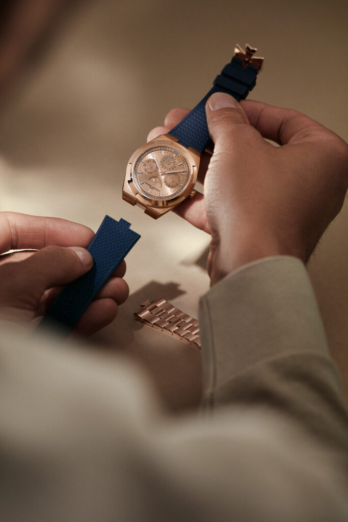 La première, en or rose 750/1000, se distingue par un cadran satiné soleil doré et une minuterie bleue subtile, complétés par un disque de phases de Lune en or rose. La seconde, en or blanc 750/1000, adopte un cadran laqué bordeaux lumineux, contrasté par des index blancs et un disque de phases de Lune assorti. Dans les deux cas, la montre se pare d’un bracelet intégré en or, accompagné de deux bracelets en caoutchouc interchangeables (bleu et blanc pour l’or rose ; bordeaux et blanc pour l’or blanc), permettant de passer du registre habillé au style plus décontracté.