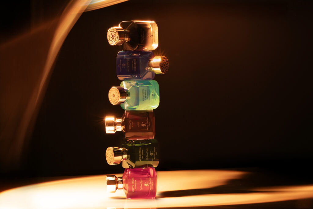 La première collection réunit six créations olfactivesBluesense, Notte Rossa, El Maktoub, Princesse Zaphira, Mezghenna et Idmane – conçues par les parfumeurs Sofia Bardelli (Grèce) et Emna Doghri (Floralys). Chacune explore une facette de cet héritage : jeux de matières nobles, atmosphères méditerranéennes, réminiscences d’un patrimoine commun.