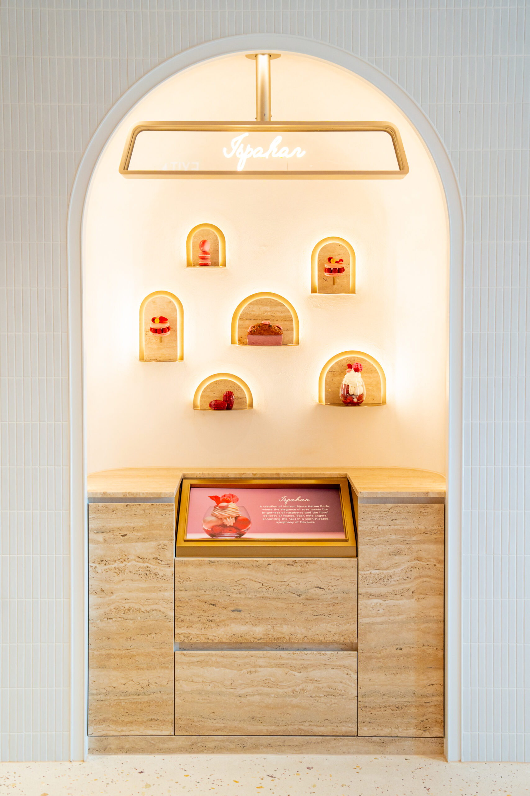 Dès les premiers pas, l’émerveillement opère : un jardin ponctué d’arches colorées et de macarons en lévitation conduit les visiteurs vers une façade monumentale, signature de cette scénographie onirique. À l’intérieur, un lustre en hommage aux pétales de rose de l’Ispahan domine un univers pastel, où macarons iconiques, pâtisseries signatures et créations exclusives s’exposent dans un ballet gourmand.
