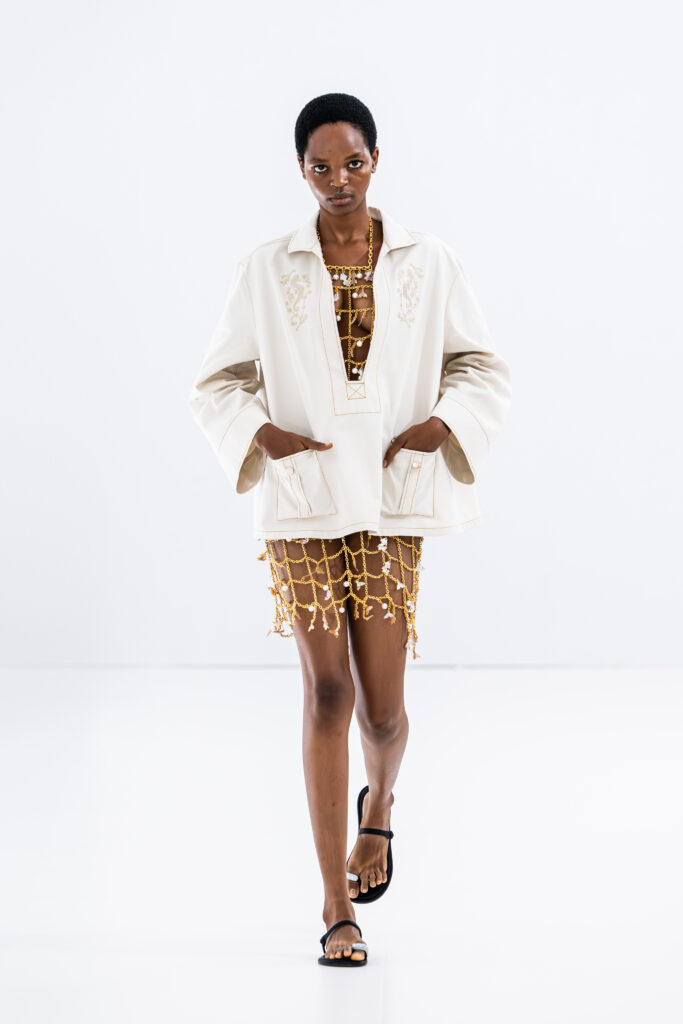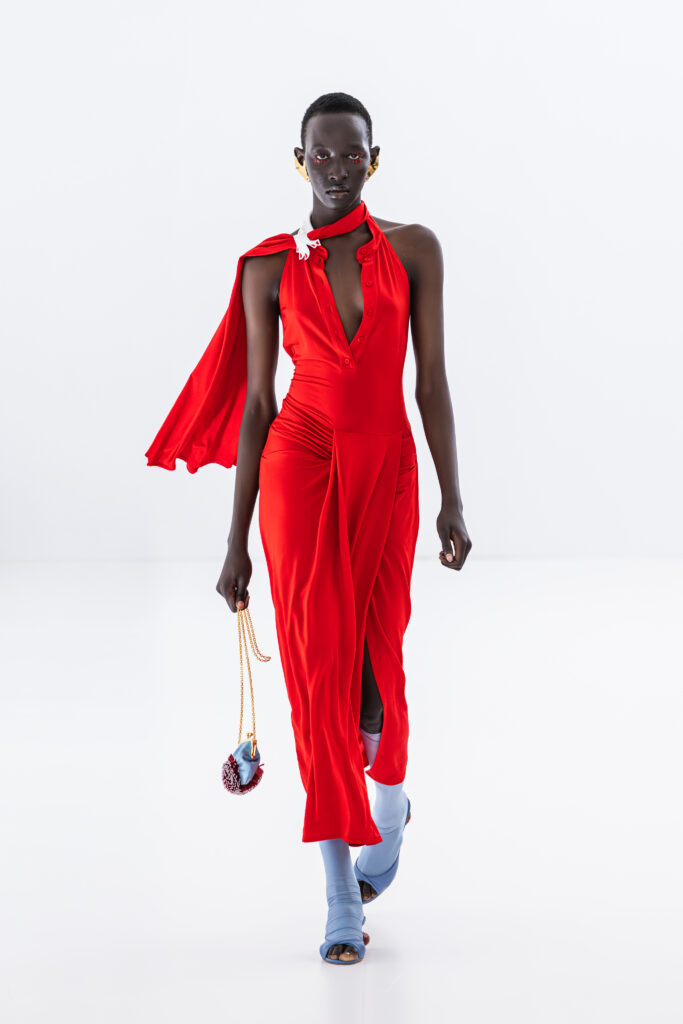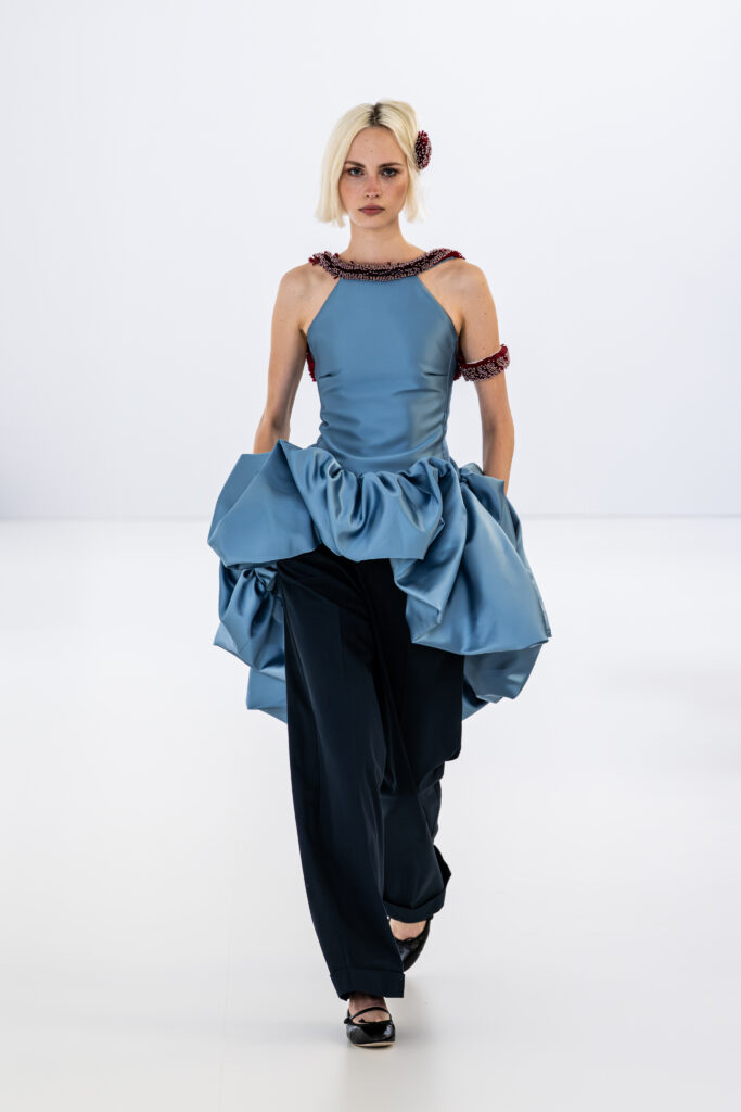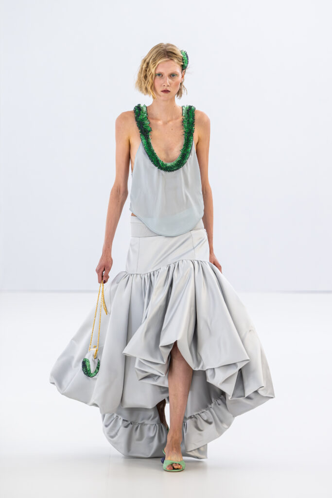La collection résonne comme le chant d’une sirène : sensuelle, envoûtante et légèrement dangereuse. Les vagues deviennent des tissus, et leur rythme se traduit dans les mouvements des silhouettes. La chemise devient l’élément central du récit — du smoking strict à la robe longue ou mini. Ses cols brillent comme des bijoux ou se transforment en fines mains soutenant une écharpe — une signature Vivetta au ton grotesque.