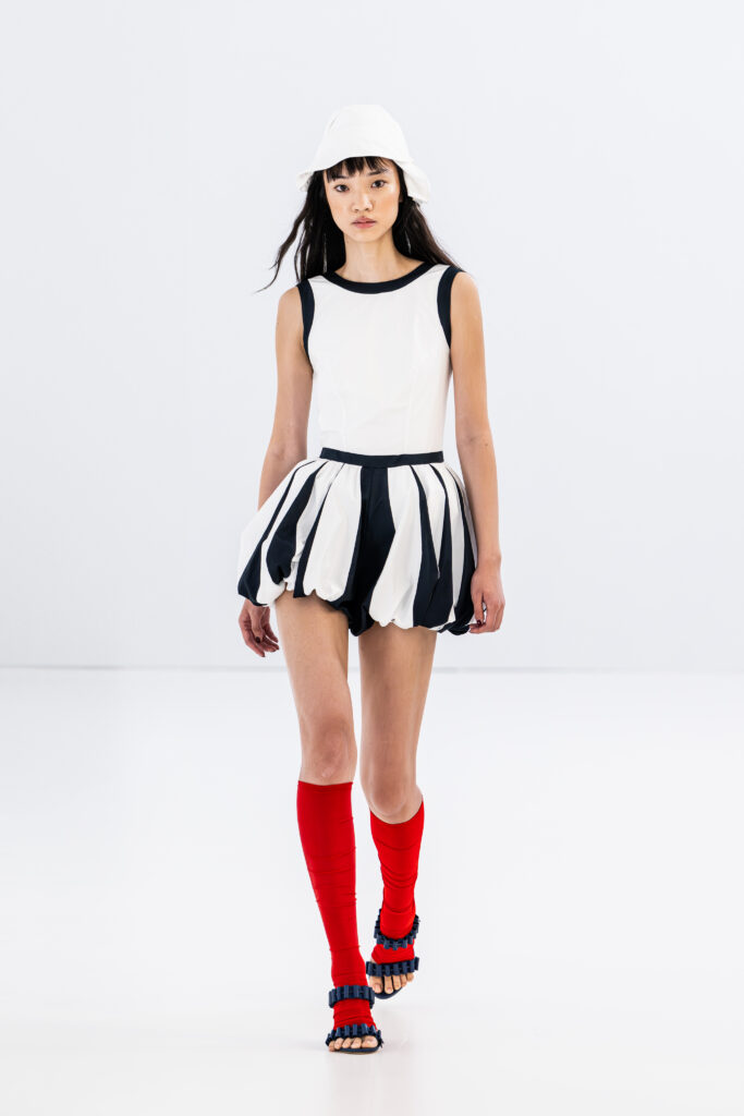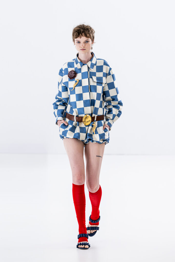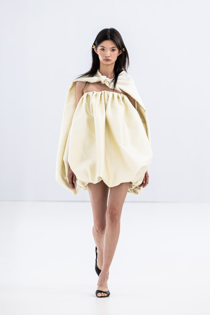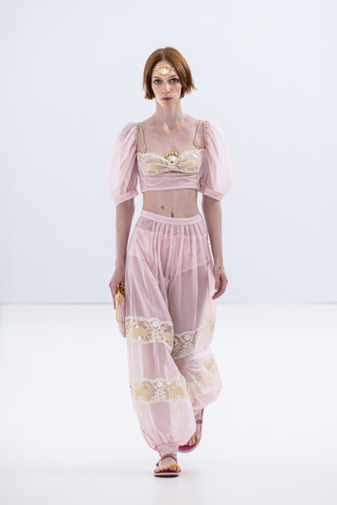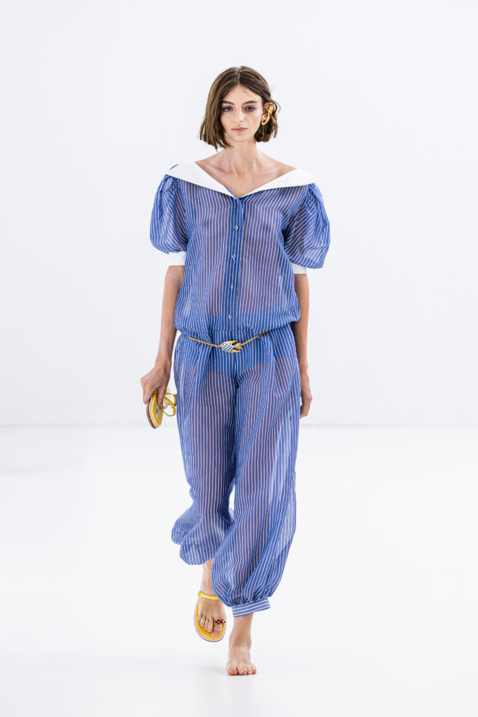 La collection résonne comme le chant d’une sirène : sensuelle, envoûtante et légèrement dangereuse. Les vagues deviennent des tissus, et leur rythme se traduit dans les mouvements des silhouettes. La chemise devient l’élément central du récit — du smoking strict à la robe longue ou mini. Ses cols brillent comme des bijoux ou se transforment en fines mains soutenant une écharpe — une signature Vivetta au ton grotesque.