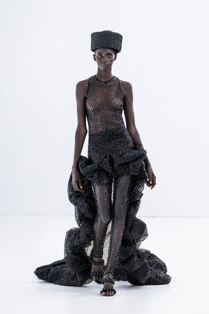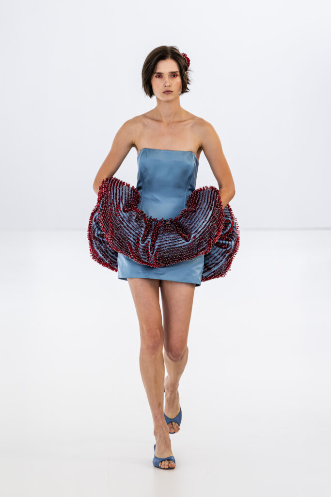 La fantaisie traverse les textures : le popeline à boutons nacrés évoque le sable mouillé, et la dentelle est parsemée de minuscules crabes et anémones réalisés à la main en perles et fil de fer. Les costumes en éponge se mêlent à des fils scintillants de paillettes, de lurex et de nylon respirant — des tissus simples élevés au rang de haute couture.