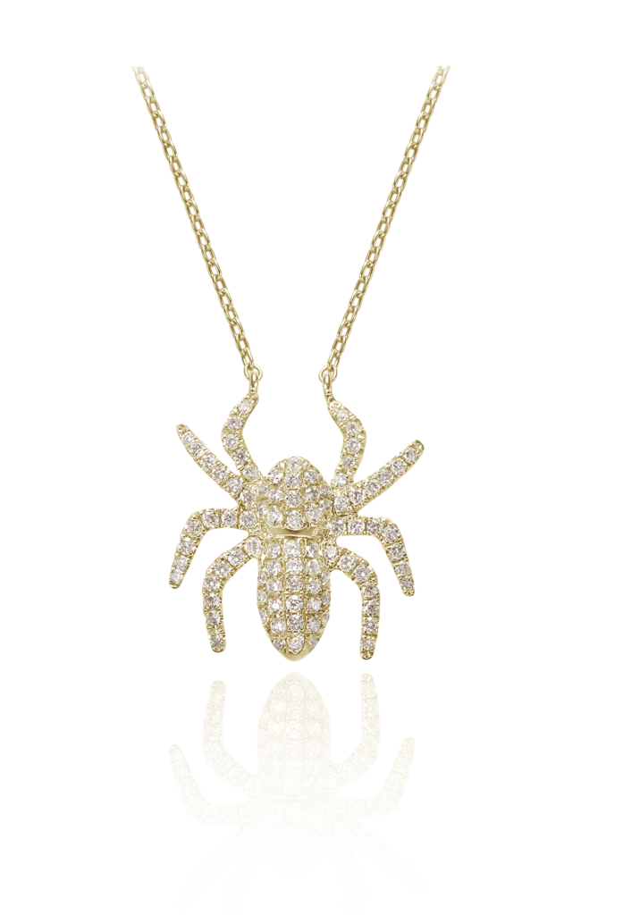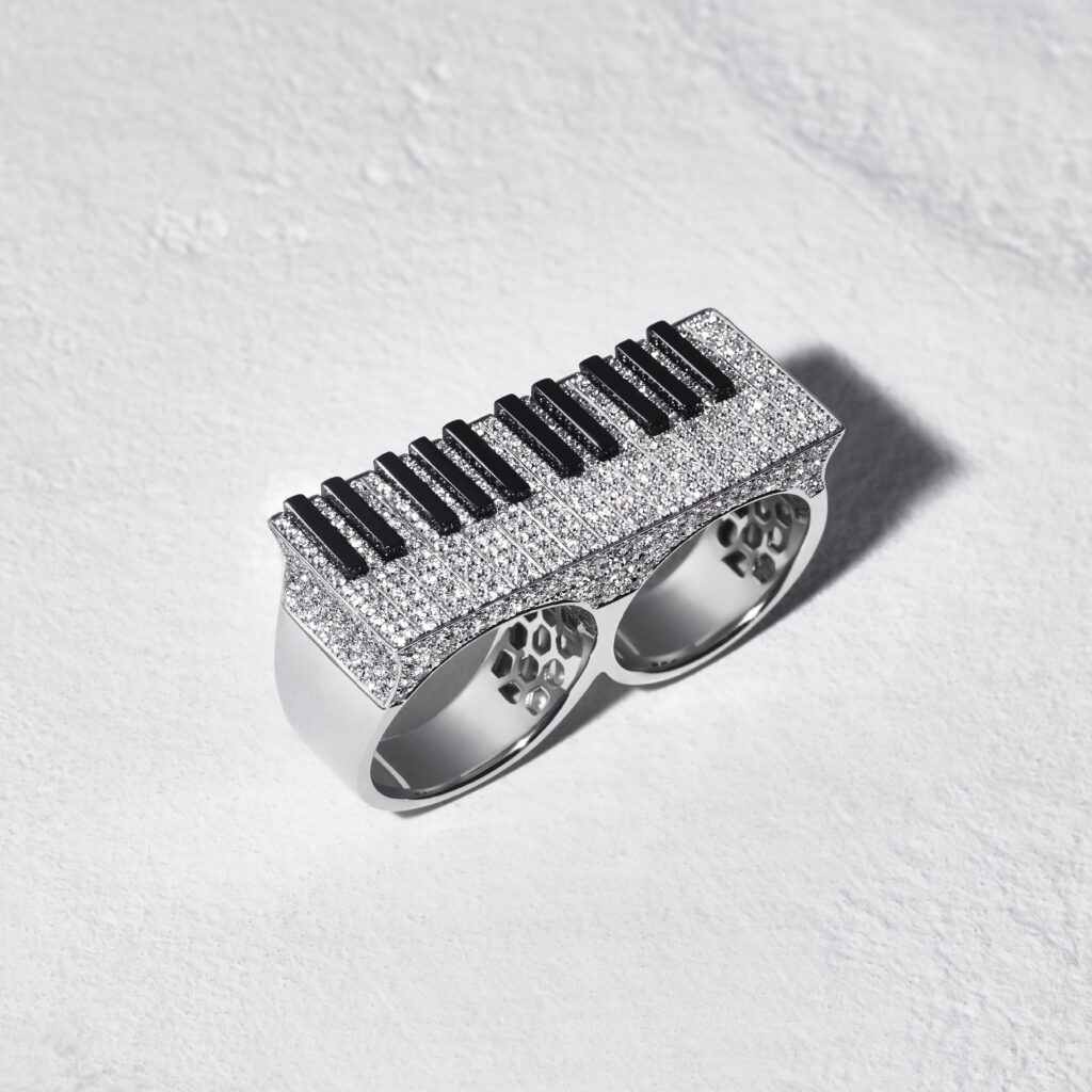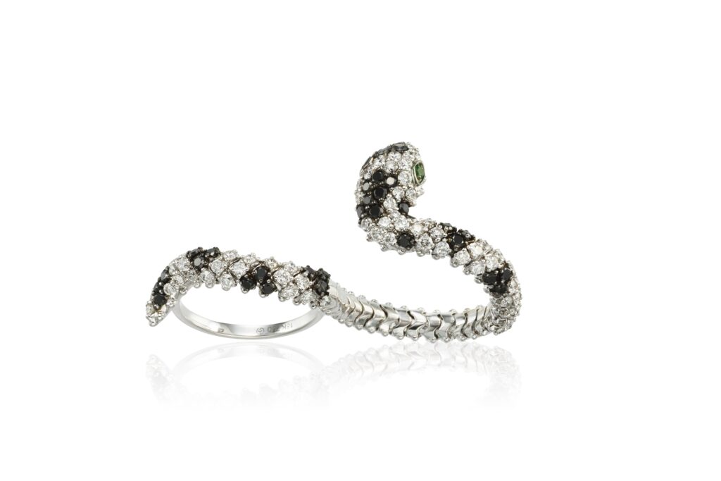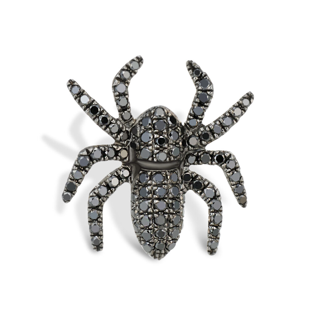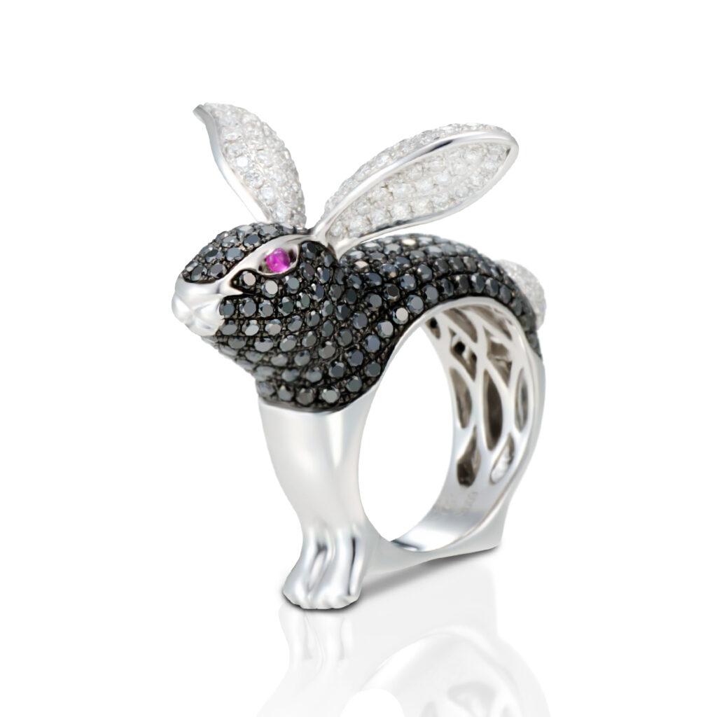 Sous ses doigts, les diamants noirs et blancs s’illuminent d’un éclat presque surnaturel. L’or blanc devient l’écrin d’un bestiaire fascinant : une broche araignée dont les pattes s’étirent comme une dentelle d’ombre, une bague serpent lovée autour du doigt, ou encore un lapin noir sculpté dans un raffinement presque gothique. Ces créations, aussi poétiques que mystérieuses, réinventent l’idée même du bijou saisonnier : non pas un ornement, mais un objet narratif chargé de symboles.