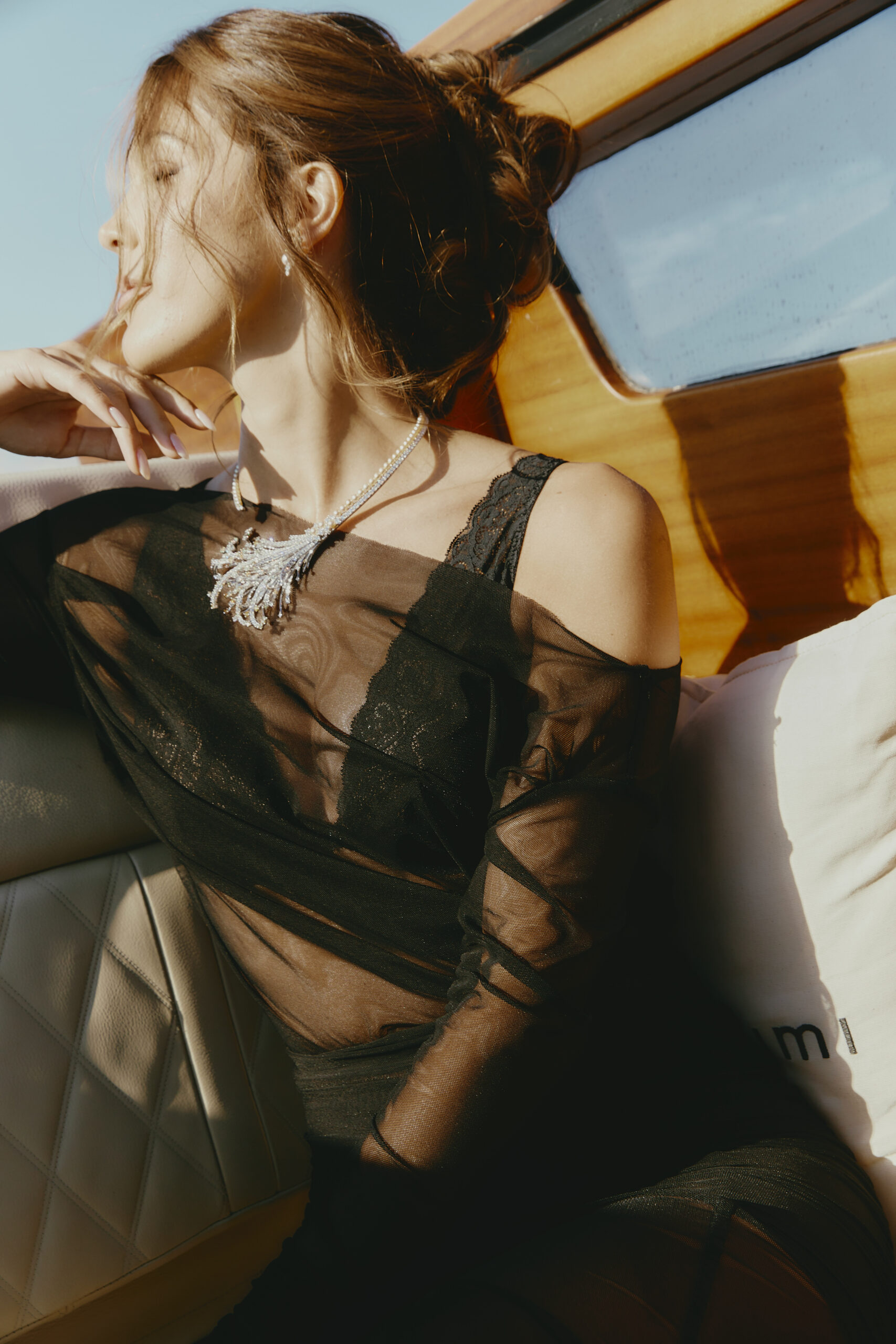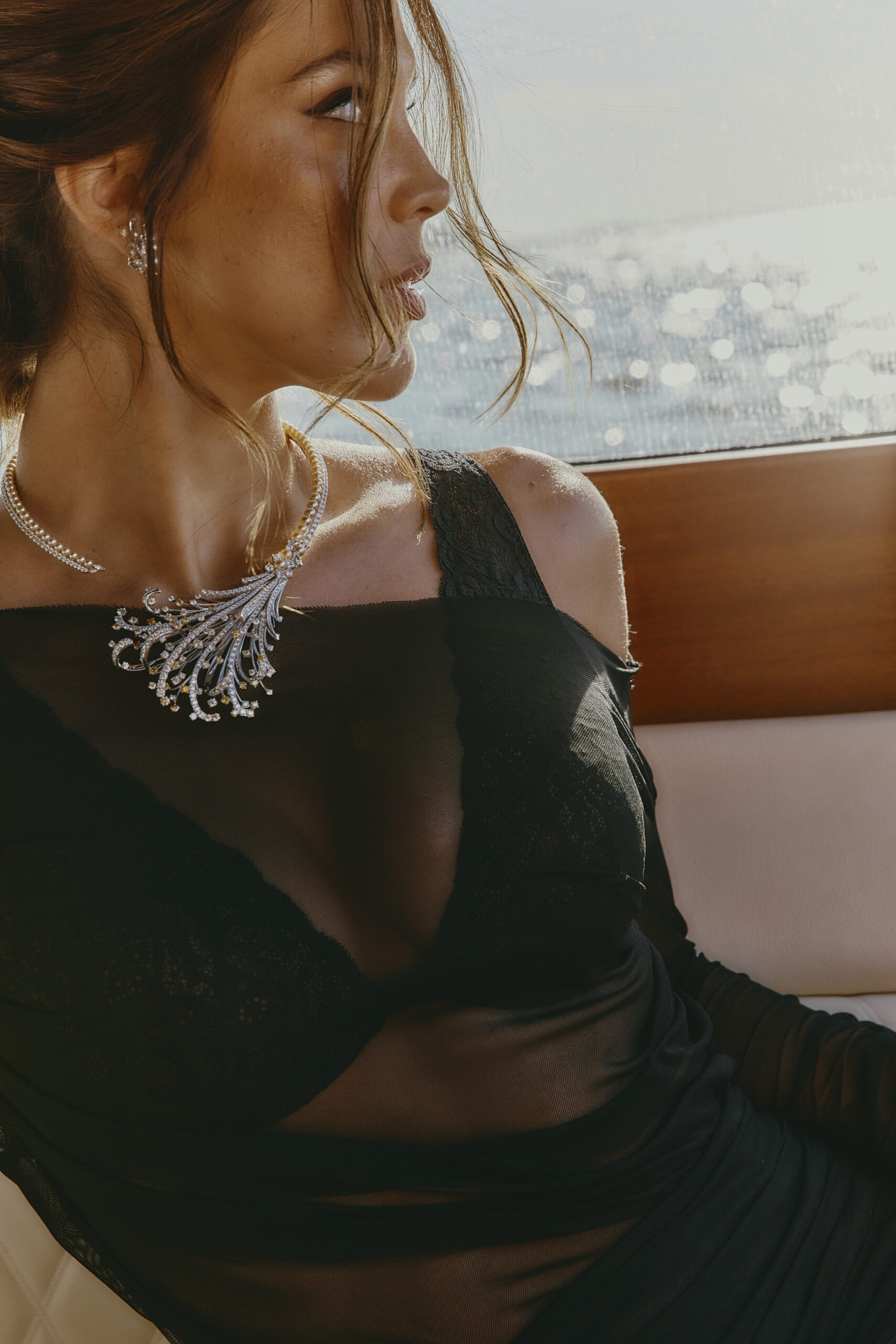 Sous une robe exclusive, le soutien-gorge Elena et un shorty taille haute en dentelle florale emblématique d’Intimissimi dessinaient une allure à la fois romantique et sophistiquée. Le jeu de transparence et de texture, délicat et sensuel, révèle une féminité contemporaine, audacieuse mais toujours empreinte de grâce.