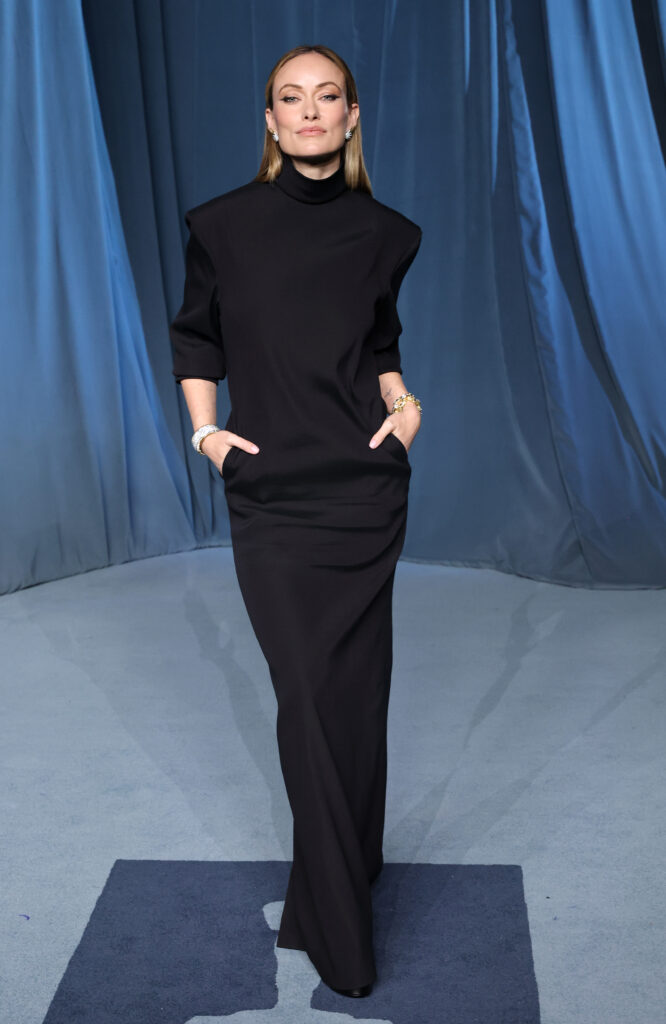 Fidèle à son élégance épurée, Olivia Wilde portait une robe ample et fluide en soie stretch, à la ligne minimaliste et à la structure boxy.