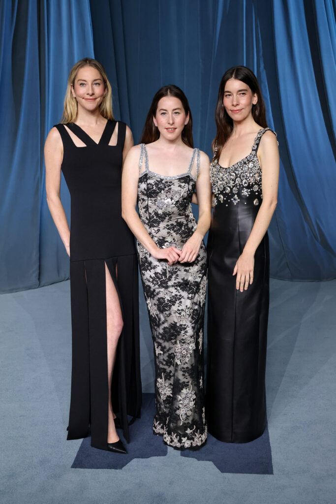 Le trio Haim a incarné l’élégance Louis Vuitton dans toute sa diversité. Alana Haim resplendissait dans une robe colonne noire en dentelle brodée à la main, aux doubles bretelles argentées, assortie de boucles d’oreilles LV Diamonds en or blanc et diamants. Danielle Haim imposait une allure sculpturale dans une robe en cuir noir brodée de pierres argentées et de tubes en cristal, complétée par une bague en or blanc sertie de diamants. Enfin, Este Haim choisissait une robe fluide en jersey de crêpe noir, soulignant la silhouette avec une précision graphique, relevée par des boucles d’oreilles et un ear cuff LV Diamonds en or blanc et diamants.