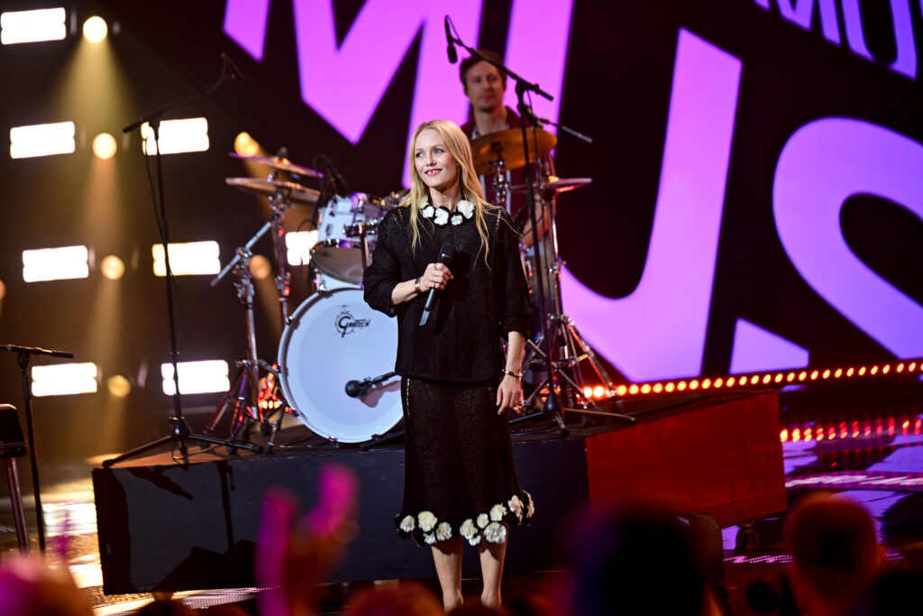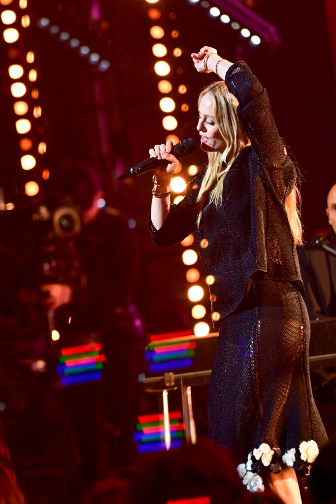 Sur scène, la chanteuse portait un haut et une jupe en maille noire ornés de camélias de soie blanche, issus du look 26 de la collection Prêt-à-Porter Printemps-Été 2026. Une silhouette d’une pureté saisissante, rehaussée par le maquillage Chanel Beauté, qui jouait la carte d’un éclat naturel et lumineux. Tout semblait pensé pour rappeler que la modernité n’a pas besoin de provocation lorsqu’elle s’appuie sur la constance du style.