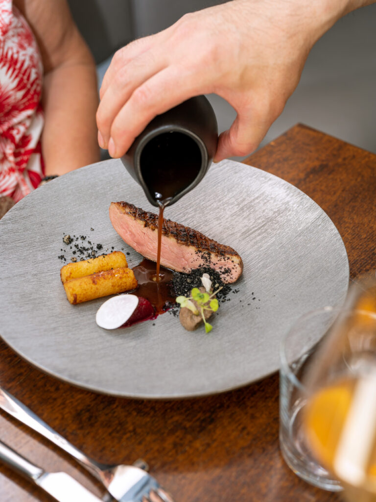 Les formules dégustation (de 68 à 85 euros) révèlent un savoir-faire d’orfèvre : flan de foie gras et écume d’artichaut, espuma d’asperge blanche, magret fumé ou légumes subtilement travaillés. La carte évolue au fil des saisons, fidèle à l’idée qu’un bon plat doit toucher avant tout par sa vérité. Et dans cette salle intime de vingt-six couverts, le raffinement se conjugue à la générosité : on y retrouve le plaisir du partage, le sens du beau et la chaleur d’un accueil sincère.