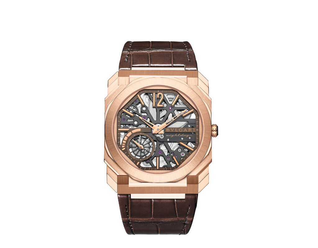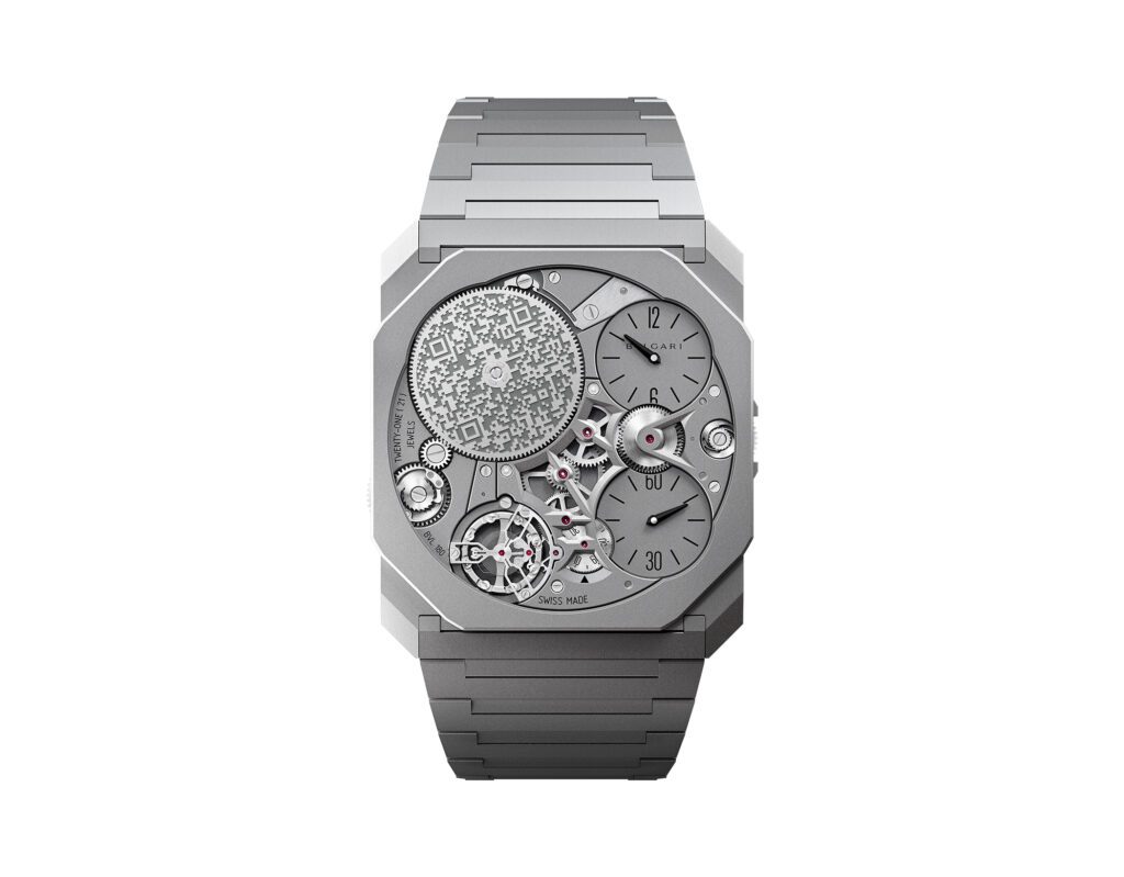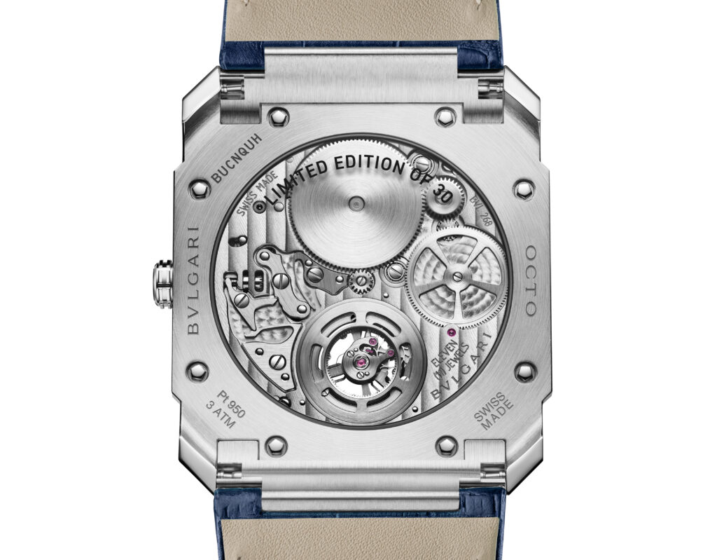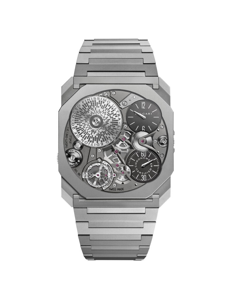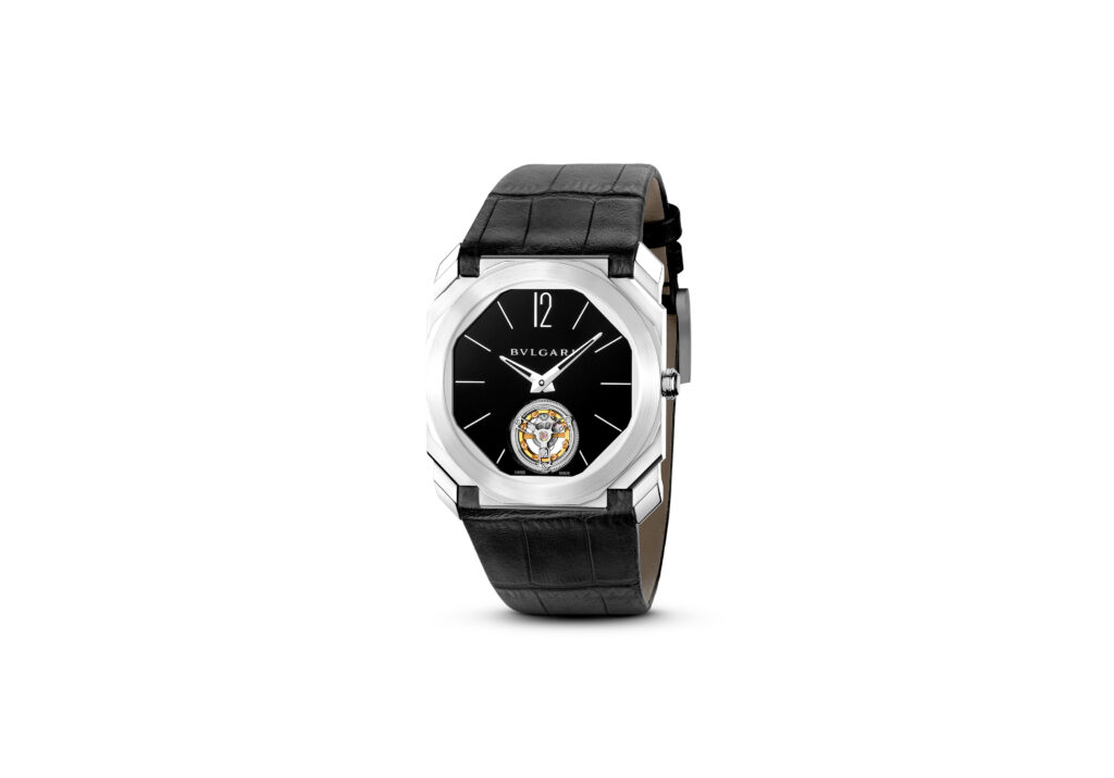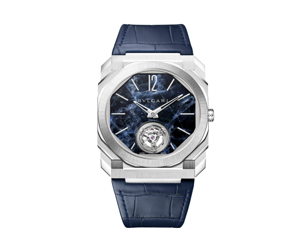 Autre prouesse : l’Octo Finissimo Tourbillon Marble, dont le cadran est taillé dans un marbre bleu rare des carrières italiennes. Avec seulement 4,85 mm d’épaisseur, ce modèle en platine limité à 30 exemplaires conjugue virtuosité technique et ancrage romain, alliant le calibre BVL 268 (réserve de 52 h) et une esthétique minérale unique.