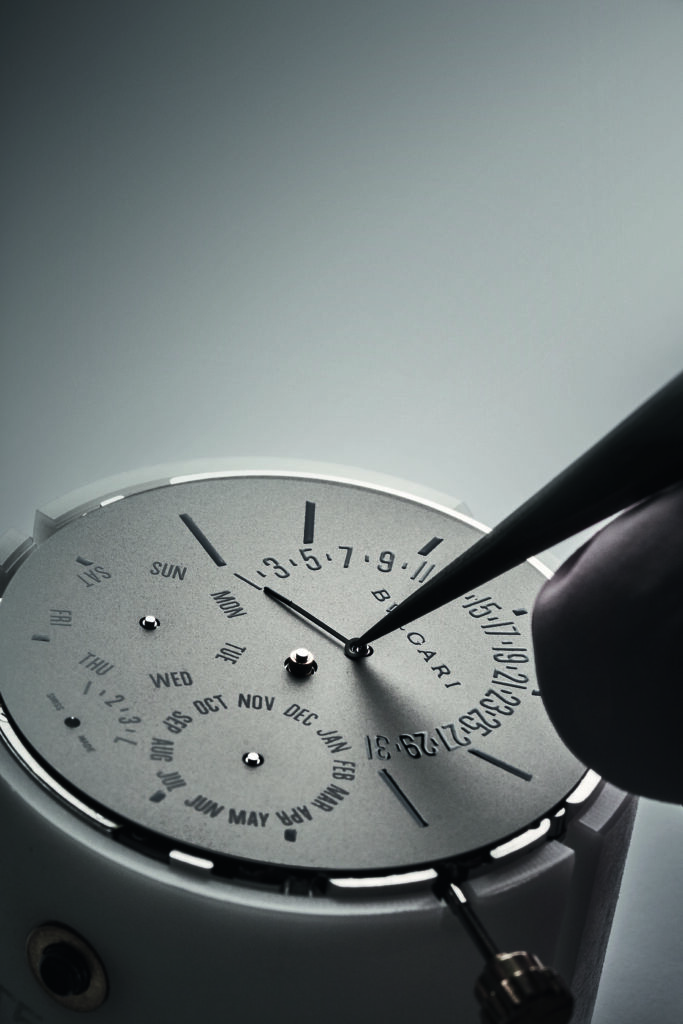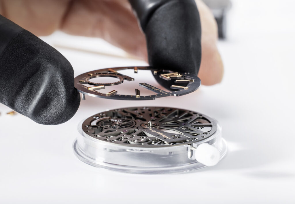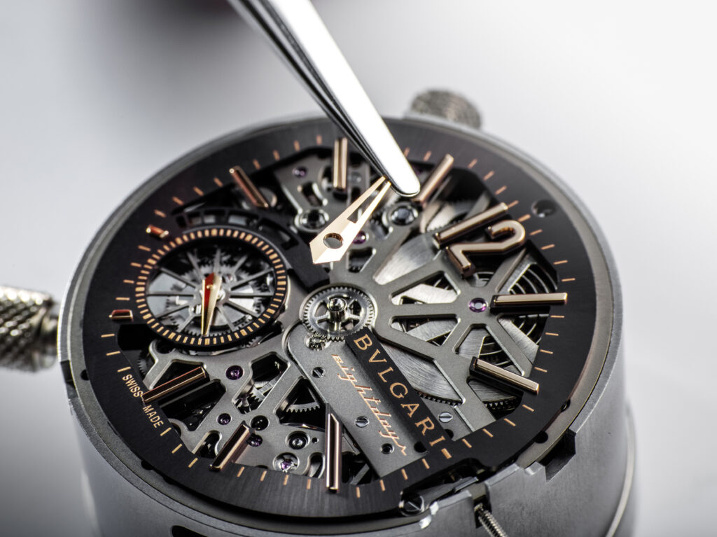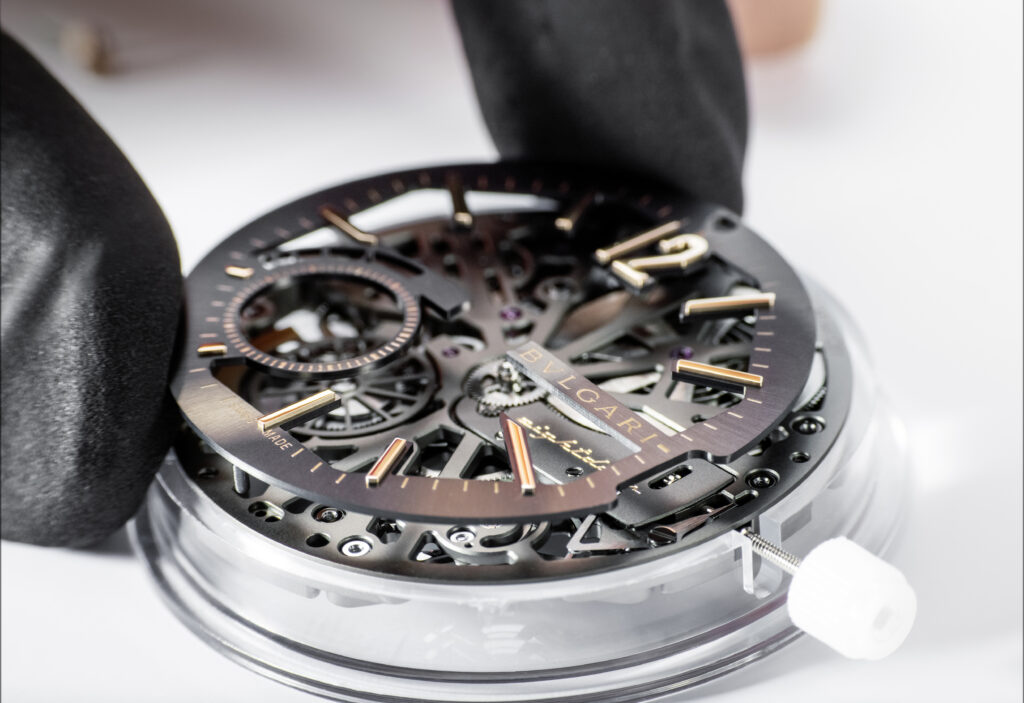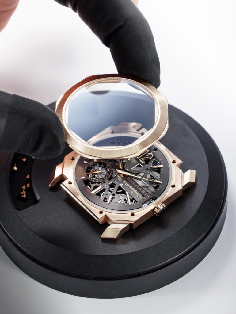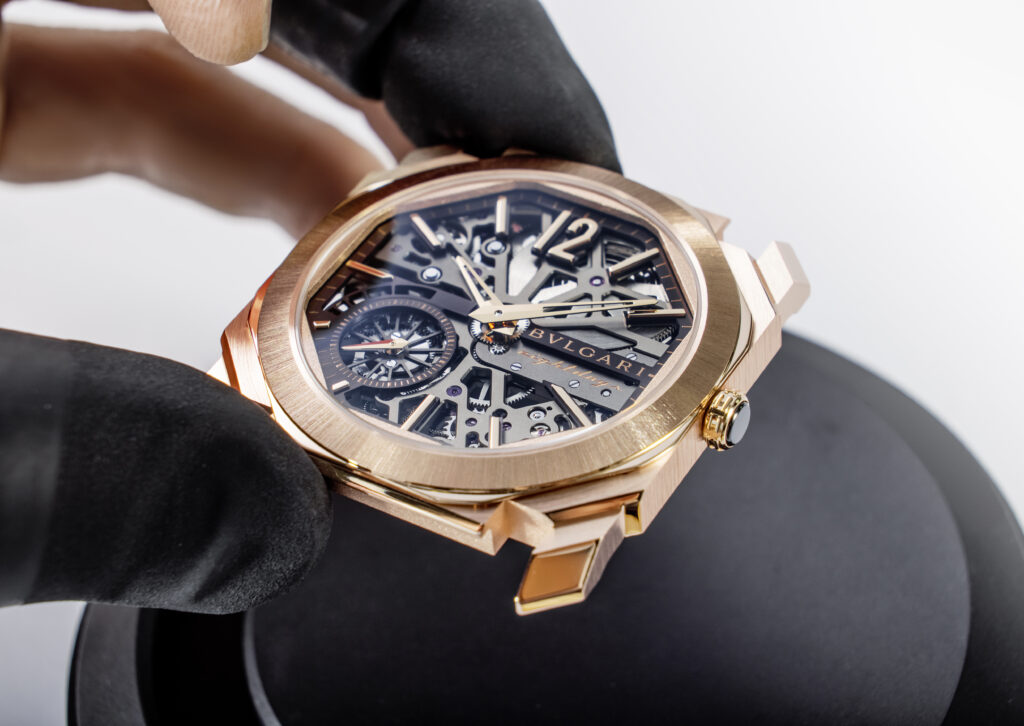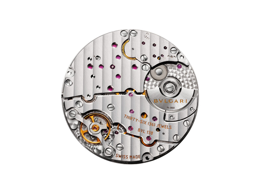 Autre prouesse : l’Octo Finissimo Tourbillon Marble, dont le cadran est taillé dans un marbre bleu rare des carrières italiennes. Avec seulement 4,85 mm d’épaisseur, ce modèle en platine limité à 30 exemplaires conjugue virtuosité technique et ancrage romain, alliant le calibre BVL 268 (réserve de 52 h) et une esthétique minérale unique.