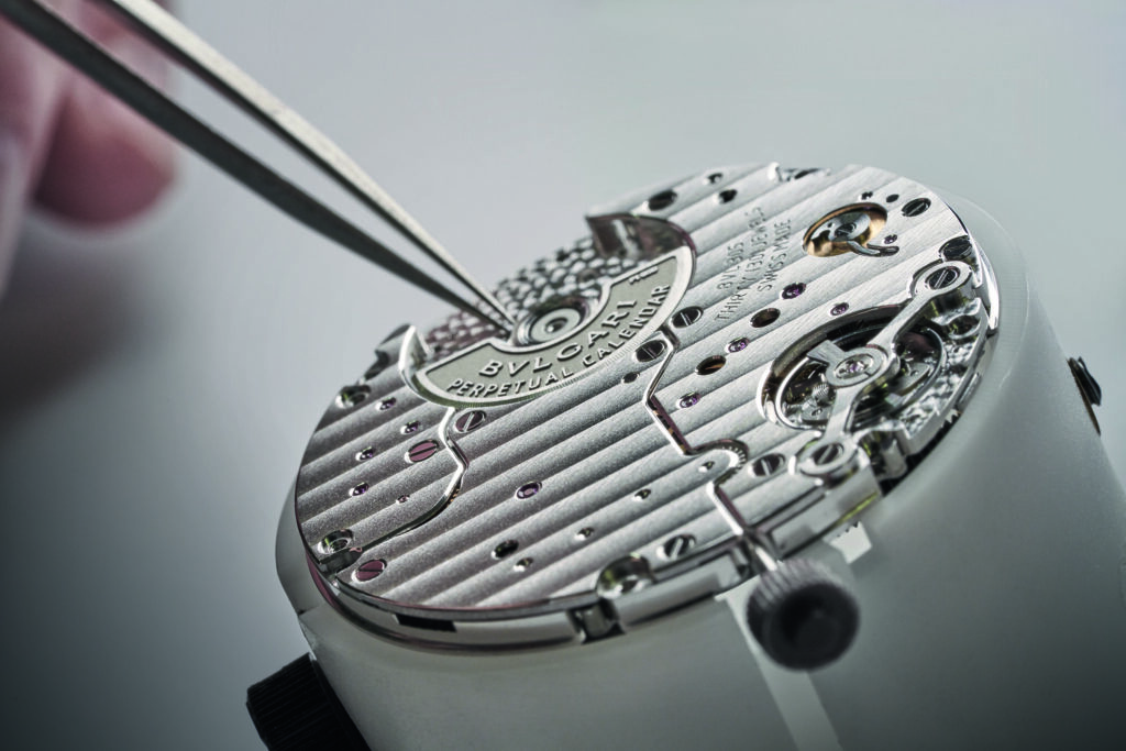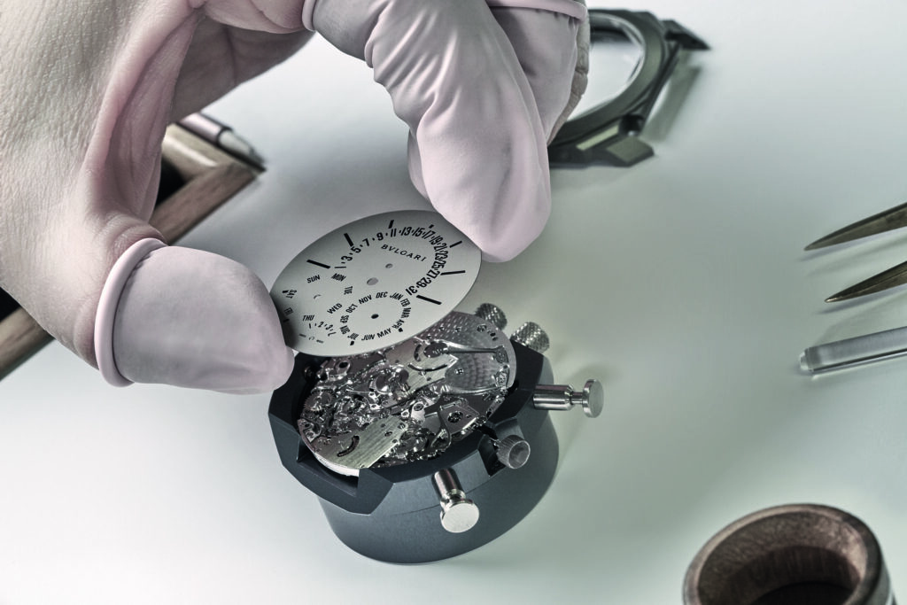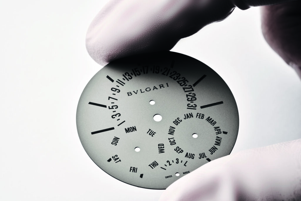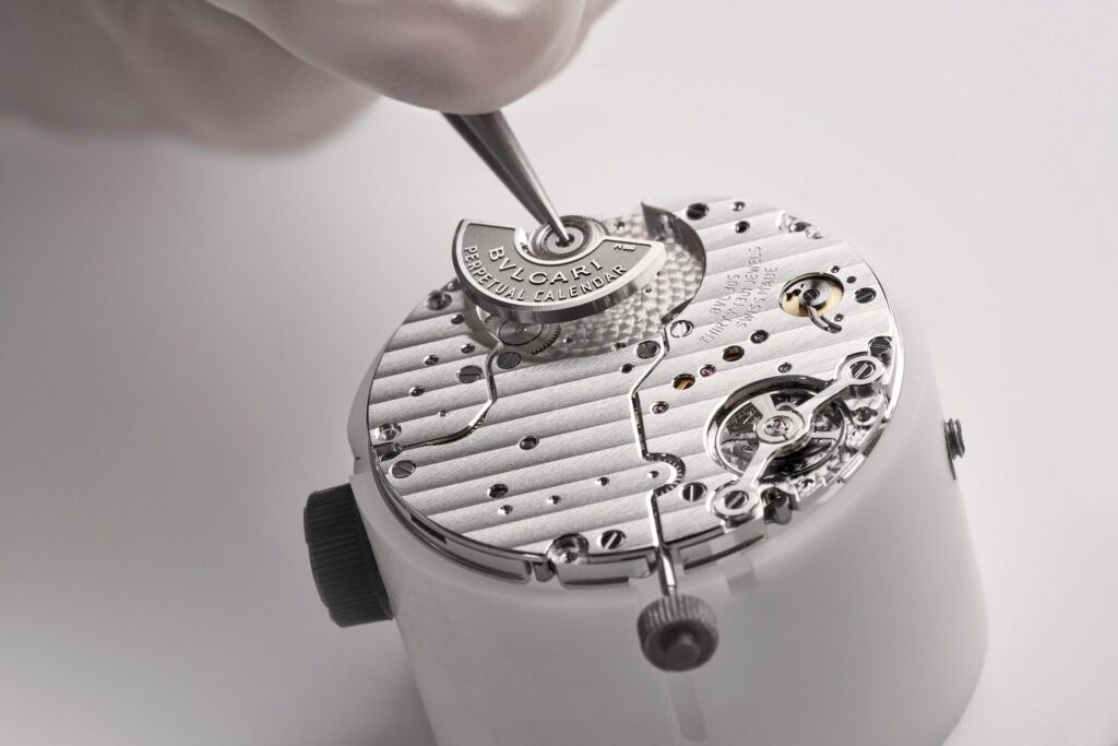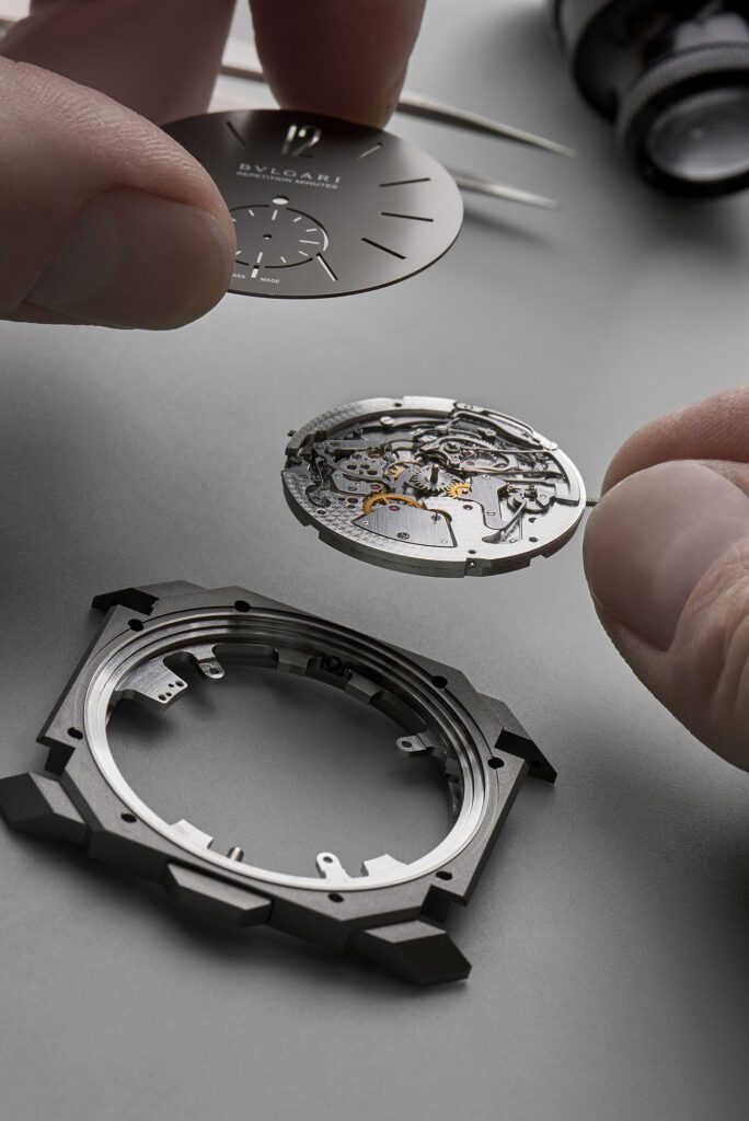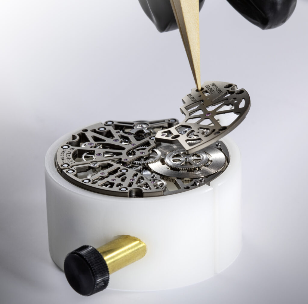Autre prouesse : l’Octo Finissimo Tourbillon Marble, dont le cadran est taillé dans un marbre bleu rare des carrières italiennes. Avec seulement 4,85 mm d’épaisseur, ce modèle en platine limité à 30 exemplaires conjugue virtuosité technique et ancrage romain, alliant le calibre BVL 268 (réserve de 52 h) et une esthétique minérale unique.