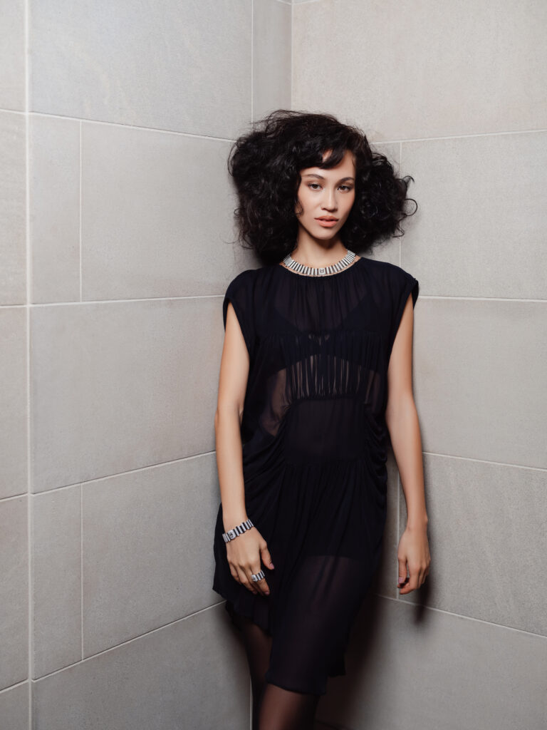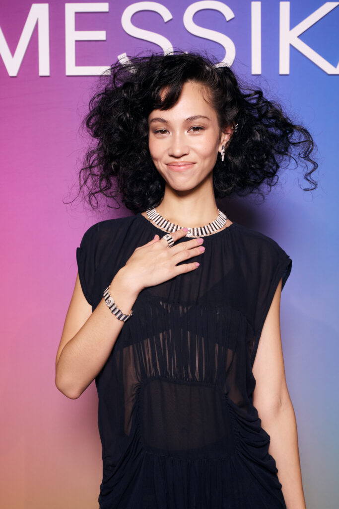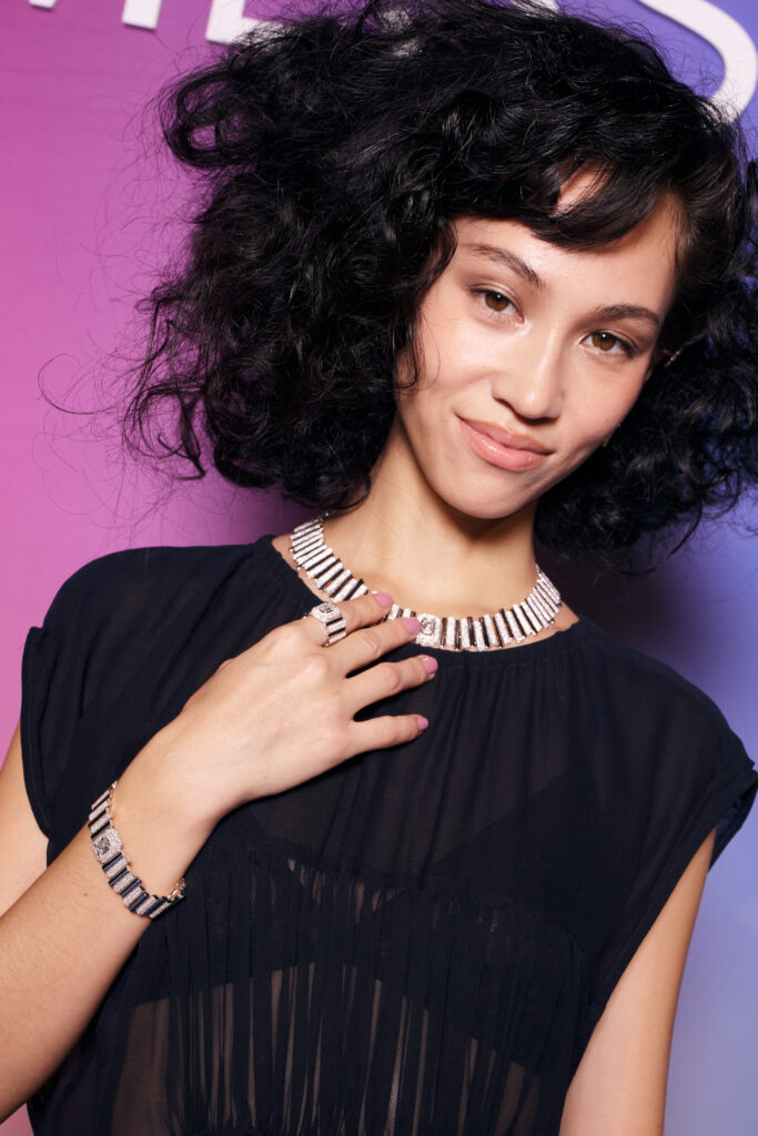 Ce dîner, imaginé par We Are ONA et signé par la cheffe Alexia Duchêne, a pris des allures de performance. Dans la salle, les modèles se faisaient serveuses, glissant entre les tables dans une chorégraphie subtile, révélant les parures de Haute Joaillerie Messika comme autant d’éclats vivants. Et au cœur de cette scénographie d’émotions : le set So Move Rainbow, manifeste coloré et symbole de la nouvelle ère américaine de la Maison.