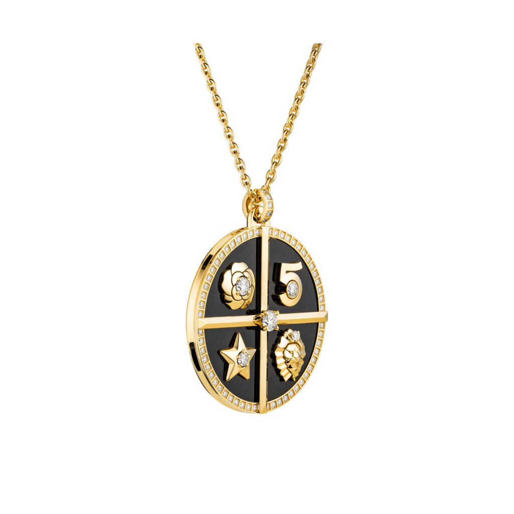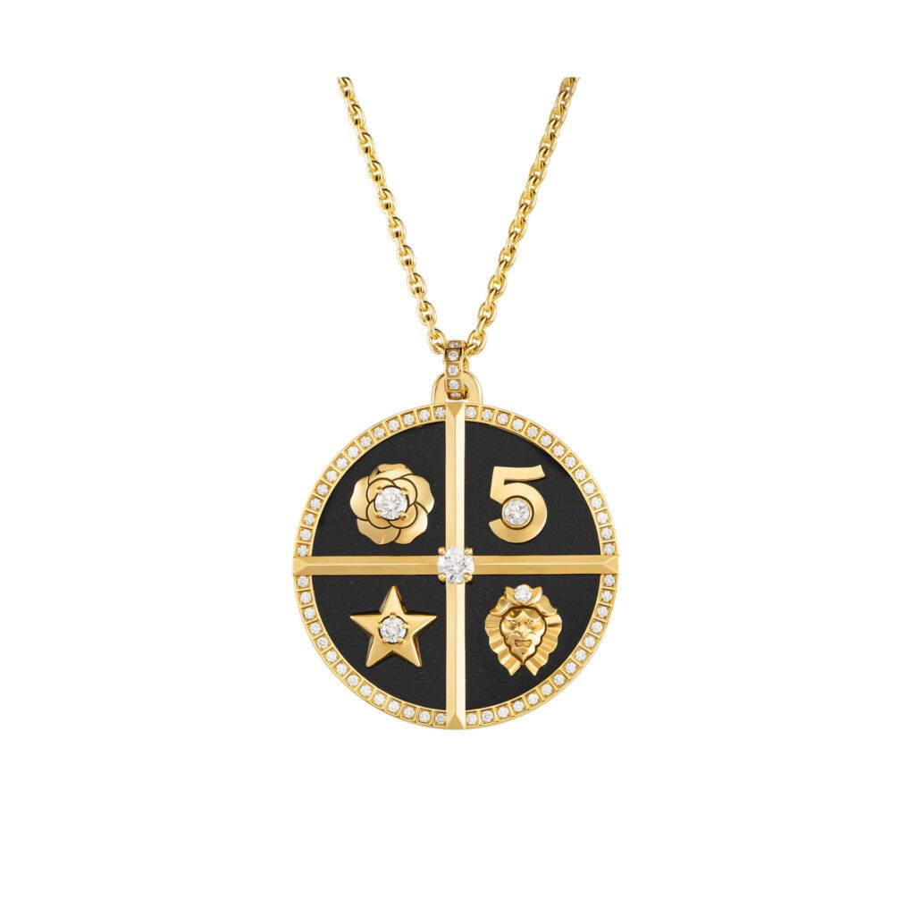 - La médaille SYMBOLES, en or jaune 18 carats et jade noir, s’orne de 74 diamants et d’un diamant central de 0,21 ct. Elle met en scène le lion, le camélia, la comète et le blé, tandis que son revers gravé au laser répète à l’infini le nom CHANEL, avec un diamant de 0,10 ct en son centre.
