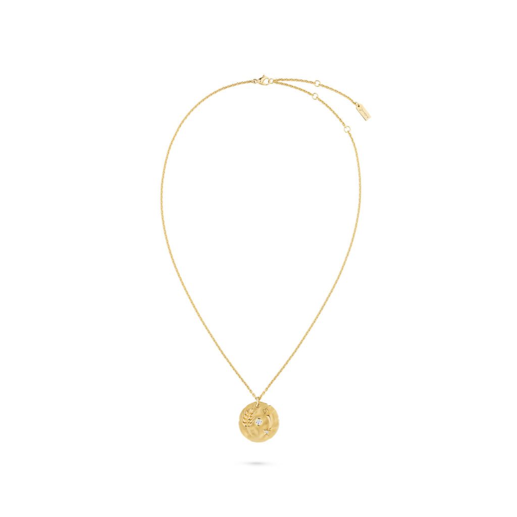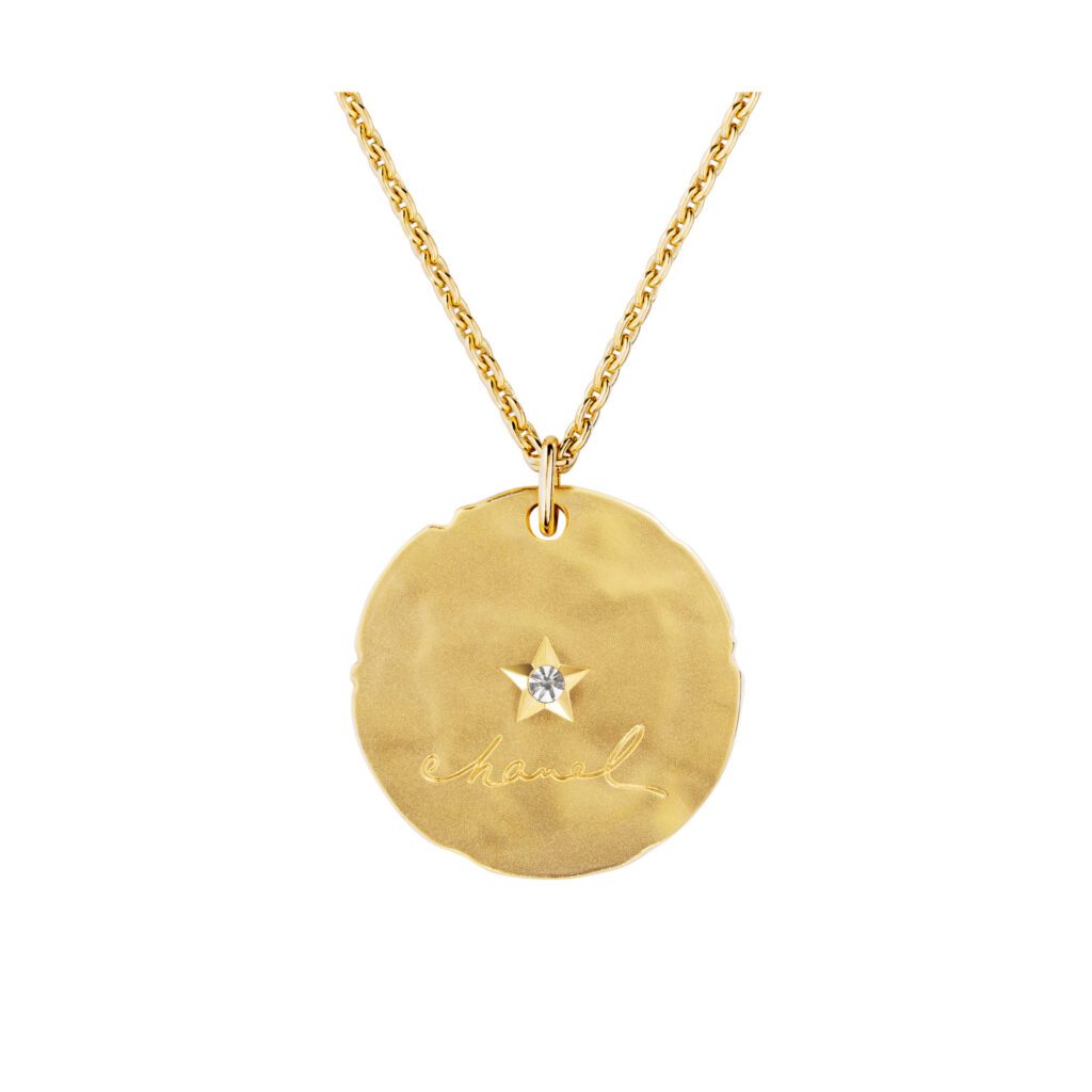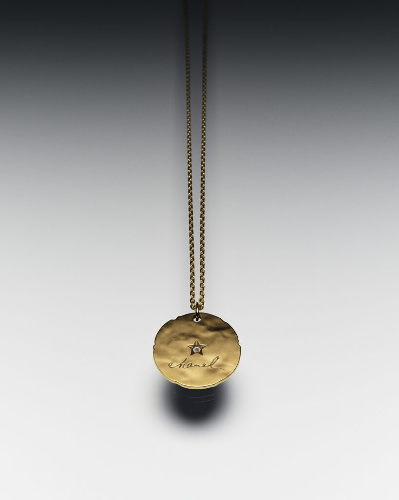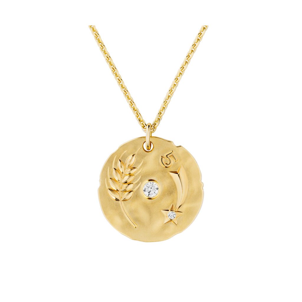 - La médaille TALISMANS, en or jaune 18 carats, joue de contrastes entre textures mates et brillantes. Elle réunit le blé, la comète et le chiffre 5, éclairés par deux diamants (0,15 ct). Ses bords irréguliers rappellent les pièces antiques, et son verso dévoile la signature manuscrite de Gabrielle Chanel, abritée sous une étoile pavée de diamants.
