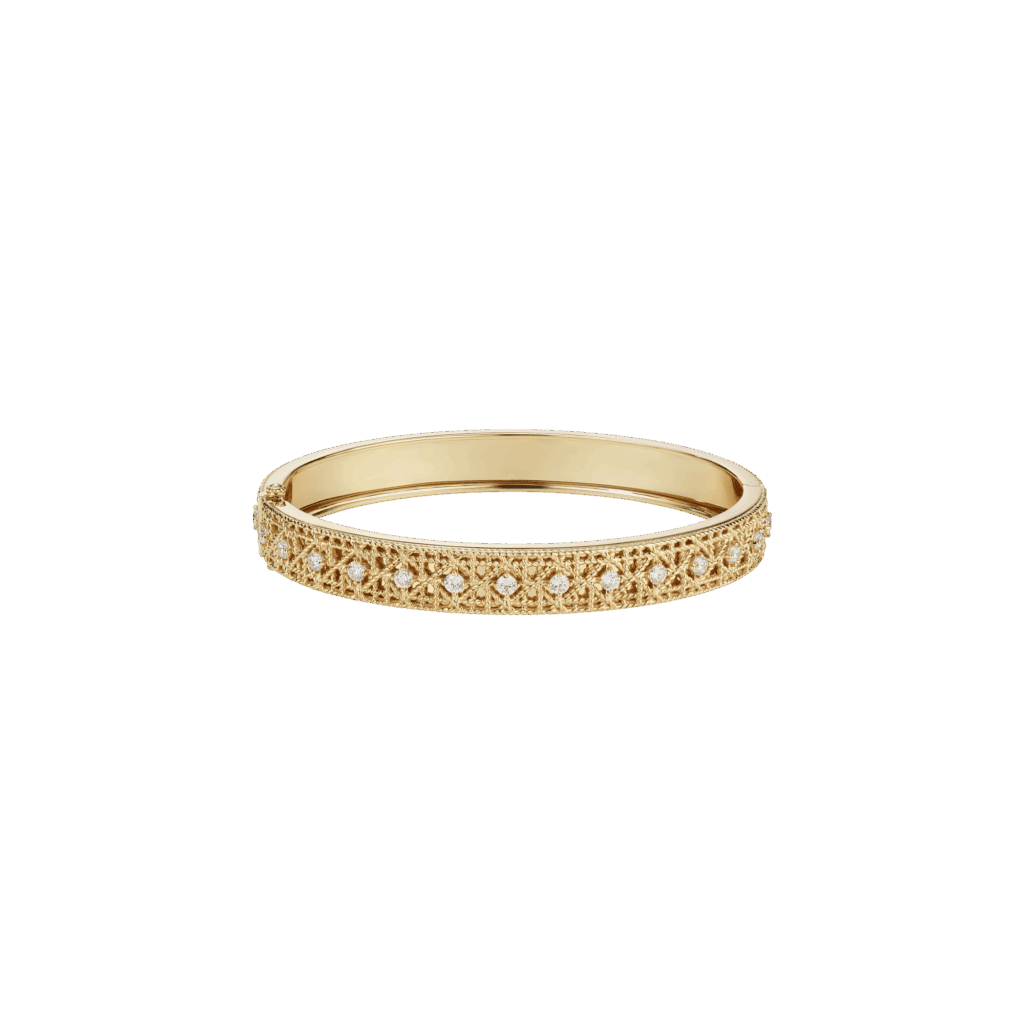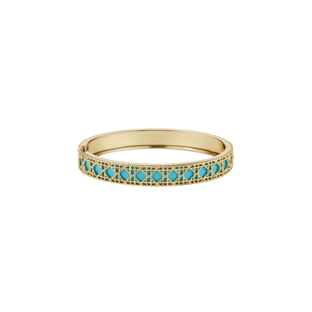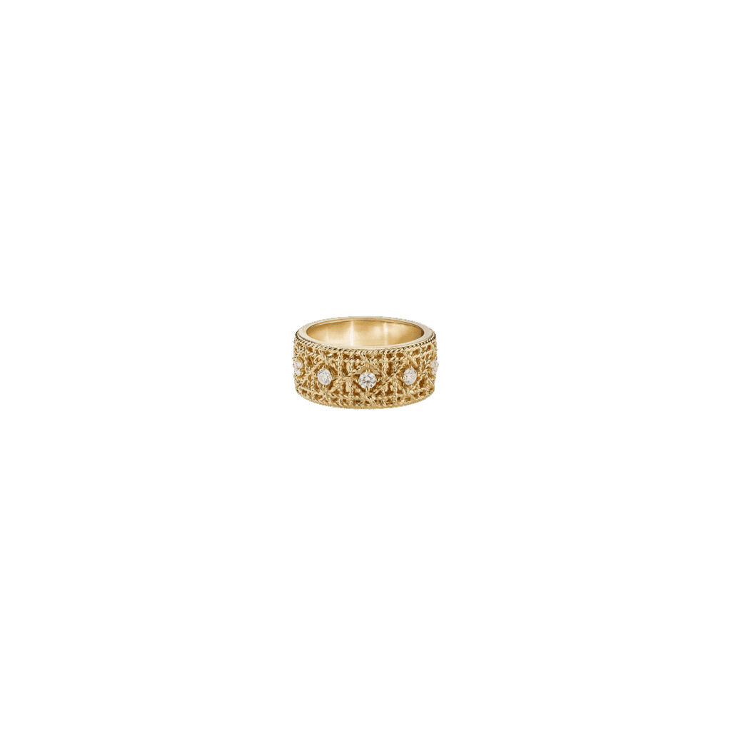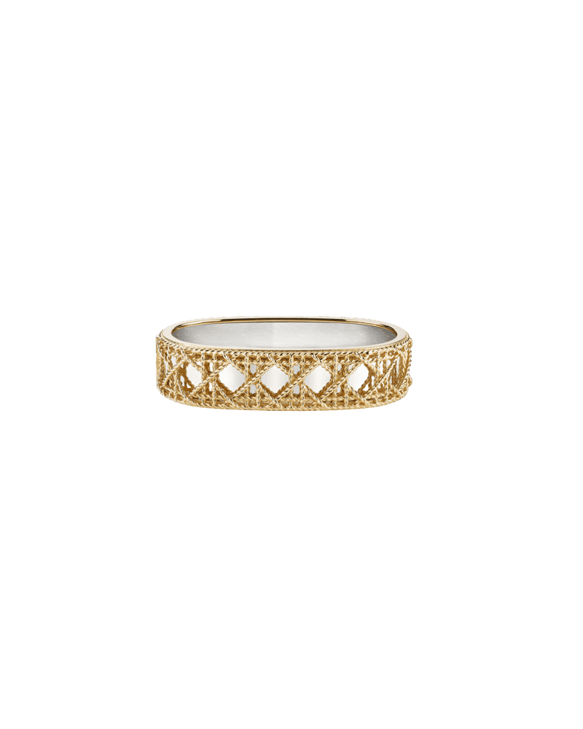 Découvert dans l’enfance par Castellane, ce graphisme signature est réinterprété en une maille d’or délicatement tressée, réalisée grâce à un savoir-faire d’exception. Chaque élément est assemblé à la main, étape après étape, révélant la virtuosité artisanale de la maison. Parmi ces gestes minutieux, un ruban d’or poli glissé sous le cannage agit comme un miroir, jouant avec la lumière et amplifiant l’éclat du motif.
