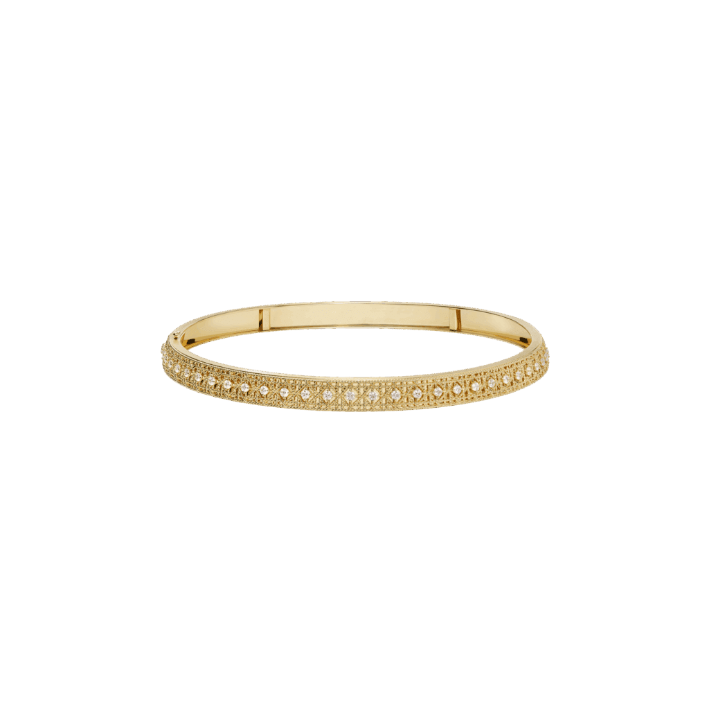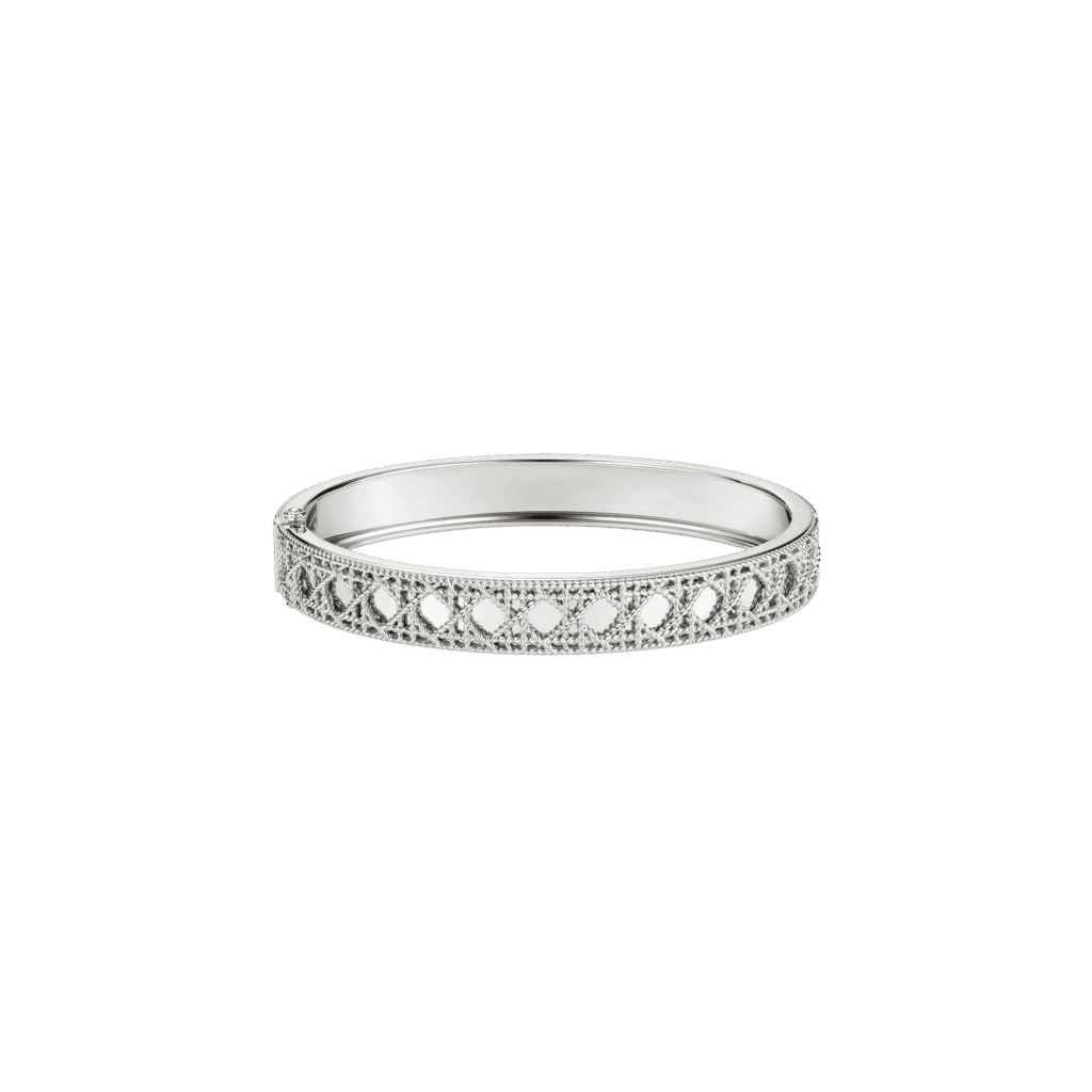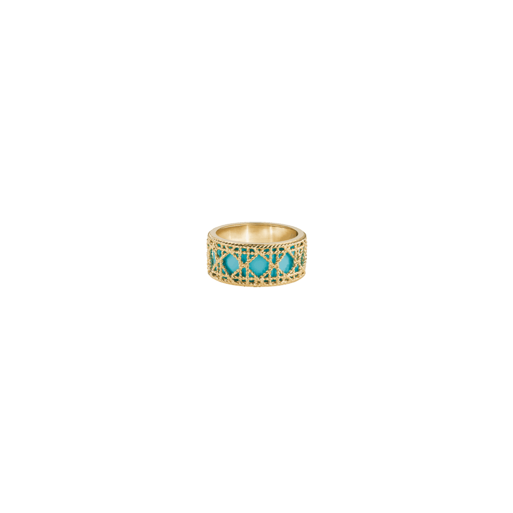 Découvert dans l’enfance par Castellane, ce graphisme signature est réinterprété en une maille d’or délicatement tressée, réalisée grâce à un savoir-faire d’exception. Chaque élément est assemblé à la main, étape après étape, révélant la virtuosité artisanale de la maison. Parmi ces gestes minutieux, un ruban d’or poli glissé sous le cannage agit comme un miroir, jouant avec la lumière et amplifiant l’éclat du motif.